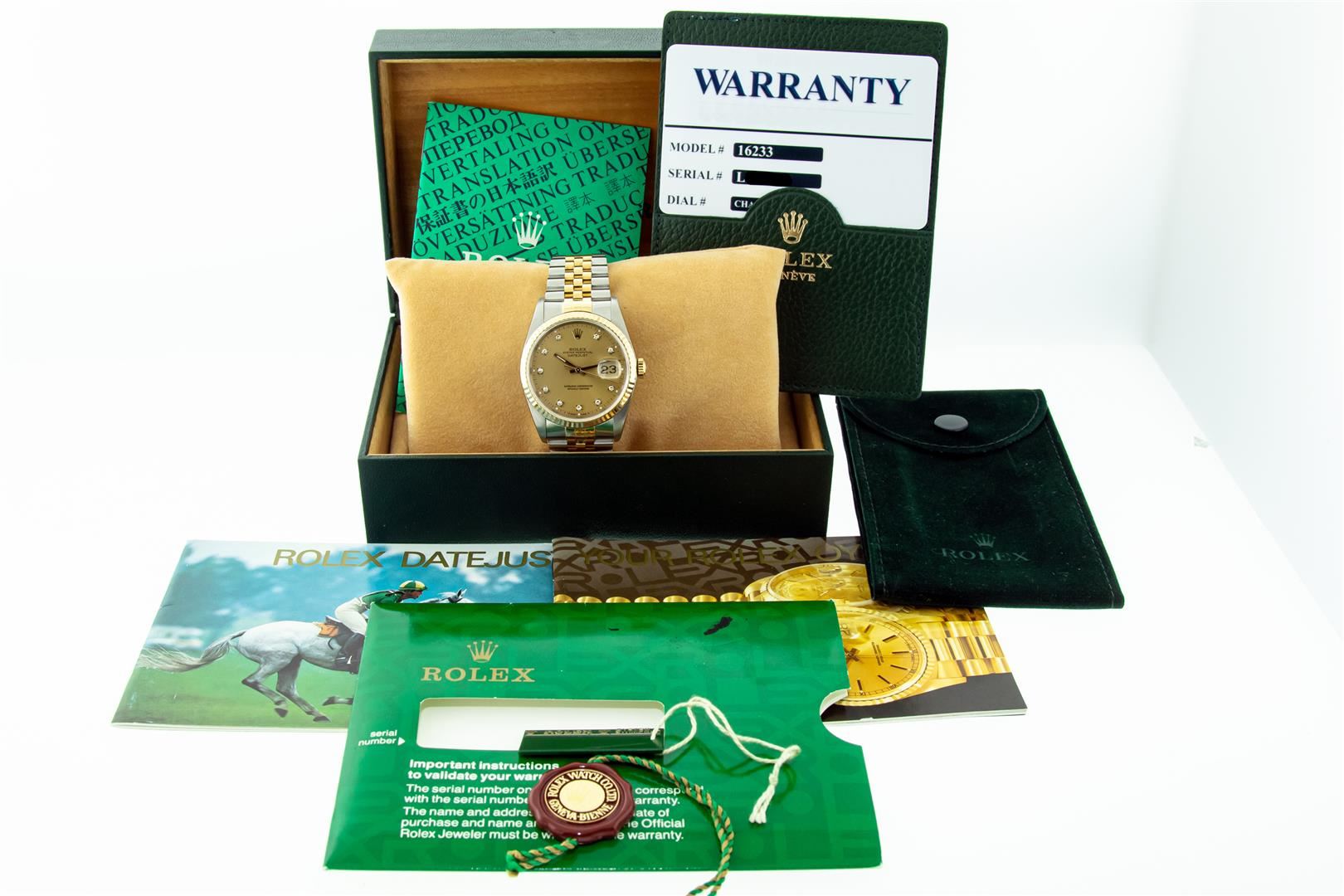 One Mens 18K Yellow Gold & Stainless Steel Two Tone Rolex Oyster Perpetual Datejust Polished, Serviced & Electronically Tested, 18K Yellow Gold & Stainless Steel Case: 36mm, Original 18K Yellow Gold Crown, Bezel: Original Rolex 18K Yellow Gold Fluted Bezel. Custom Crystal: New Scratch Resistant Sappphire Crystal Lens. Hands: Genuine Rolex Luminecent Hands. Movement: Automatic Winding Movement 3135. Dial: Original Rolex Factory Champagne Dial with Diamond Hour Markers Dash Track & Lumi Dots, Diamond Count: 10 Diamonds in Dial, Clarity:VVS Date Window: 3 O'Clock Position Date Display, Quickset, Model: Sapphire Datejust 16233, Condition: G-6 Extra Fine. Bracelet: Tight Two Tone 18K Yellow Gold & Stainless Steel Jubilee Showing Little To No Stretch. Bright Polish. 7.0 Inch Length, Adjustable. Standard Clasp, With Rolex Logo. This Watch Has Been Serviced And Polished It Is Free Of All Scratches And Dents. This Watch Comes With The Following Accessories: Rolex Box, Rolex Booklets, Rolex Tag, Rolex Wallet and Rolex Carry Pouch.