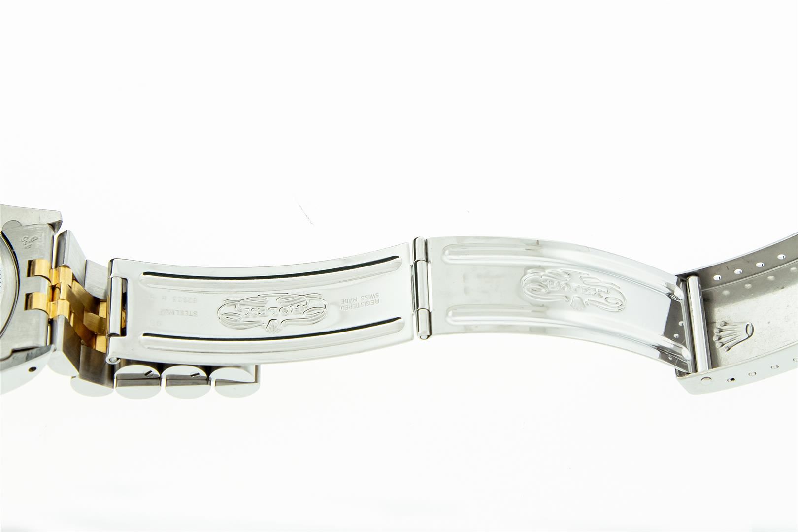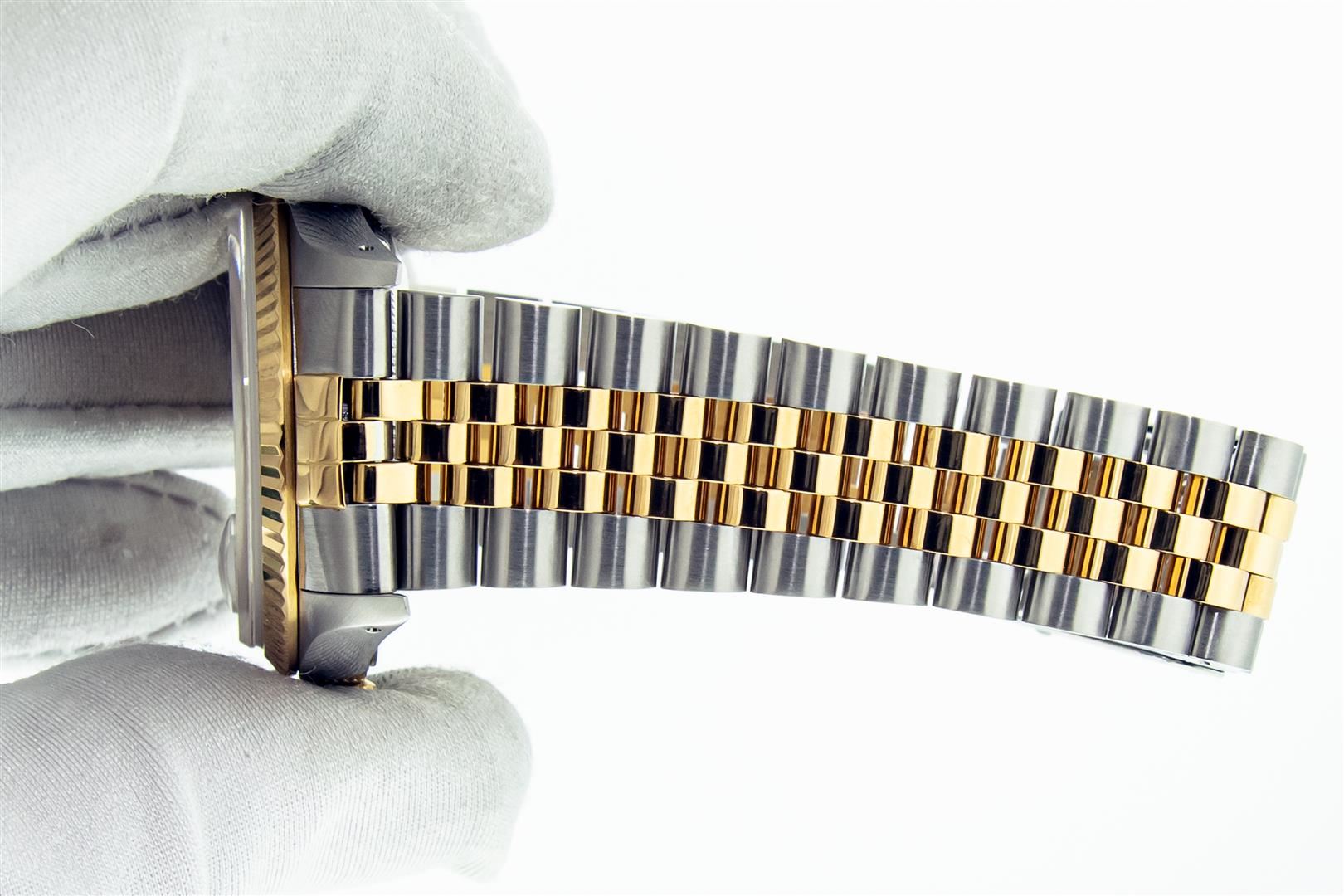 One Mens 18K Yellow Gold & Stainless Steel Two Tone Rolex Oyster Perpetual Datejust Polished, Serviced & Electronically Tested, 18K Yellow Gold & Stainless Steel Case: 36mm, Original 18K Yellow Gold Crown, Bezel: Original Rolex 18K Yellow Gold Fluted Bezel. Custom Crystal: New Scratch Resistant Sappphire Crystal Lens. Hands: Genuine Rolex Luminecent Hands. Movement: Automatic Winding Movement 3135. Dial: Original Rolex Factory Champagne Dial with Diamond Hour Markers Dash Track & Lumi Dots, Diamond Count: 10 Diamonds in Dial, Clarity:VVS Date Window: 3 O'Clock Position Date Display, Quickset, Model: Sapphire Datejust 16233, Condition: G-6 Extra Fine. Bracelet: Tight Two Tone 18K Yellow Gold & Stainless Steel Jubilee Showing Little To No Stretch. Bright Polish. 7.0 Inch Length, Adjustable. Standard Clasp, With Rolex Logo. This Watch Has Been Serviced And Polished It Is Free Of All Scratches And Dents. This Watch Comes With The Following Accessories: Rolex Box, Rolex Booklets, Rolex Tag, Rolex Wallet and Rolex Carry Pouch.