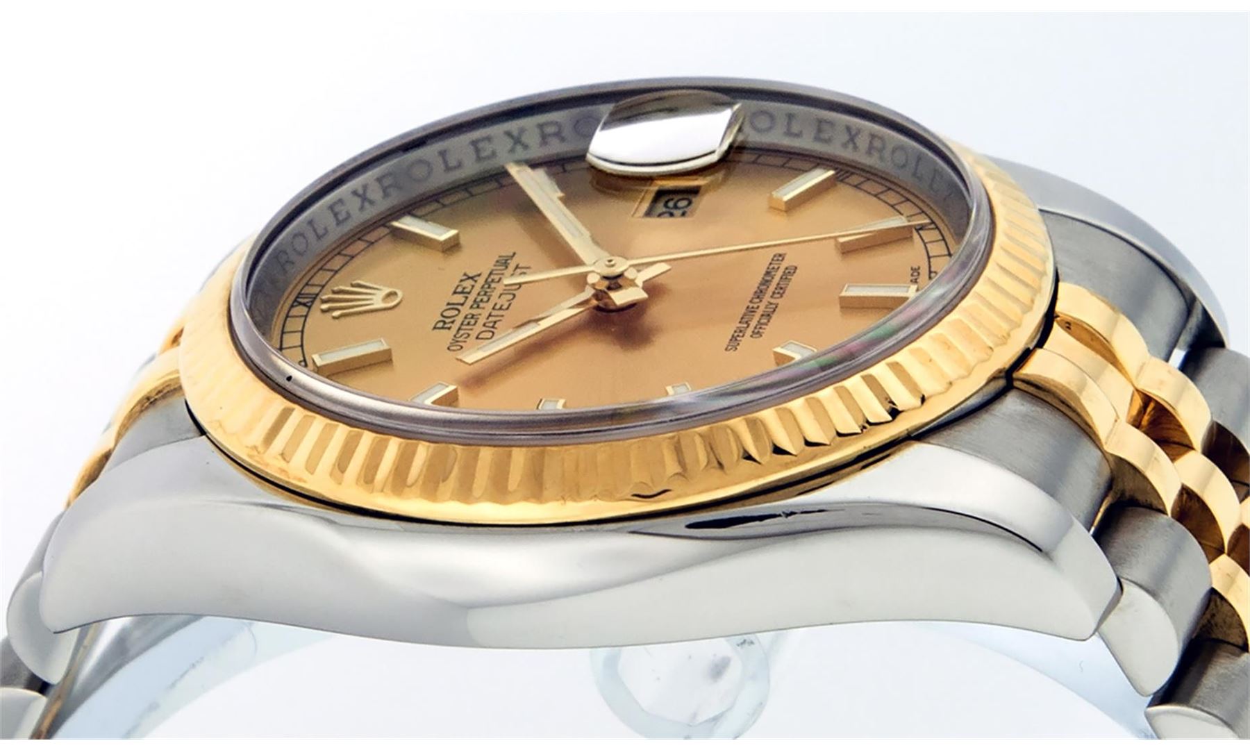 One Mens Rolex Two Tone 18K Yellow Gold And Stainless Steel Datejust, Polished Bright with Satin Finish, Serviced & Electronically Tested, Stainless Steel Case: 36mm, Rolex Yellow Gold Crown, Rolex Bezel: 18K Yellow Gold Fluted Bezel. Crystal: Sapphire With Cyclops Lens. Rolex Movement: Automatic Winding Movement Caliber 3135. Rolex Dial: Champagne Index With Square Roman Track. Date Window: 3 O'Clock Position Date Display, Quickset, Model: Quickset Datejust 116233. Condition: G-6 Extra Fine. Rolex Bracelet: 18K Yellow Gold And Stainless Steel Jubilee Band. Bright Polish & Satin Finish. 7.0 Inch Length, Adjustable. Standard Clasp, With Rolex Logo. This Pre Owned Watch Has Been Serviced Time Tested And Is In Excellent Condition It Is Free Of All Scratches And Dents.
