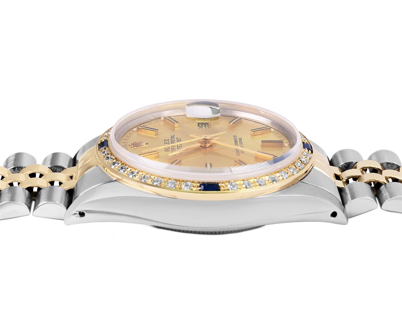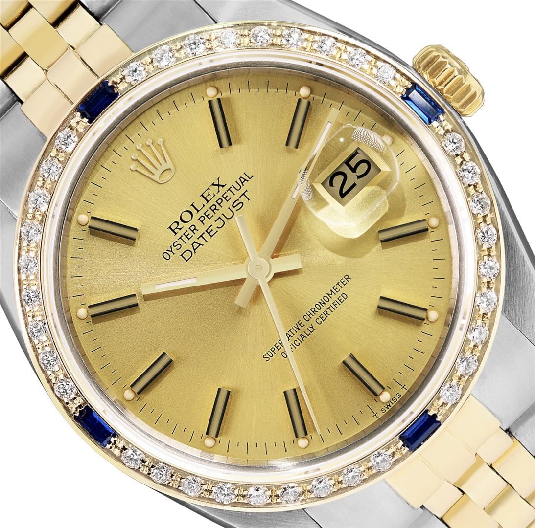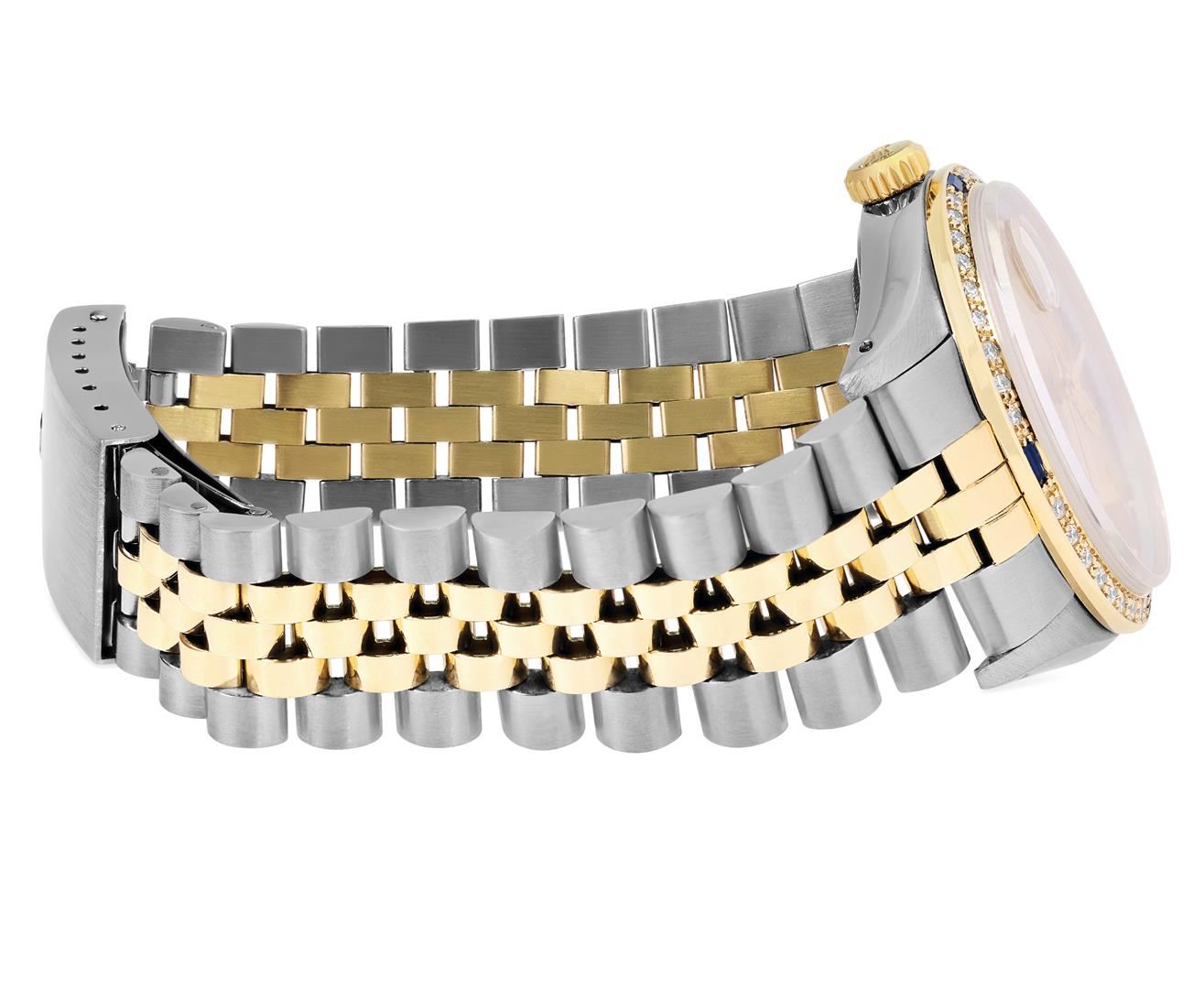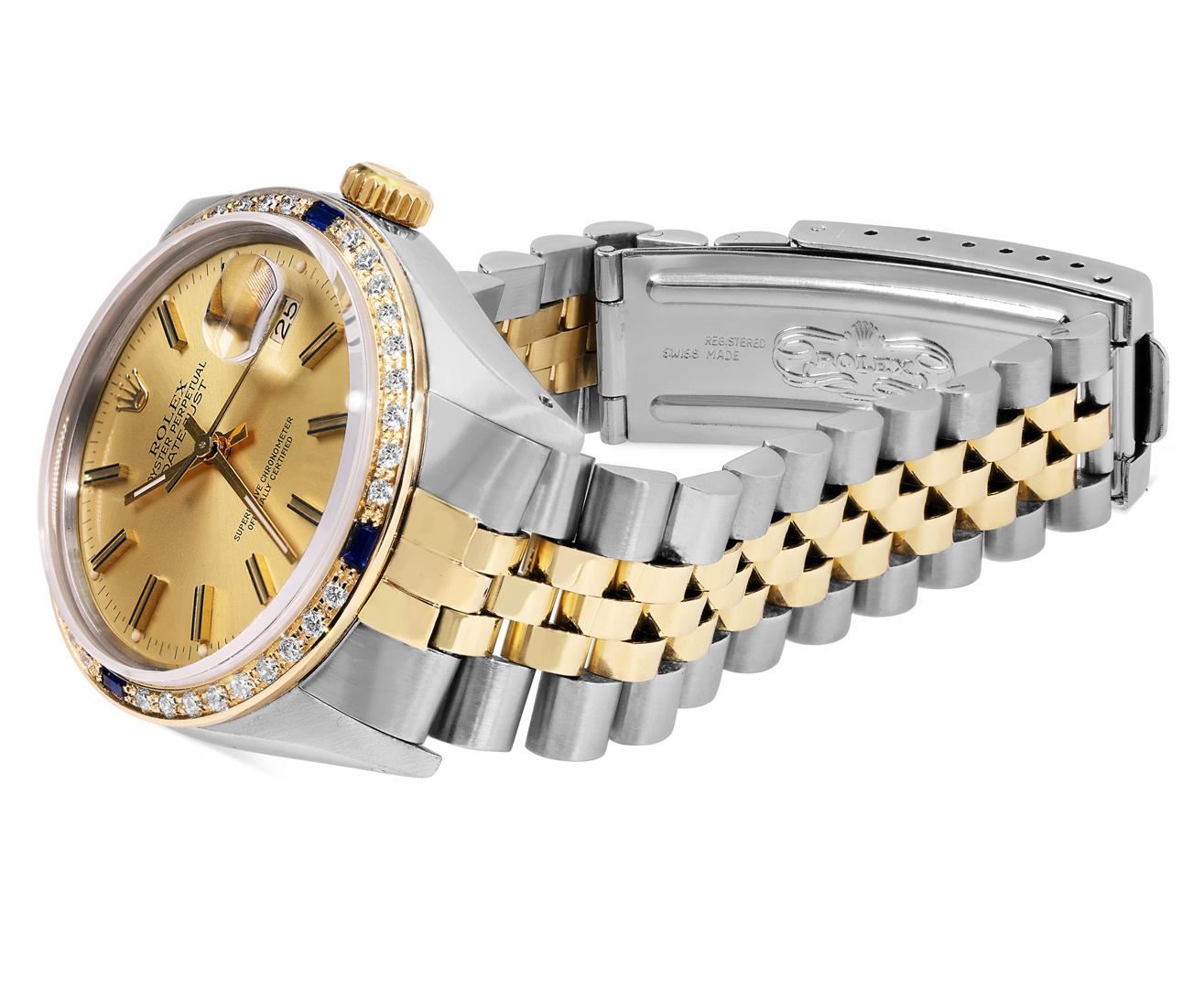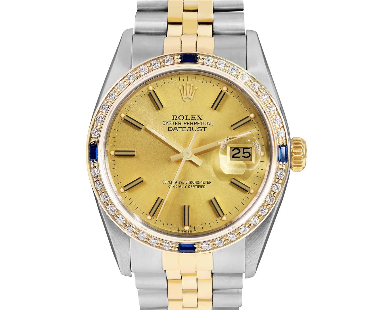 One Mens Pre Owned Two Tone Yellow Gold & Stainless Steel Rolex Datejust Polished, Serviced & Electronically Tested, Yellow Gold & Stainless Steel Case: 36mm, Rolex Yellow Gold Crown, Custom Bezel: New 18K Yellow Gold Sapphire Beadset Diamond Bezel, Diamond Count: 36 Diamonds + 4 Sapphires, Clarity: SI-VS, Color: G to H. Custom Crystal: New Sapphire With Magnified Date Window. Custom Hands: New Lumi Hands. Rolex Movement: Automatic Winding Movement 3035. Rolex Factory Dial: Champagne Index Dial With Dash Track & Lumi Dots. Date Window: 3 O'Clock Position Date Display, Quickset, Model: Quickset Datejust. Condition: G-6 Extra Fine. Rolex Bracelet: Two Tone Yellow Gold & Stainless Steel Jubilee Band. Bright Polish. 7.0 Inch Length, Adjustable. Fold Clasp, With Rolex Logo. This Watch Has Been Serviced Time Tested And Is In Excellent Condition It Is Free Of All Scratches And Dents. This Watch Comes With A Rolex Box.