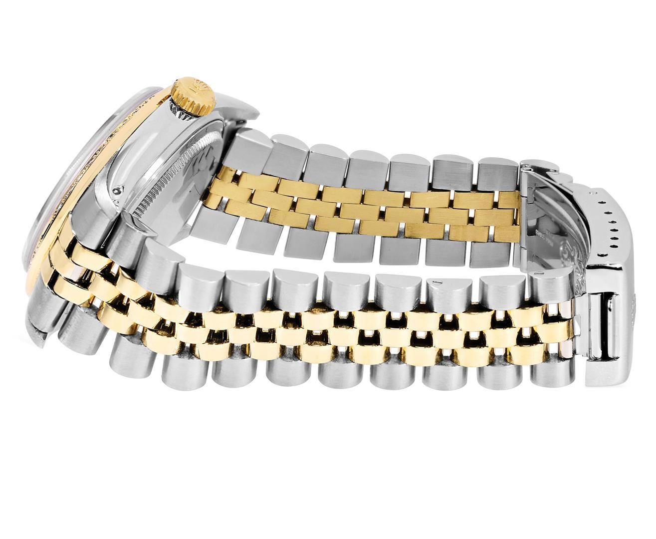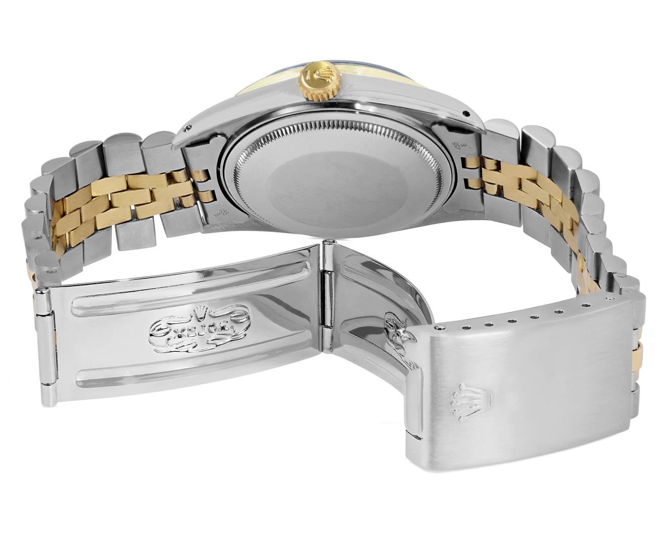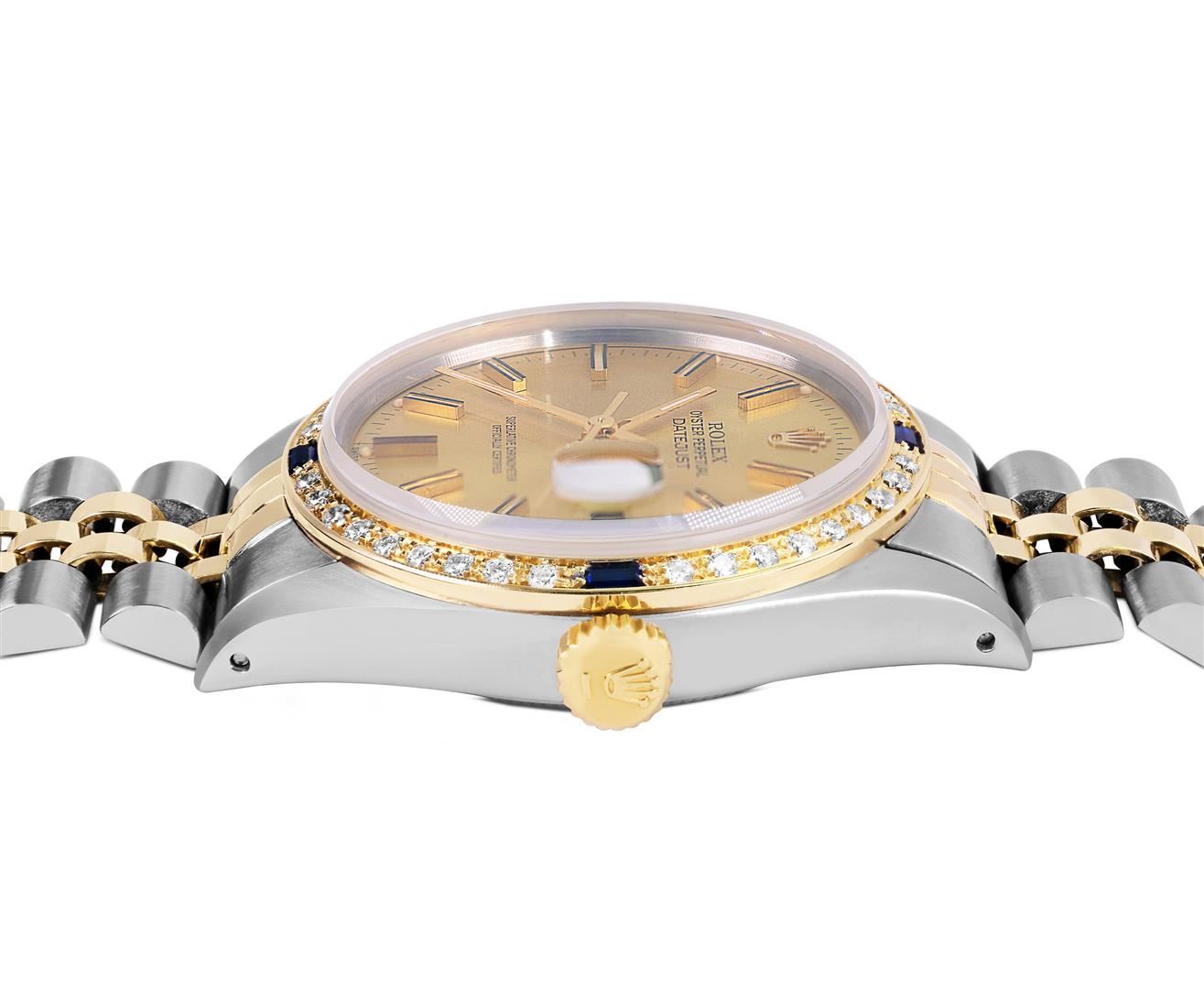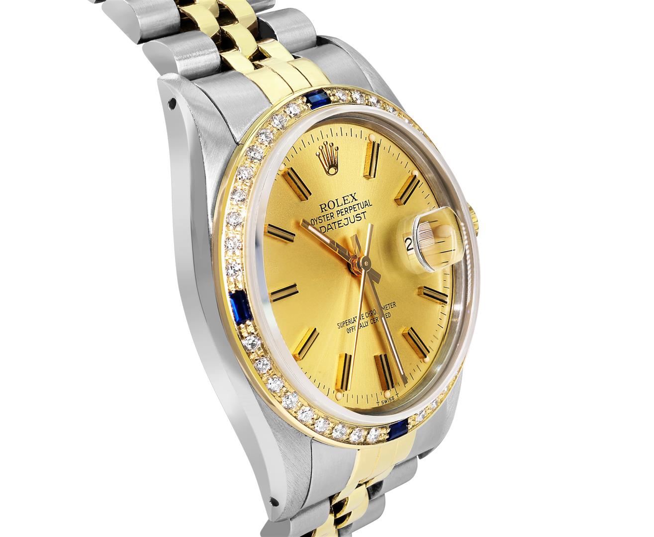 One Mens Pre Owned Two Tone Yellow Gold & Stainless Steel Rolex Datejust Polished, Serviced & Electronically Tested, Yellow Gold & Stainless Steel Case: 36mm, Rolex Yellow Gold Crown, Custom Bezel: New 18K Yellow Gold Sapphire Beadset Diamond Bezel, Diamond Count: 36 Diamonds + 4 Sapphires, Clarity: SI-VS, Color: G to H. Custom Crystal: New Sapphire With Magnified Date Window. Custom Hands: New Lumi Hands. Rolex Movement: Automatic Winding Movement 3035. Rolex Factory Dial: Champagne Index Dial With Dash Track & Lumi Dots. Date Window: 3 O'Clock Position Date Display, Quickset, Model: Quickset Datejust. Condition: G-6 Extra Fine. Rolex Bracelet: Two Tone Yellow Gold & Stainless Steel Jubilee Band. Bright Polish. 7.0 Inch Length, Adjustable. Fold Clasp, With Rolex Logo. This Watch Has Been Serviced Time Tested And Is In Excellent Condition It Is Free Of All Scratches And Dents. This Watch Comes With A Rolex Box.