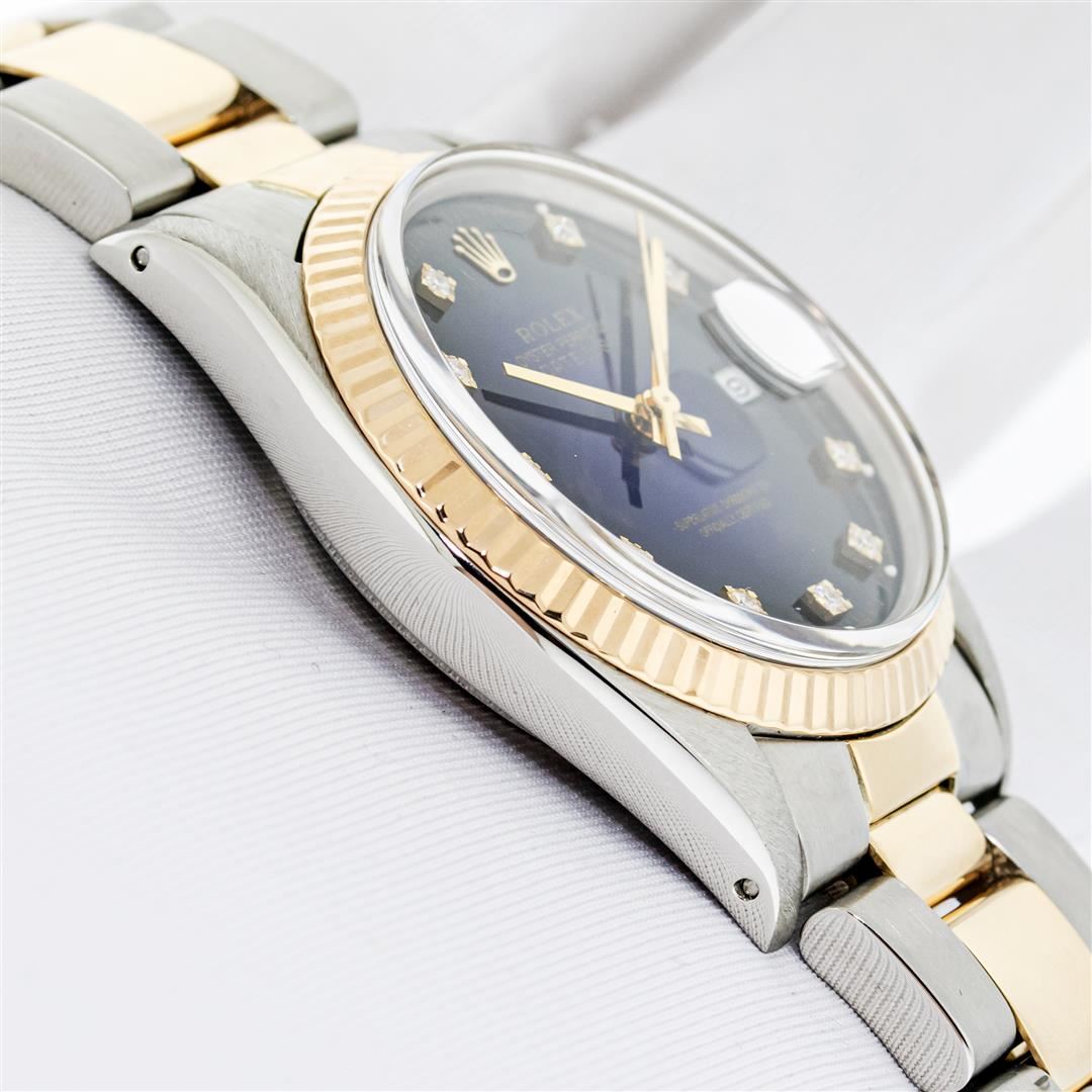 One Mens Pre Owned Yellow Gold And Stainless Steel Two Tone Rolex Datejust Polished, Serviced & Electronically Tested, Rolex Yellow Gold & Stainless Steel Case: 36mm, Rolex Yellow Gold Crown, Rolex Bezel: Yellow Gold Fluted Bezel. Custom Crystal: New Plastic With Magnified Date Window. Custom Hands: New Solid Hands. Rolex Movement: Automatic Winding Movement 3035. Custom Dial: Custom Blue Vignette Dial With Aftermarket Added Diamonds, Diamond Count: 10 Diamonds On Dial, Color: G to H. Date Window: 3 O'Clock Position Date Display, Quickset, Model: Datejust. Condition: G-6 Extra Fine. Rolex Bracelet: Two Tone Yellow Gold & Stainless Steel Oyster Band. Bright Polish. 7.0 Inch Length, Adjustable. Standard Clasp, With Rolex Logo. This Watch Has Been Serviced Time Tested And Is In Excellent Condition It Is Free Of All Scratches And Dents.