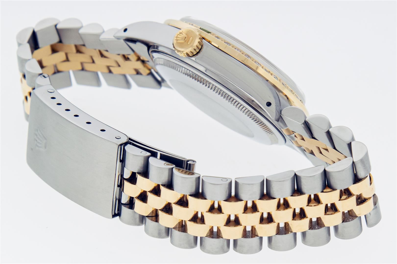 One Mens Pre owned Two Tone Yellow Gold & Stainless Steel Rolex Datejust Polished, Serviced & Electronically Tested, Yellow Gold & Stainless Steel Case: 36mm, Rolex Yellow Gold Crown, Custom Bezel: New 18K Yellow Gold Emerald Beadset Diamond Bezel, Diamond Count: 36 Diamonds + 4 Emeralds, Clarity: SI-VS, Color: G to H. Custom Crystal: New Sapphire With Magnified Date Window. Custom Hands: New Hands. Rolex Movement: Automatic Winding Movement. Rolex Factory Dial: Champagne Dial With Diamond Hour Markers. Diamond Count: 10 Diamonds In Dial. Date Window: 3 O'Clock Position Date Display, Quickset, Model: Datejust. Condition: G-6 Extra Fine. Rolex Bracelet: Two Tone Yellow Gold & Stainless Steel Jubilee Band. Bright Polish. 7.0 Inch Length, Adjustable. Standard Clasp, With Rolex Logo. This Pre Owned Watch Has Been Serviced Time Tested And Is In Excellent Condition It Is Free Of All Scratches And Dents.