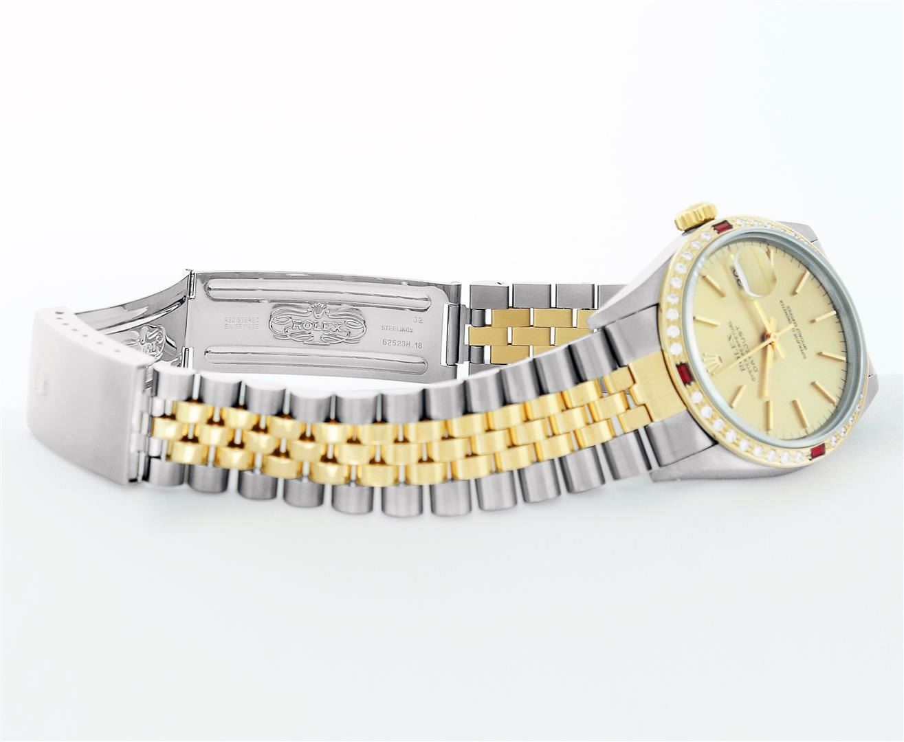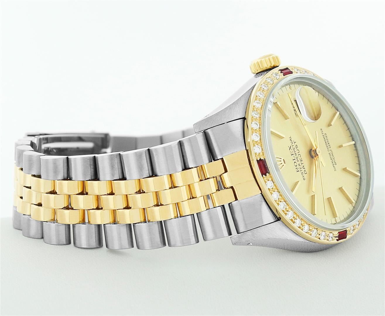 One Mens Rolex Quickset Pre Owned Two Tone 14K Yellow Gold And Stainless Steel Datejust Polished, Serviced & Electronically Tested, Rolex Yellow Gold & Stainless Steel Case: 36mm, Rolex 14K Yellow Gold Crown, Custom Bezel: New 18K Yellow Diamond + Ruby Beadset Bezel, Stone Count: 36 Diamonds + 4 Rubies, Total Weight .75 Carat, Clarity: SI-VS, Color: G to H. Custom Crystal: New Sapphire With Magnified Date Window. Custom Hands: New Luminecent Hands. Rolex Movement: Automatic Winding Movement 3035. Rolex Dial: Champagne Dial With Index Hour Markers Dash Track And Lumi Dots. Date Window: 3 O'Clock Position Date Display, Quickset, Model: Datejust. Condition: G-6 Extra Fine. Rolex Bracelet: Two Tone 14K Yellow Gold & Stainless Steel Jubilee Band. Bright Polish. 7.0 Inch Length, Adjustable. Standard Clasp, With Rolex Logo. This Watch Has Been Serviced Time Tested And Is In Excellent Condition It Is Free Of All Scratches And Dents.