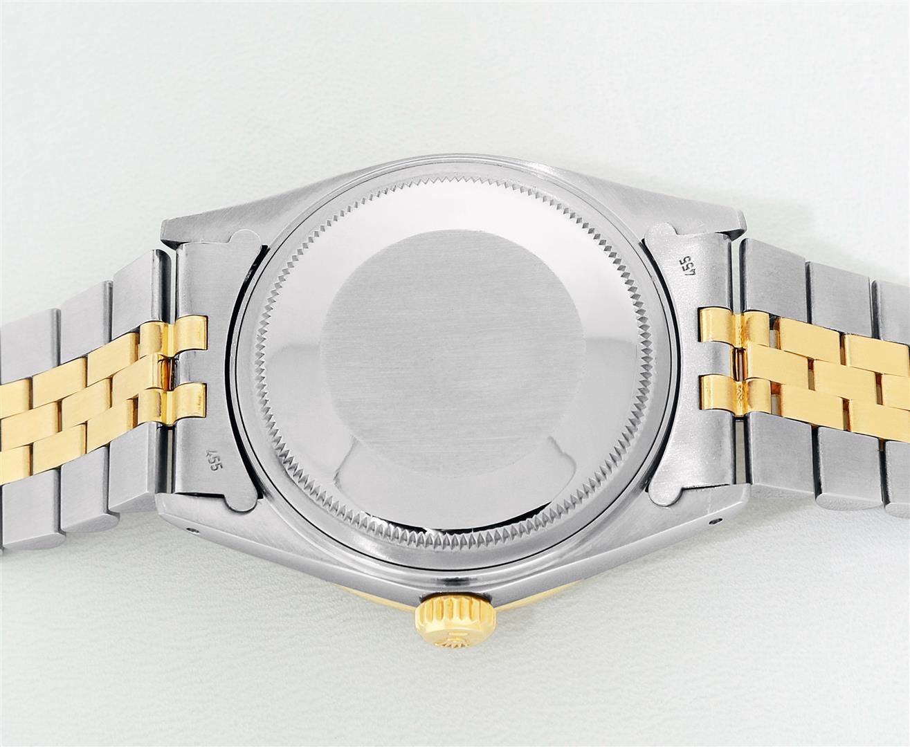 One Mens Rolex Quickset Pre Owned Two Tone 14K Yellow Gold And Stainless Steel Datejust Polished, Serviced & Electronically Tested, Rolex Yellow Gold & Stainless Steel Case: 36mm, Rolex 14K Yellow Gold Crown, Custom Bezel: New 18K Yellow Diamond + Ruby Beadset Bezel, Stone Count: 36 Diamonds + 4 Rubies, Total Weight .75 Carat, Clarity: SI-VS, Color: G to H. Custom Crystal: New Sapphire With Magnified Date Window. Custom Hands: New Luminecent Hands. Rolex Movement: Automatic Winding Movement 3035. Rolex Dial: Champagne Dial With Index Hour Markers Dash Track And Lumi Dots. Date Window: 3 O'Clock Position Date Display, Quickset, Model: Datejust. Condition: G-6 Extra Fine. Rolex Bracelet: Two Tone 14K Yellow Gold & Stainless Steel Jubilee Band. Bright Polish. 7.0 Inch Length, Adjustable. Standard Clasp, With Rolex Logo. This Watch Has Been Serviced Time Tested And Is In Excellent Condition It Is Free Of All Scratches And Dents.
