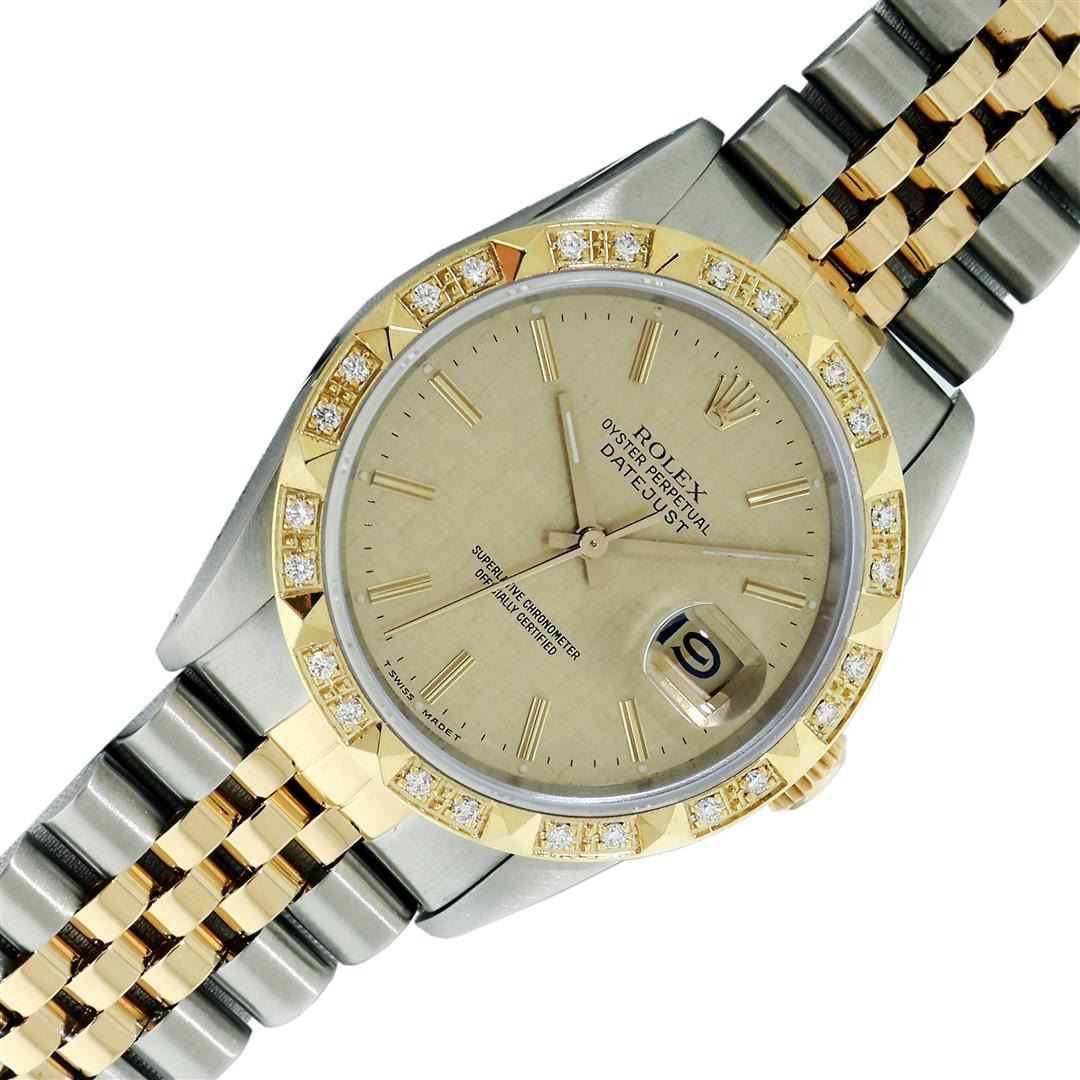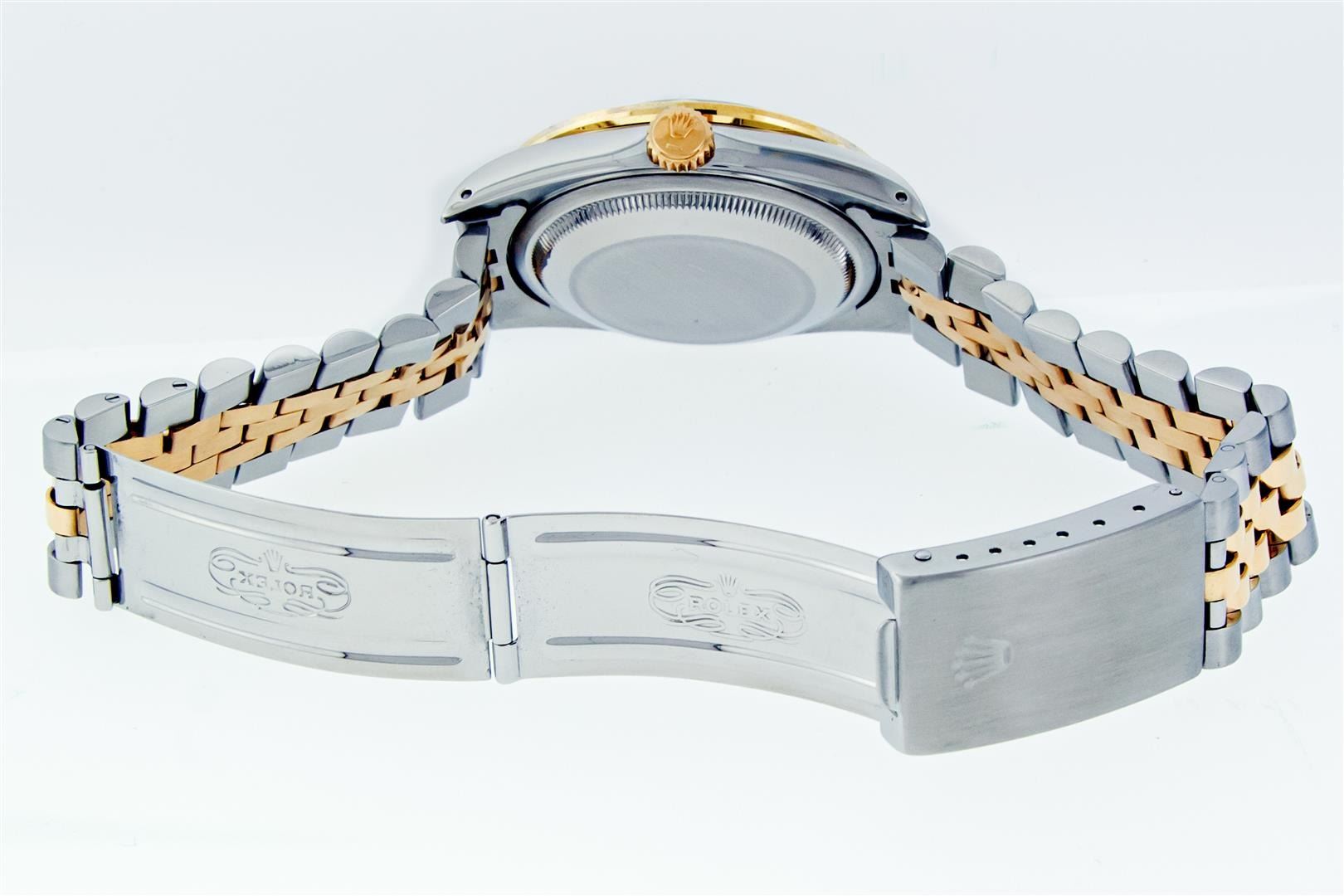 One Mens Pre Owned Yellow Gold Two Tone Rolex Datejust Polished, Serviced & Electronically Tested, Rolex Yellow Gold & Stainless Steel Case: 36mm, Rolex 14K Yellow Gold Crown, Custom Bezel: New 18K Yellow Gold Pyramid Diamond Bezel, Diamond Count On Bezel: 24 Diamonds, Total Weight .75 Carat, Clarity: SI-VS, Color: G to H. Custom Crystal: New Sapphire With Magnified Date Window. Custom Hands: New Luminecent Hands. Rolex Movement: Automatic Winding Movement. Rolex Dial: Champagne Jubilee Dial With Index Hour Markers and Small Track With Lumi Dots. Date Window: 3 O'Clock Position Date Display, Quickset, Model: Datejust. Condition: G-6 Extra Fine. Rolex Bracelet: Two Tone Yellow Gold & Stainless Steel Jubilee Band. Bright Polish. 7.0 Inch Length, Adjustable. Standard Clasp, With Rolex Logo. This Pre Owned Watch Has Been Serviced Time Tested And Is In Excellent Condition It Is Free Of All Scratches And Dents. This Watch Comes With A Rolex Box and Booklets.