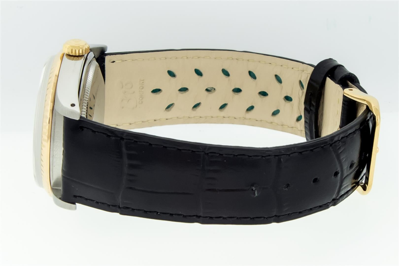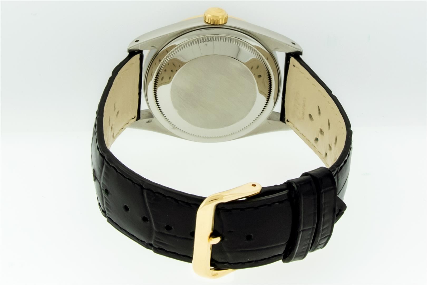 One Mens Pre Owned Yellow Gold Two Tone Rolex Datejust Polished, Serviced & Electronically Tested, Rolex Yellow Gold & Stainless Steel Case: 36mm, Rolex Yellow Gold Crown, Rolex Bezel: 18K Yellow Gold Fluted Bezel. Custom Crystal: New Acrylic Cyclops Lens. Custom Hands: New Gold Hands. Rolex Movement: Automatic Winding Movement. Custom Dial: Refinished To Black Dial With Custom Added Genuine VS Diamond Hour Markers, Diamond Count: 10 Diamonds in Dial G To H In Color, SI-VS Clarity. Date Window: 3 O'Clock Position Date Display, Quickset, Model: Datejust. Condition: G-6 Extra Fine. Custom Band: New Black Leather Band 7.0 Inch Length with New Custom Pin Buckle Clasp. This Watch Has Been Serviced And Polished It Is Free Of All Scratches And Dents.