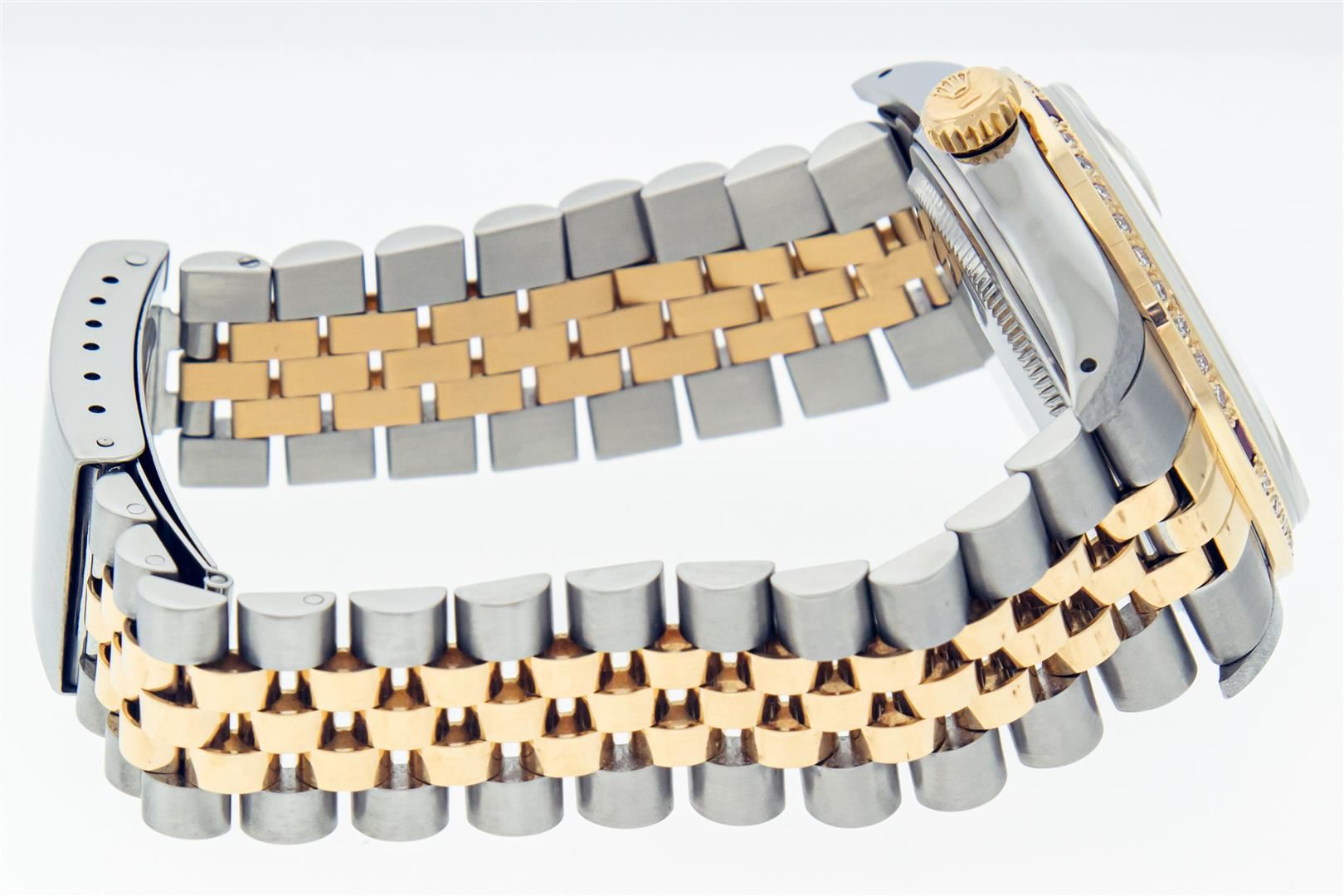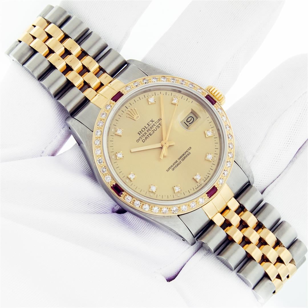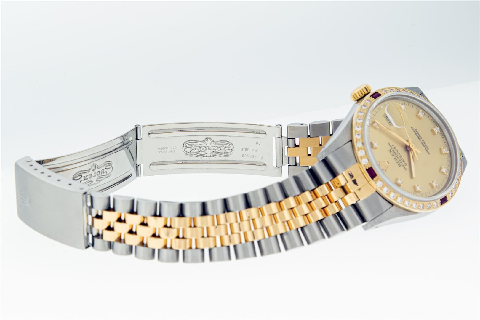 One Mens Pre Owned Yellow Gold Two Tone Rolex Datejust Polished, Serviced & Electronically Tested, Yellow Gold & Stainless Steel Case: 36mm, Rolex Yellow Gold Crown, Custom Bezel: New 18K Yellow Gold Ruby Beadset Diamond Bezel, Diamond Count: 36 Diamonds + 4 Rubies. Custom Crystal: New Sapphire With Magnified Date Window. Custom Hands: New Hands. Rolex Movement: Automatic Winding Movement. Rolex Factory Dial: Champagne Dial With Diamond Hour Markers. Diamond Count: 10 Diamonds In Dial. Date Window: 3 O'Clock Position Date Display, Quickset, Model: Datejust. Condition: G-6 Extra Fine. Rolex Bracelet: Two Tone Yellow Gold & Stainless Steel Jubilee Band. Bright Polish. 7.0 Inch Length, Adjustable. Standard Clasp, With Rolex Logo. This Pre Owned Watch Has Been Serviced Time Tested And Is In Excellent Condition It Is Free Of All Scratches And Dents.