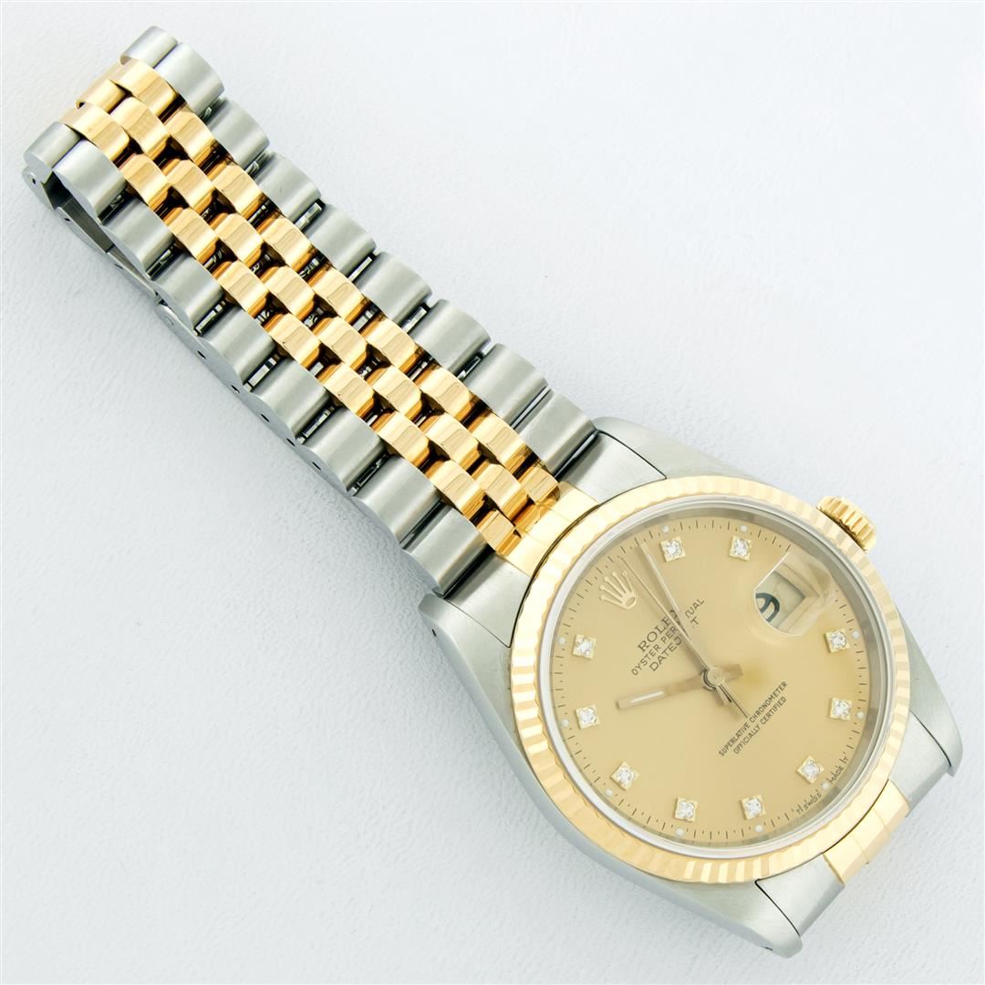 One Mens Quickset Pre Owned Two Tone 14K Yellow Gold And Stainless Steel Rolex Datejust Polished, Serviced & Electronically Tested, Yellow Gold & Stainless Steel Case: 36mm, Yellow Gold Crown, Rolex Bezel: Original Rolex 14K Yellow Gold Fluted Bezel, Custom Crystal: New Acrylic Crystal Lens With Magnified Date Window. Hands: Luminescent Hands. Rolex Movement: Automatic Winding Movement 3035. Rolex Dial: Rolex Factory Champagne Diamond Dial With Dash Track & Lumi Dots, Diamond Count: 10 Diamonds In Dial, Clarity: VVS,Date Window: 3 O'Clock Position Date Display, Quickset, Model: Quickset Datejust. Condition: G-6 Extra Fine. Rolex Bracelet: Two Tone 14K Yellow Gold & Stainless Steel Jubilee Band. Bright Polish. 7.0 Inch Length, Adjustable. Standard Clasp, With Rolex Logo. This Watch Has Been Serviced Time Tested And Is In Excellent Condition It Is Free Of All Scratches And Dents.