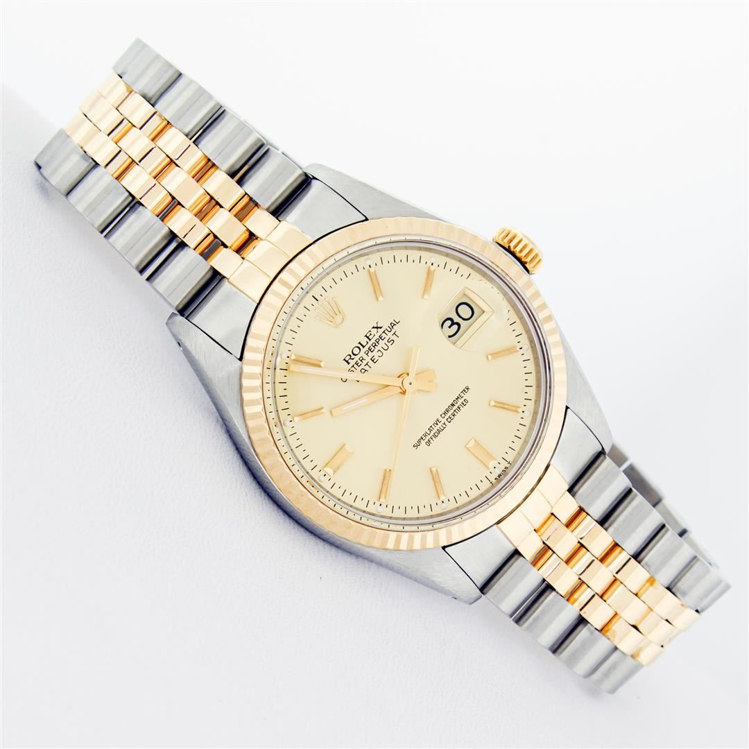One Mens Rolex Pre Owned 14K Two Tone Yellow Gold And Stainless Steel Datejust Polished, Serviced & Electronically Tested, Yellow Gold & Stainless Steel Case: 36mm, Yellow Gold Crown, Rolex Bezel: 14K Yellow Gold Fluted Bezel. Custom Crystal: New Acrylic With Magnified Date Window. Custom Hands: New Luminescent Hands. Rolex Movement: Automatic Winding Movement 3035. Rolex Dial: Champagne Index Dial With Dash Track & Lumi Dots. Date Window: 3 O'Clock Position Date Display, Quickset, Model: Datejust. Condition: G-6 Extra Fine. Rolex Bracelet: Two Tone 14K Yellow Gold And Stainless Steel Jubilee Band. Bright Polish. 7.0 Inch Length, Adjustable. Standard Clasp, With Rolex Logo. This Watch Has Been Serviced Time Tested And Is In Excellent Condition It Is Free Of All Scratches And Dents.