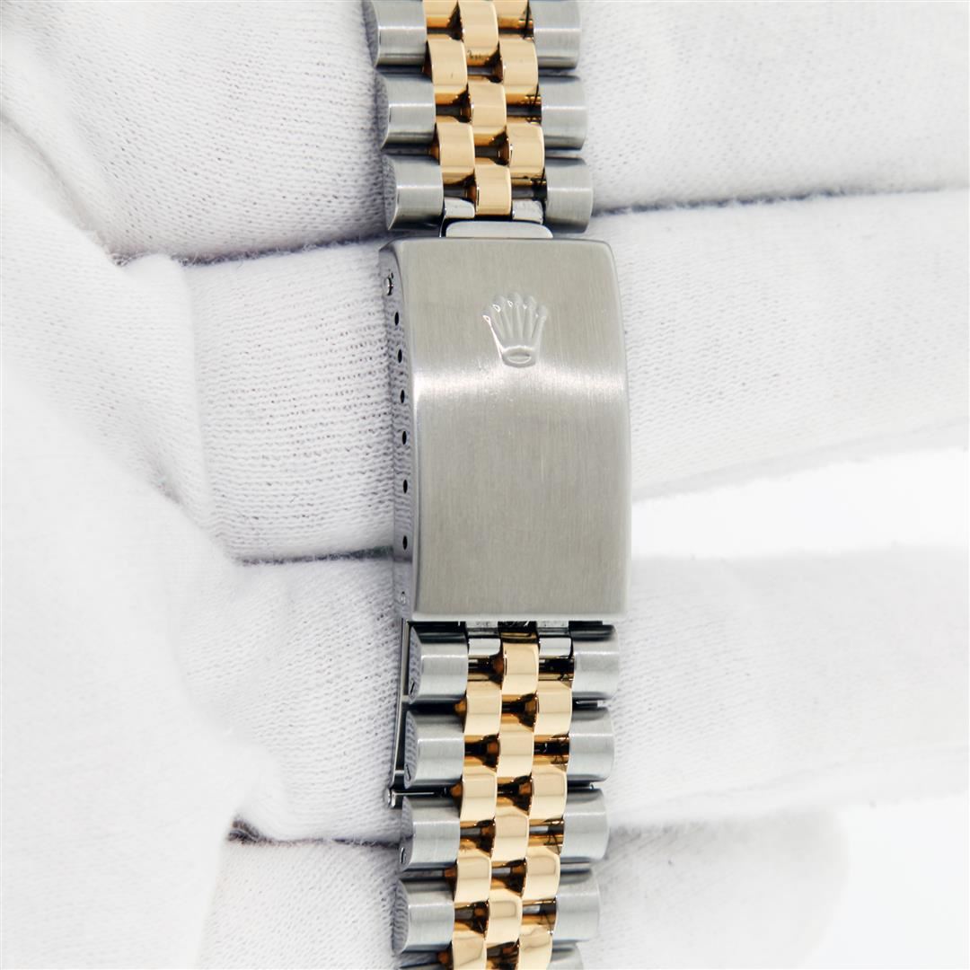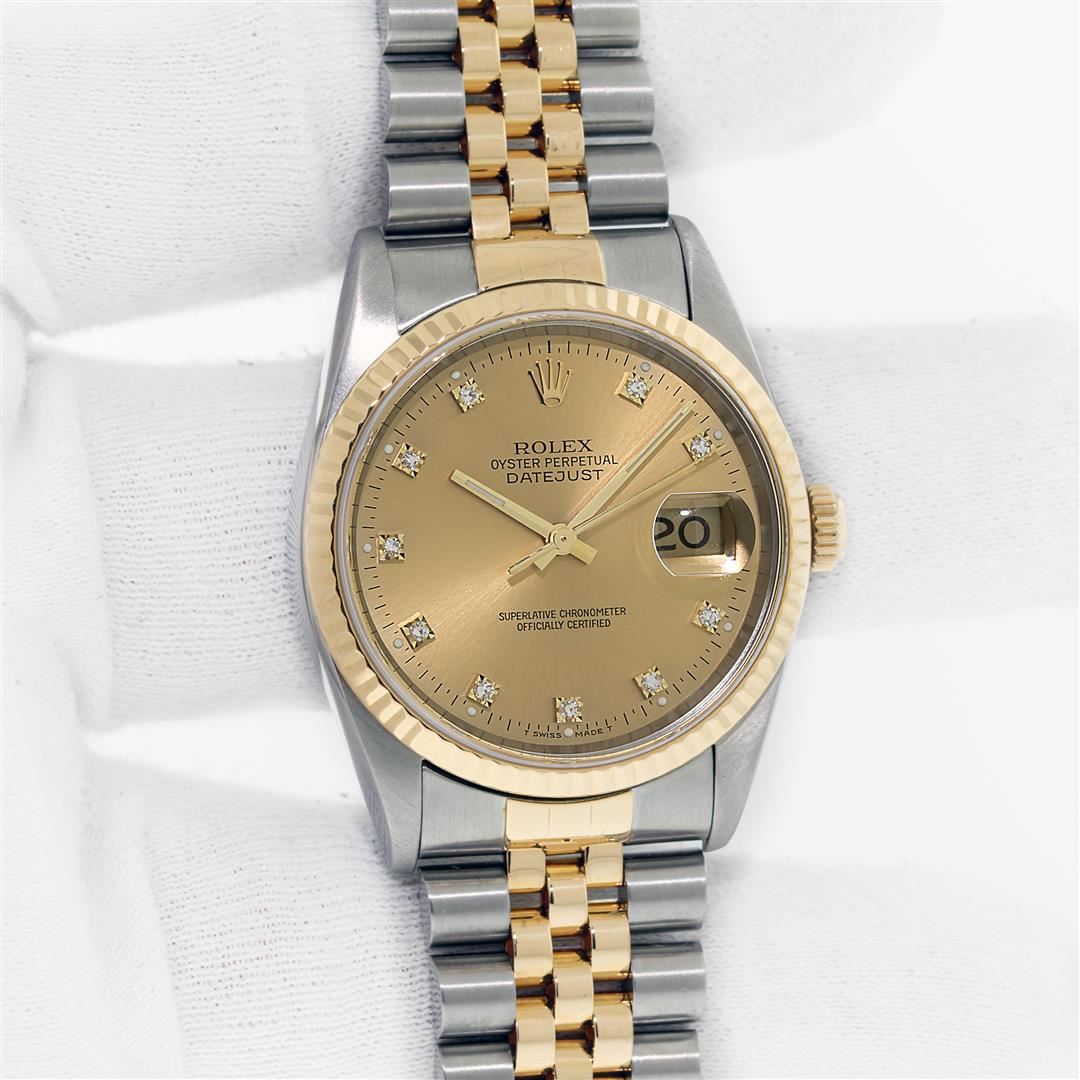 One Mens Pre Owned 18K Yellow Gold And Stainless Steel Rolex Datejust Polished, Serviced & Electronically Tested, Rolex Yellow Gold & Stainless Steel Case: 36mm, Rolex Yellow Gold Crown, Rolex Bezel: 18K Yellow Gold Fluted Bezel. Crystal: Sapphire With Magnified Date Window. Hands: Luminescent Hands. Rolex Movement: Automatic Winding Movement 3135. Rolex Dial: Champagne With VS Factory Diamond Hour Markers & Dash Track, Diamond Count: 10 Diamonds in Dial, VVS Clarity. Date Window: 3 O'Clock Position Date Display, Quickset, Model: Sapphire Datejust. Condition: G-6 Extra Fine. Rolex Bracelet: Two Tone 18K Yellow Gold & Stainless Steel Jubilee Band. Bright Polish. 7.0 Inch Length, Adjustable. Standard Clasp, With Rolex Logo. This Watch Has Been Serviced And Polished It Is Free Of All Scratches And Dents.