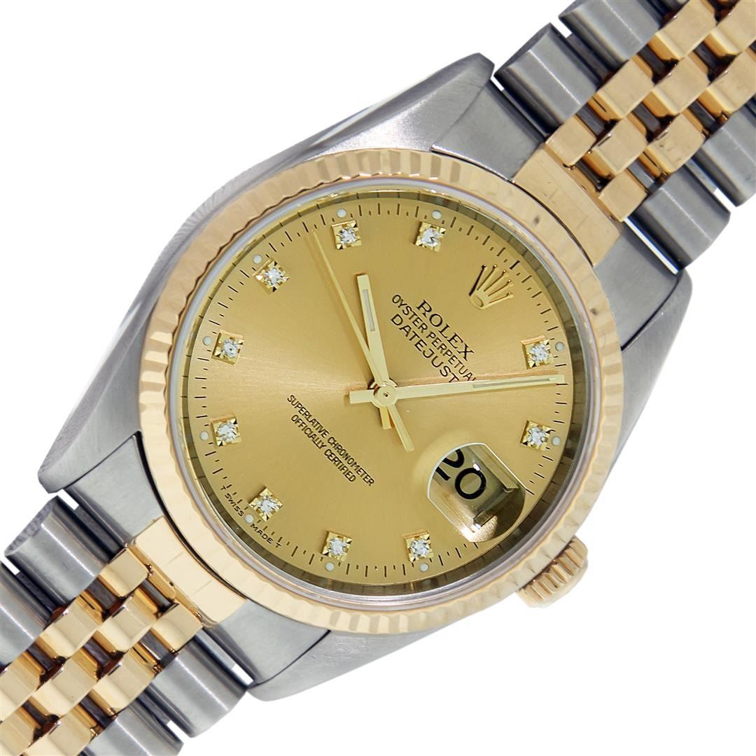 One Mens Pre Owned 18K Yellow Gold And Stainless Steel Rolex Datejust Polished, Serviced & Electronically Tested, Rolex Yellow Gold & Stainless Steel Case: 36mm, Rolex Yellow Gold Crown, Rolex Bezel: 18K Yellow Gold Fluted Bezel. Crystal: Sapphire With Magnified Date Window. Hands: Luminescent Hands. Rolex Movement: Automatic Winding Movement 3135. Rolex Dial: Champagne With VS Factory Diamond Hour Markers & Dash Track, Diamond Count: 10 Diamonds in Dial, VVS Clarity. Date Window: 3 O'Clock Position Date Display, Quickset, Model: Sapphire Datejust. Condition: G-6 Extra Fine. Rolex Bracelet: Two Tone 18K Yellow Gold & Stainless Steel Jubilee Band. Bright Polish. 7.0 Inch Length, Adjustable. Standard Clasp, With Rolex Logo. This Watch Has Been Serviced And Polished It Is Free Of All Scratches And Dents.