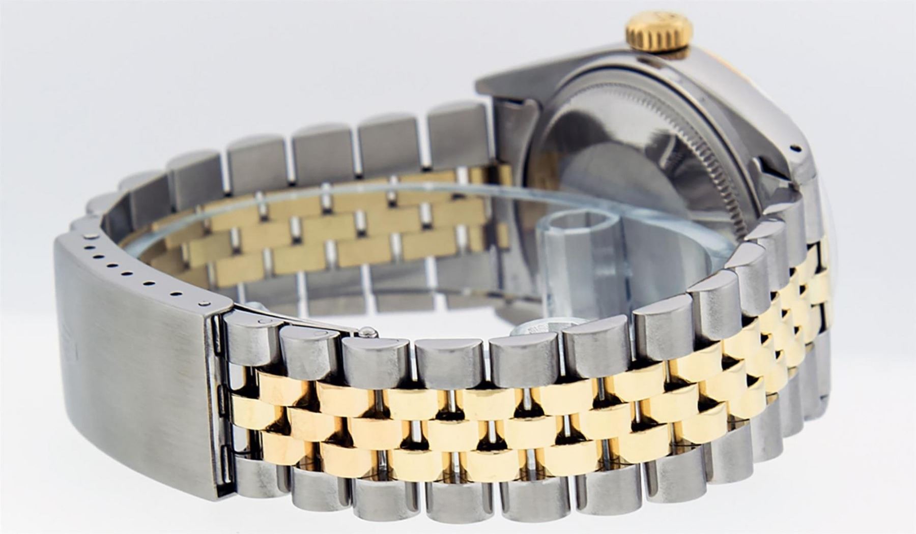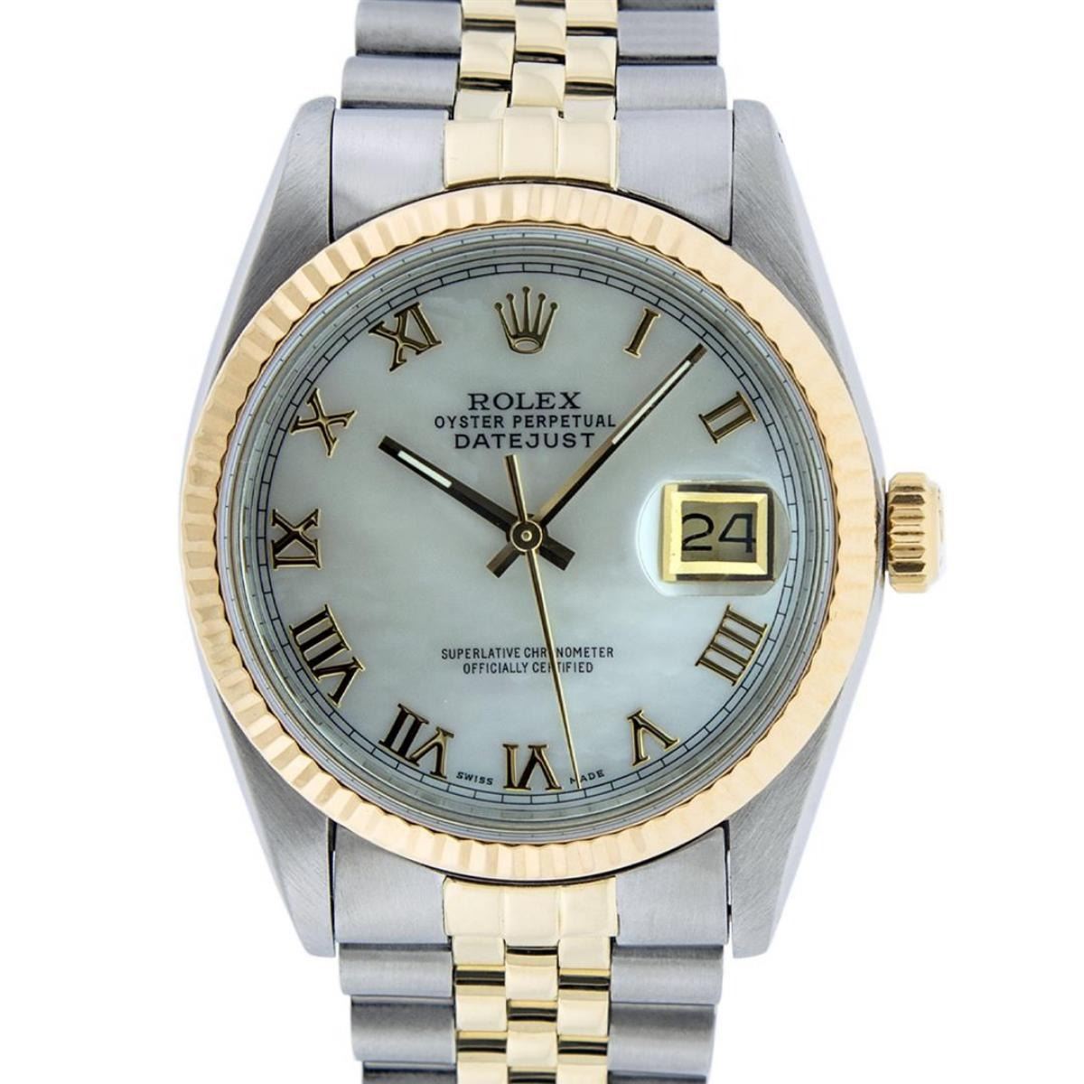 One Mens Yellow Gold Two Tone Rolex Datejust Polished, Serviced & Electronically Tested, Yellow Gold & Stainless Steel Case: 36mm, Yellow Gold Crown, Bezel: Yellow Gold Fluted Bezel. Custom Crystal: New Acrylic Cyclops Lens. Custom Hands: New Luminecent Hands. Movement: Automatic Winding Movement. Custom Dial: Mother Of Pearl Roman With Square Track. Date Window: 3 O'Clock Position Date Display, Quickset, Model: Datejust. Condition: G-6 Extra Fine. Bracelet:Two Tone Yellow Gold & Stainless Steel Jubilee. Bright Polish. 7.0 Inch Length, Adjustable. Standard Clasp, With Rolex Logo. This Watch Has Been Serviced Time Tested And Is In Excellent Condition It Is Free Of All Scratches And Dents.