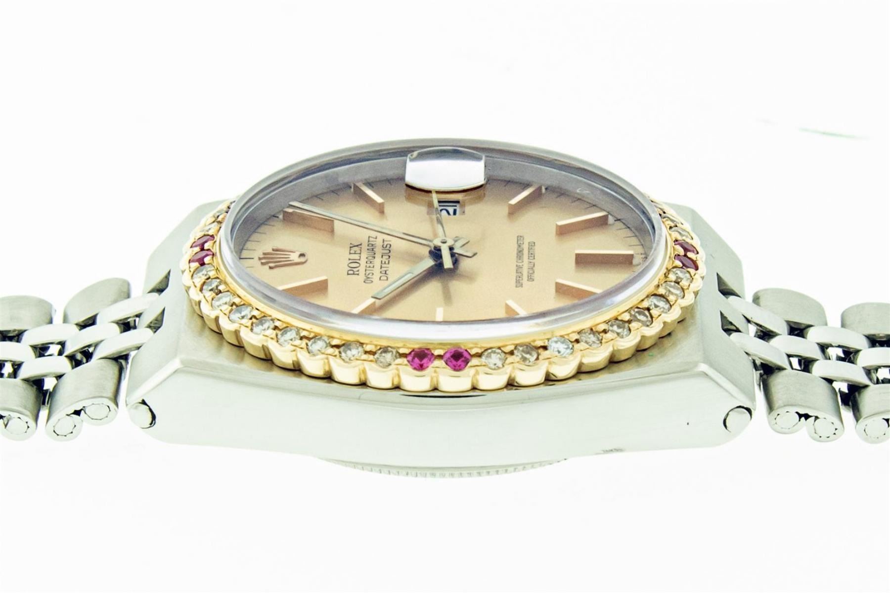 One Mens Stainless Steel Rolex Oysterquartz Datejust Polished, Serviced & Electronically Tested, Stainless Steel Case: 36mm, Original 18K Yellow Gold Crown, Custom Bezel: 14K Yellow Gold Beadset Diamond Bezel, Diamond Count: 36 Diamonds + 8 Rubies, Clarity: SI-VS, Color: G to H. Custom Crystal: New Scratch Resistant Sappphire Crystal Lens. Hands: Genuine Rolex Luminecent Hands. Movement: Quartz Movement 5035. Original Dial: Rolex Champagne Dial with Index Hour Markers And Lumi Dots, Date Window: 3 O'Clock Position Date Display, Quickset, Model: Datejust, Condition: G-6 Extra Fine. Bracelet: Stainless Steel Jubilee Band. Bright Polish. 7.0 Inch Length, Adjustable. Standard Clasp, With Rolex Logo. This Watch Has Been Serviced And Polished It Is Free Of All Scratches And Dents.