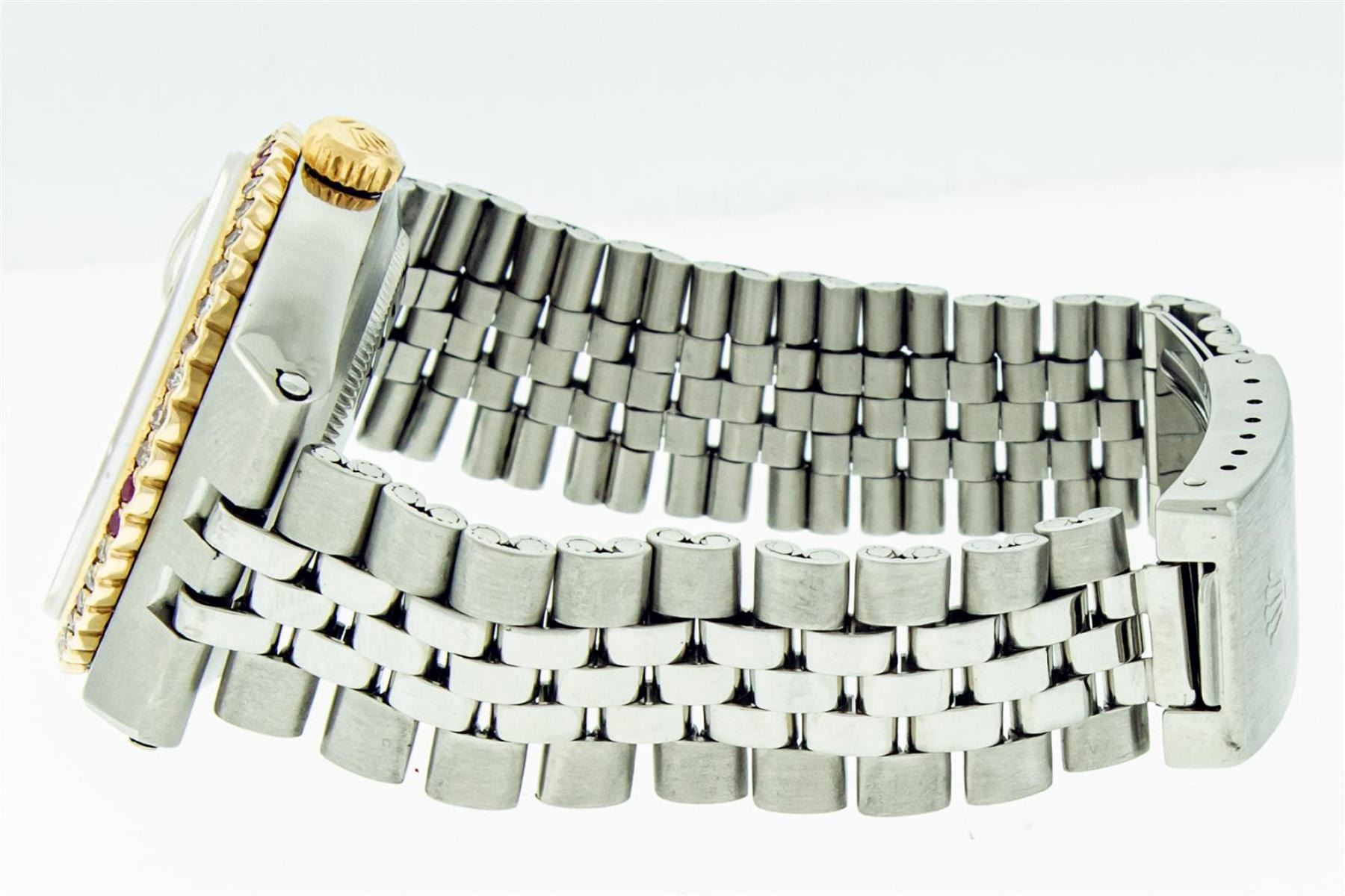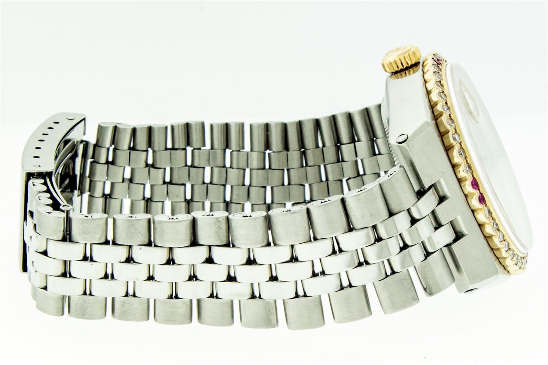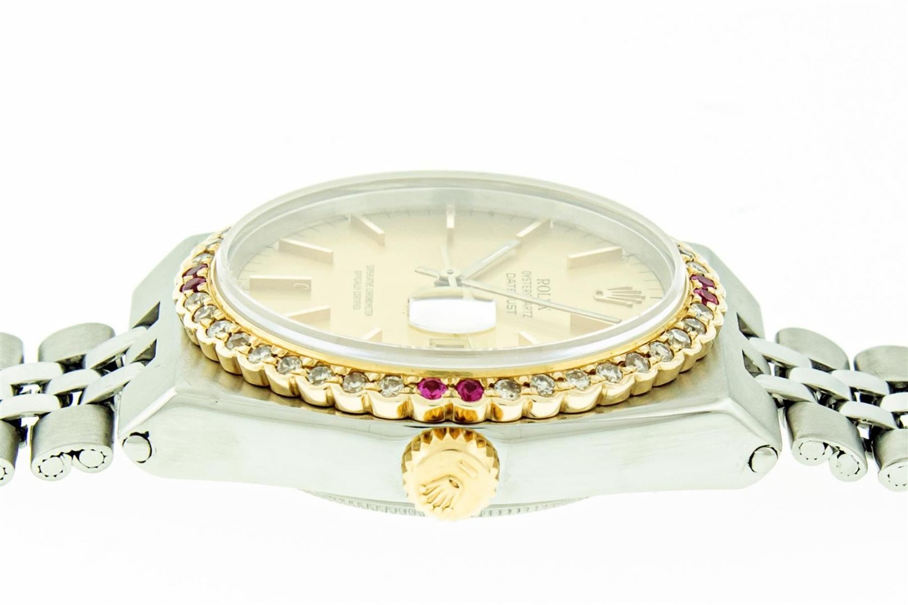 One Mens Stainless Steel Rolex Oysterquartz Datejust Polished, Serviced & Electronically Tested, Stainless Steel Case: 36mm, Original 18K Yellow Gold Crown, Custom Bezel: 14K Yellow Gold Beadset Diamond Bezel, Diamond Count: 36 Diamonds + 8 Rubies, Clarity: SI-VS, Color: G to H. Custom Crystal: New Scratch Resistant Sappphire Crystal Lens. Hands: Genuine Rolex Luminecent Hands. Movement: Quartz Movement 5035. Original Dial: Rolex Champagne Dial with Index Hour Markers And Lumi Dots, Date Window: 3 O'Clock Position Date Display, Quickset, Model: Datejust, Condition: G-6 Extra Fine. Bracelet: Stainless Steel Jubilee Band. Bright Polish. 7.0 Inch Length, Adjustable. Standard Clasp, With Rolex Logo. This Watch Has Been Serviced And Polished It Is Free Of All Scratches And Dents.