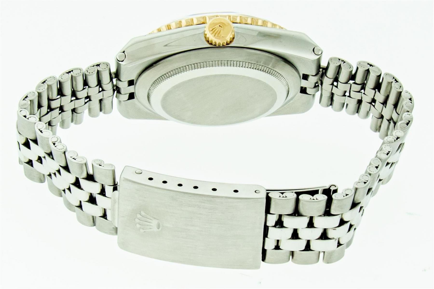 One Mens Stainless Steel Rolex Oysterquartz Datejust Polished, Serviced & Electronically Tested, Stainless Steel Case: 36mm, Original 18K Yellow Gold Crown, Custom Bezel: 14K Yellow Gold Beadset Diamond Bezel, Diamond Count: 36 Diamonds + 8 Rubies, Clarity: SI-VS, Color: G to H. Custom Crystal: New Scratch Resistant Sappphire Crystal Lens. Hands: Genuine Rolex Luminecent Hands. Movement: Quartz Movement 5035. Original Dial: Rolex Champagne Dial with Index Hour Markers And Lumi Dots, Date Window: 3 O'Clock Position Date Display, Quickset, Model: Datejust, Condition: G-6 Extra Fine. Bracelet: Stainless Steel Jubilee Band. Bright Polish. 7.0 Inch Length, Adjustable. Standard Clasp, With Rolex Logo. This Watch Has Been Serviced And Polished It Is Free Of All Scratches And Dents.