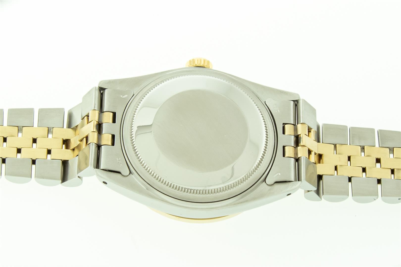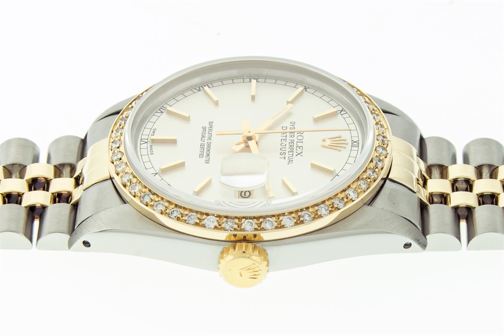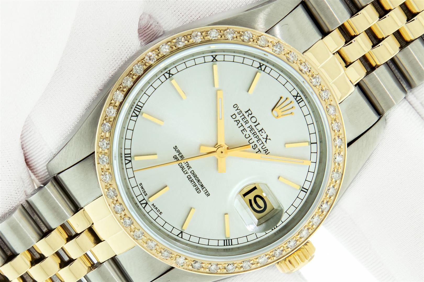 One Mens 18K Yellow Gold & Stainless Steel Two Tone Rolex Oyster Perpetual Datejust Polished, Serviced & Electronically Tested, 18K Yellow Gold & Stainless Steel Case: 36mm, Original 18K Yellow Gold Crown, Custom Bezel: New 18K Yellow Gold Beadset Diamond Bezel, Diamond Count: 44 Diamonds, Total Bezel Weight 1.00 Carat, Clarity: SI-VS, Color: G to H. Custom Crystal: New Scratch Resistant Sappphire Crystal Lens. Hands: Genuine Rolex Luminecent Hands. Movement: Automatic Winding Movement 3035. Original Dial: Original Rolex Factory Silver Index Dial with Roman Track & Lumi Dots, Date Window: 3 O'Clock Position Date Display, Quickset, Model: Datejust, Condition: G-6 Extra Fine. Bracelet: Tight Two Tone 18K Yellow Gold & Stainless Steel Jubilee Showing Little To No Stretch. Bright Polish. 7.0 Inch Length, Adjustable. Standard Clasp, With Rolex Logo. This Watch Has Been Serviced And Polished It Is Free Of All Scratches And Dents. This Watch Comes With The Following Accessories: Rolex Box, Rolex Booklets, Rolex Tag, and Rolex Wallet