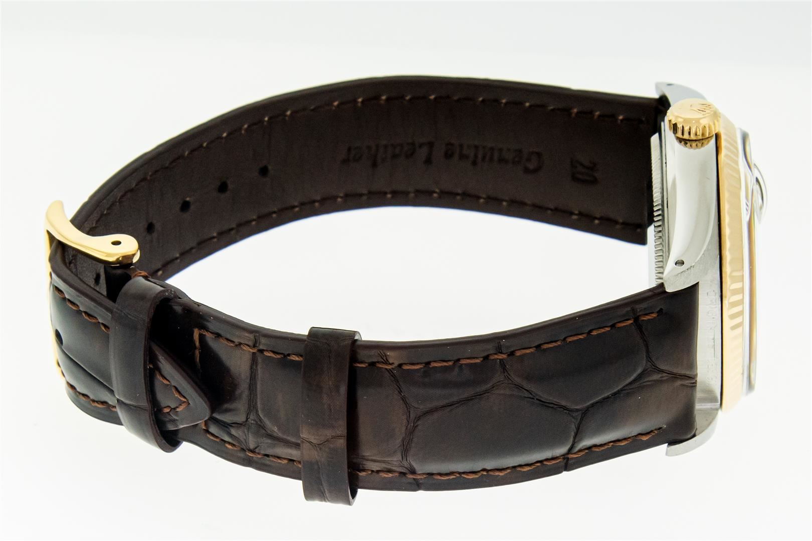 One Mens Pre Owned Two Tone Yellow Gold And Stainless Steel Rolex Datejust Polished, Serviced & Electronically Tested, Rolex Yellow Gold & Stainless Steel Case: 36mm, Rolex Yellow Gold Crown, Rolex Bezel: Yellow Gold Fluted Bezel. Custom Crystal: New Plastic With Date Window. Custom Hands: New Hands. Rolex Movement: Automatic Winding Movement. Rolex Dial: Champagne With Index Hour Markers And Dash Track. Date Window: 3 O'Clock Position Date Display, Quickset, Model: Datejust. Condition: G-6 Extra Fine. Custom Band: New Brown Leather Band 7.0 Inch Length with New Custom Pin Buckle Clasp. This Watch Has Been Serviced And Polished It Is Free Of All Scratches And Dents.