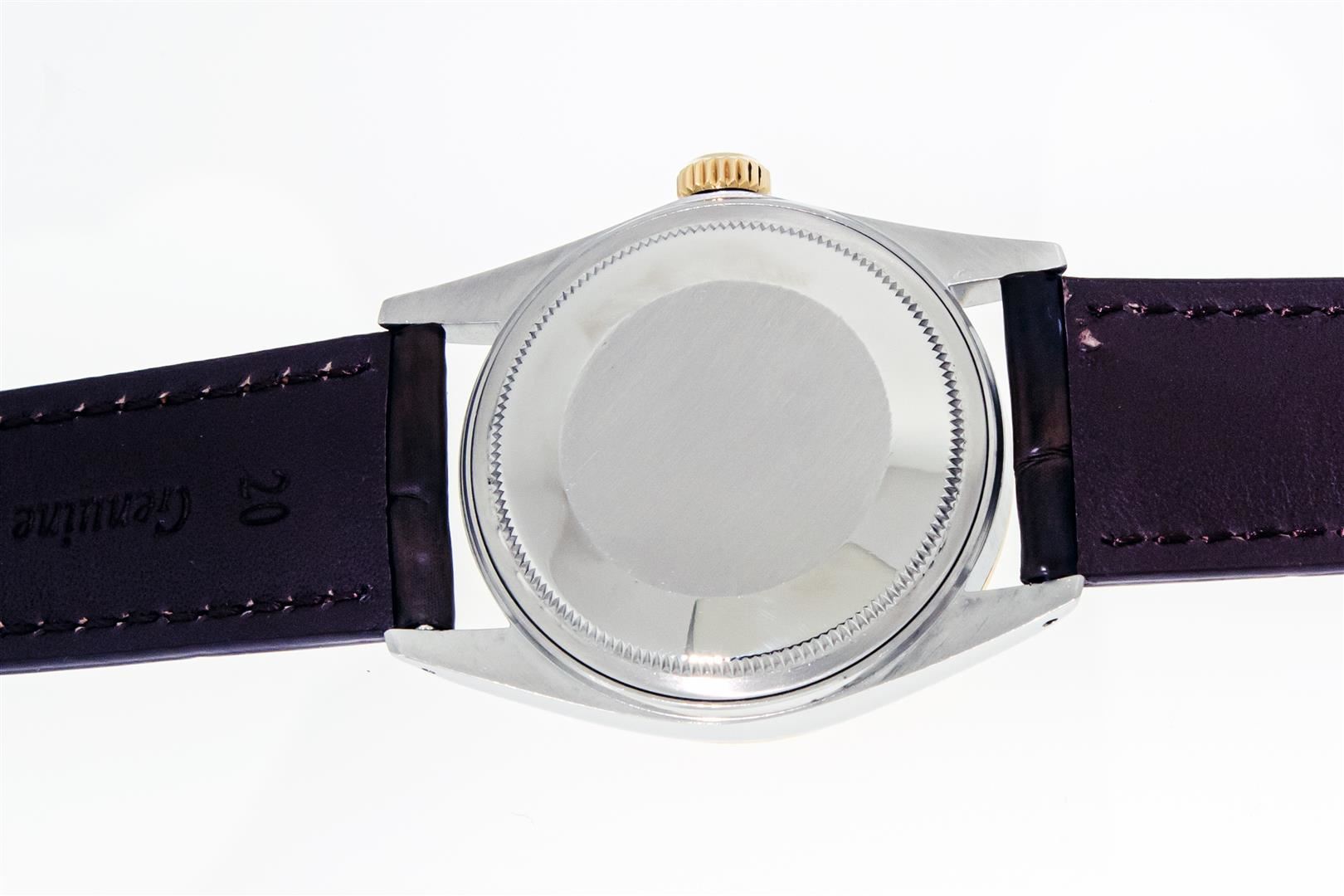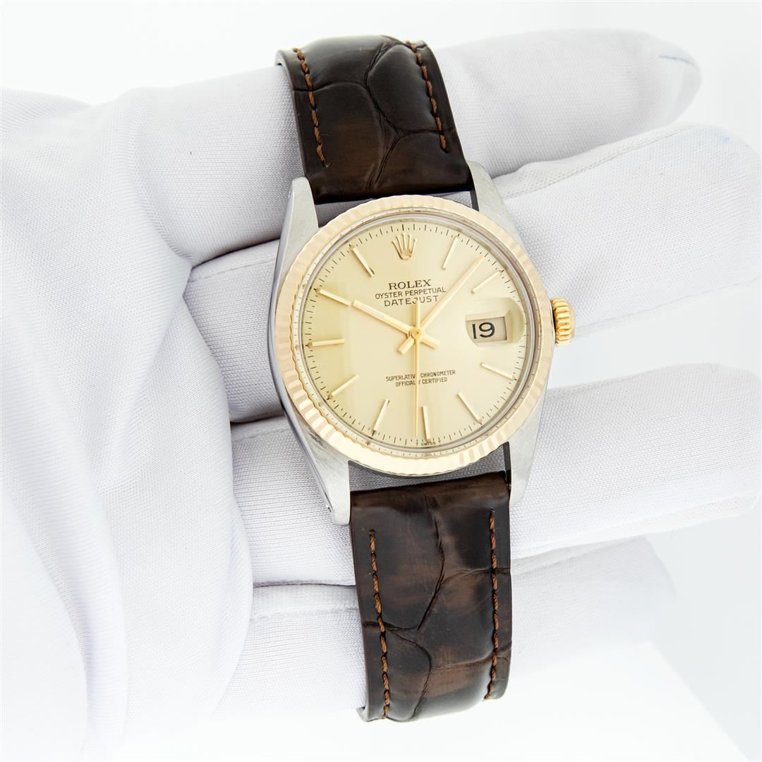 One Mens Pre Owned Two Tone Yellow Gold And Stainless Steel Rolex Datejust Polished, Serviced & Electronically Tested, Rolex Yellow Gold & Stainless Steel Case: 36mm, Rolex Yellow Gold Crown, Rolex Bezel: Yellow Gold Fluted Bezel. Custom Crystal: New Plastic With Date Window. Custom Hands: New Hands. Rolex Movement: Automatic Winding Movement. Rolex Dial: Champagne With Index Hour Markers And Dash Track. Date Window: 3 O'Clock Position Date Display, Quickset, Model: Datejust. Condition: G-6 Extra Fine. Custom Band: New Brown Leather Band 7.0 Inch Length with New Custom Pin Buckle Clasp. This Watch Has Been Serviced And Polished It Is Free Of All Scratches And Dents.