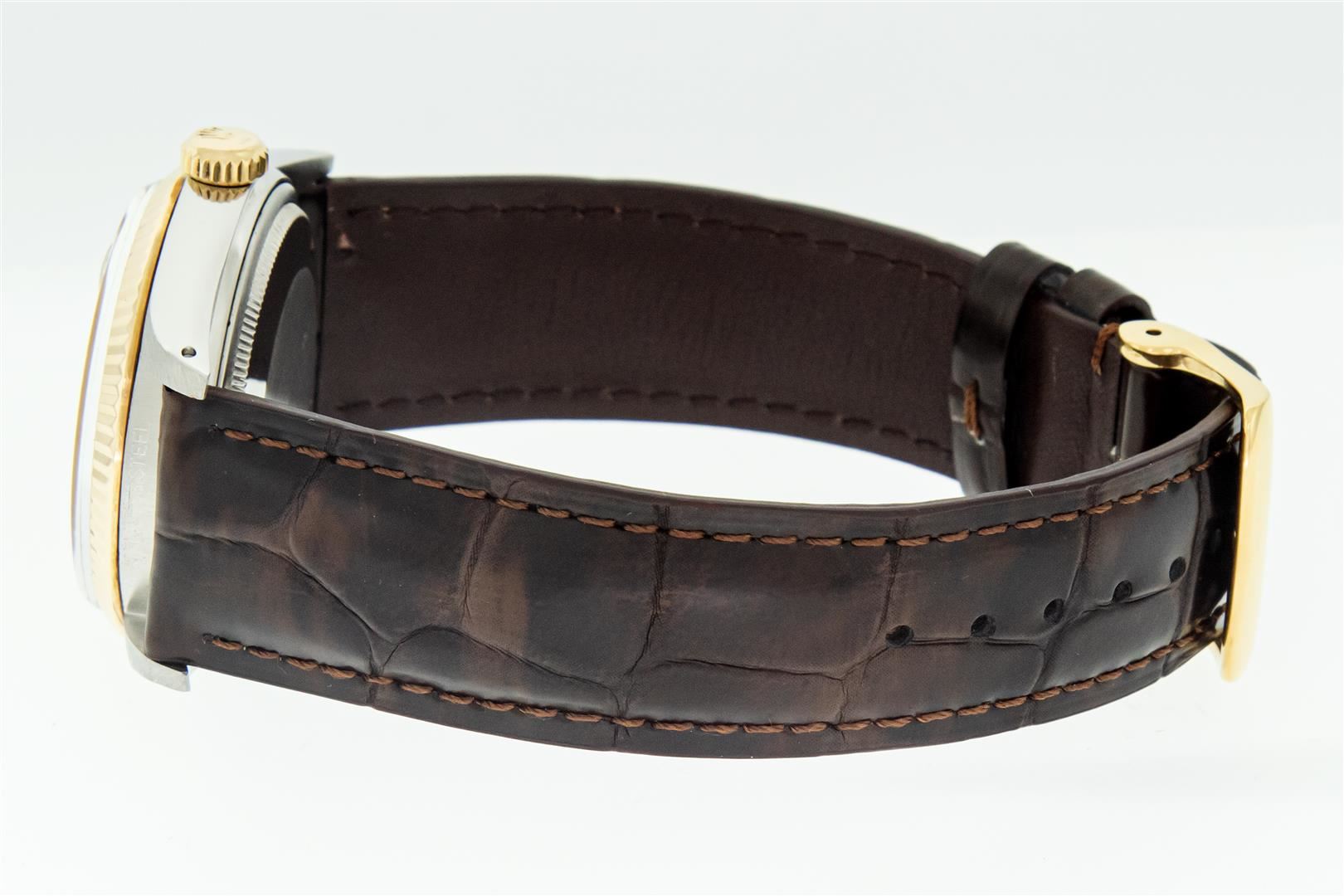 One Mens Pre Owned Two Tone Yellow Gold And Stainless Steel Rolex Datejust Polished, Serviced & Electronically Tested, Rolex Yellow Gold & Stainless Steel Case: 36mm, Rolex Yellow Gold Crown, Rolex Bezel: Yellow Gold Fluted Bezel. Custom Crystal: New Plastic With Date Window. Custom Hands: New Hands. Rolex Movement: Automatic Winding Movement. Rolex Dial: Champagne With Index Hour Markers And Dash Track. Date Window: 3 O'Clock Position Date Display, Quickset, Model: Datejust. Condition: G-6 Extra Fine. Custom Band: New Brown Leather Band 7.0 Inch Length with New Custom Pin Buckle Clasp. This Watch Has Been Serviced And Polished It Is Free Of All Scratches And Dents.