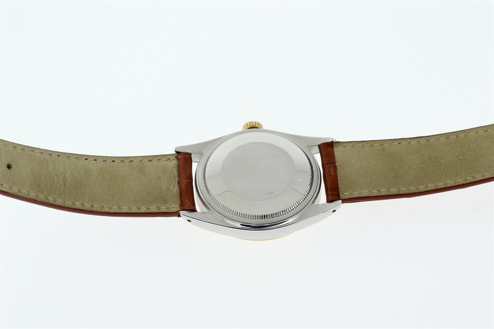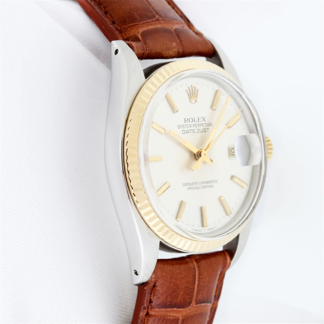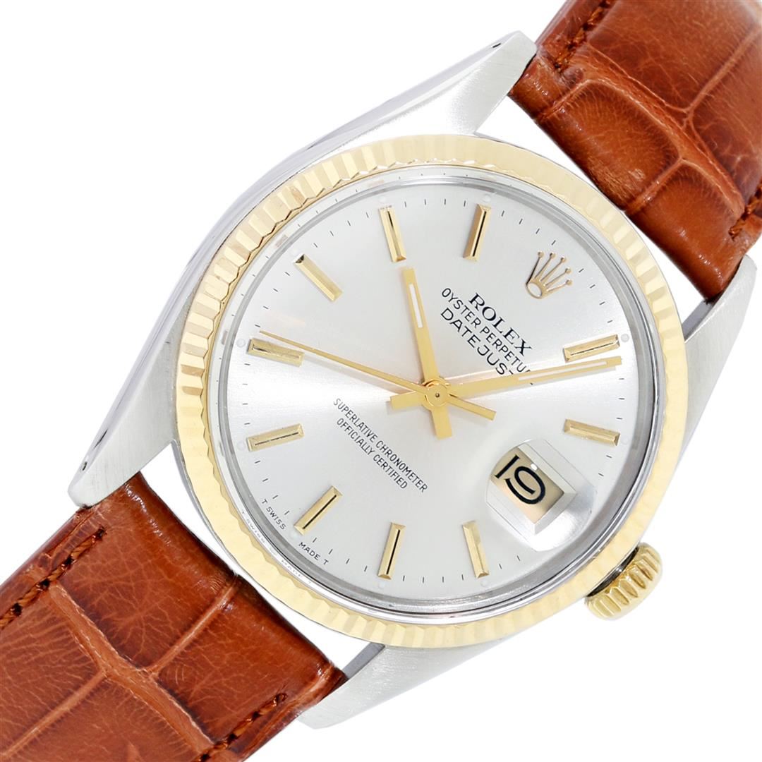 One Mens Pre Owned Two Tone Yellow Gold And Stainless Steel Rolex Datejust Polished, Serviced & Electronically Tested, Rolex Yellow Gold & Stainless Steel Case: 36mm, Rolex Yellow Gold Crown, Rolex Bezel: Yellow Gold Fluted Bezel. Custom Crystal: New Plastic With Date Window. Custom Hands: New Hands. Rolex Movement: Automatic Winding Movement. Rolex Dial: Silver With Index Hour Markers. Date Window: 3 O'Clock Position Date Display, Quickset, Model: Datejust. Condition: G-6 Extra Fine. Custom Band: New Brown Leather Band 7.0 Inch Length with New Custom Pin Buckle Clasp. This Watch Has Been Serviced And Polished It Is Free Of All Scratches And Dents.