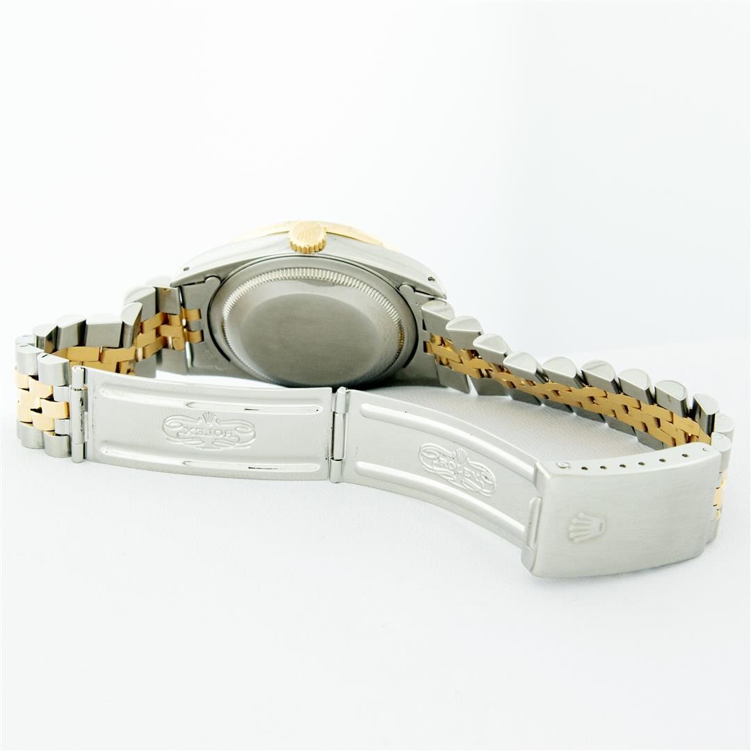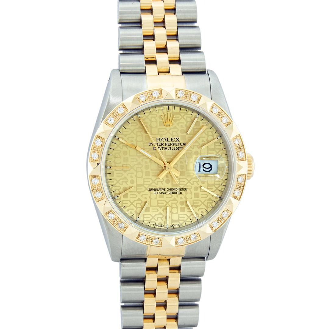 One Mens Quickset Pre Owned Two Tone 14K Yellow Gold And Stainless Steel Datejust Polished, Serviced & Electronically Tested, Rolex Yellow Gold & Stainless Steel Case: 36mm, Rolex 14K Yellow Gold Crown, Custom Bezel: New 18K Yellow Gold Pyramid Diamond Bezel, Diamond Count: 24 Diamonds, Total Weight .75 Carat, Clarity: SI-VS, Color: G to H. Custom Crystal: New Sapphire With Magnified Date Window. Custom Hands: New Luminecent Hands. Rolex Movement: Automatic Winding Movement 3035. Rolex Dial: Champagne Jubilee Dial With Index Hour Markers and Small Track With Lumi Dots. Date Window: 3 O'Clock Position Date Display, Quickset, Model: Datejust. Condition: G-6 Extra Fine. Rolex Bracelet: Two Tone 14K Yellow Gold & Stainless Steel Jubilee Band. Bright Polish. 7.0 Inch Length, Adjustable. Standard Clasp, With Rolex Logo. This Watch Has Been Serviced Time Tested And Is In Excellent Condition It Is Free Of All Scratches And Dents.