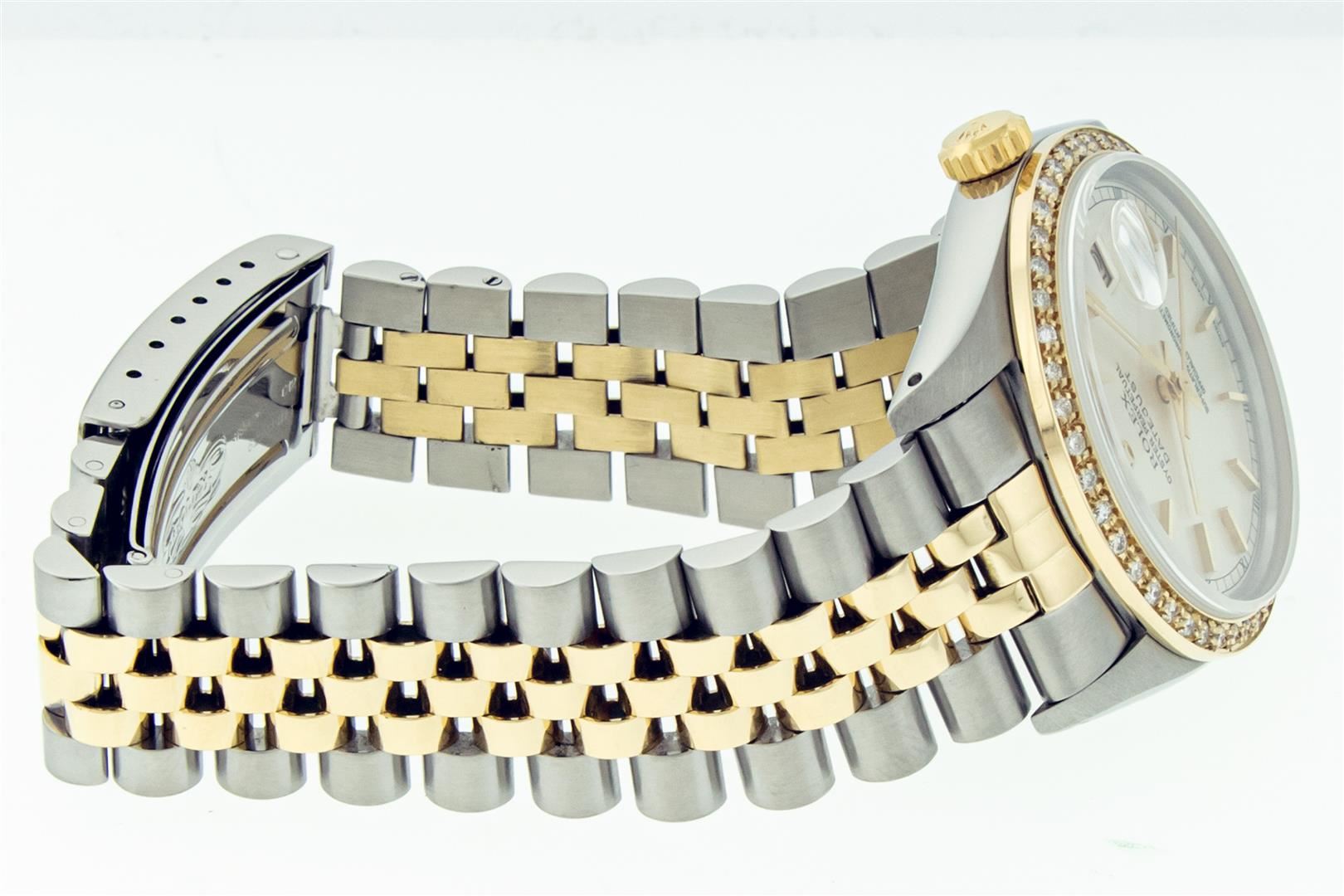 One Mens Pre Owned 18K Yellow Gold & Stainless Steel Two Tone Rolex Datejust Polished, Serviced & Electronically Tested, Rolex 18K Yellow Gold & Stainless Steel Case: 36mm, Rolex Crown: 18K Yellow Gold Crown, Custom Bezel: New 18K Yellow Gold Beadset Diamond Bezel, Diamond Count: 44 Diamonds, Total Bezel Weight 1.00 Carat, Clarity: SI-VS, Color: G to H. Custom Crystal: New Sapphire With Magnified Date Window. Rolex Hands: Genuine Rolex Luminescent Hands. Rolex Movement: Automatic Winding Movement 3035. Rolex Dial: Rolex Factory Silver Index Dial with Roman Track & Lumi Dots, Date Window: 3 O'Clock Position Date Display, Quickset, Model: Datejust, Condition: G-6 Extra Fine. Rolex Bracelet: Two Tone 18K Yellow Gold & Stainless Steel Jubilee Band. Bright Polish. 7.0 Inch Length, Adjustable. Standard Clasp, With Rolex Logo. This Watch Has Been Serviced And Polished It Is Free Of All Scratches And Dents.