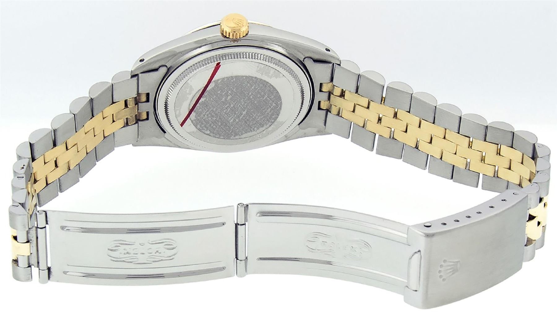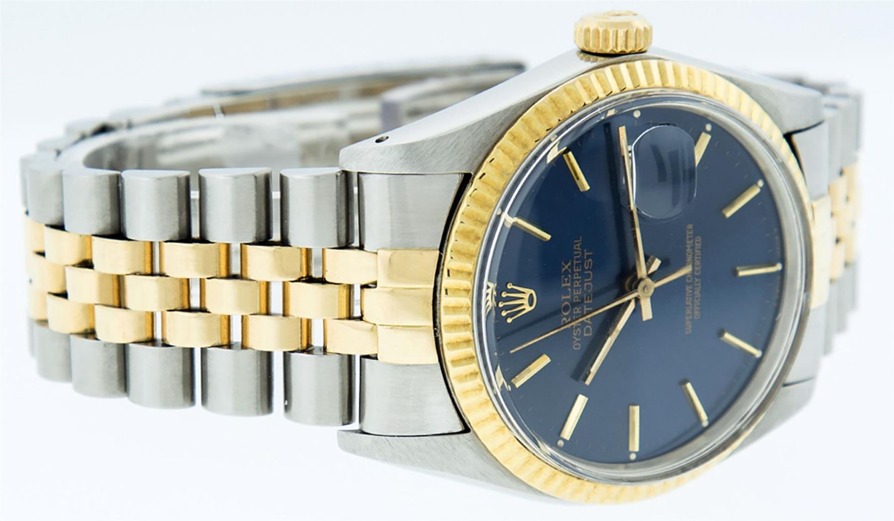 One Mens Rolex Pre Owned Two Tone 14K Yellow Gold And Stainless Steel Datejust Polished, Serviced & Electronically Tested, Rolex Yellow Gold & Stainless Steel Case: 36mm, Rolex Yellow Gold Crown, Rolex Bezel: 14K Yellow Gold Fluted Bezel. Custom Crystal: New Acrylic With Magnified Date Window. Rolex Hands: Luminecent Hands. Rolex Movement: Automatic Winding Movement 3035. Rolex Dial: Blue Index Dial With Index Track. Date Window: 3 O'Clock Position Date Display, Quickset, Model: Datejust. Condition: G-6 Extra Fine. Rolex Bracelet: Two Tone 14K Yellow Gold & Stainless Steel Jubilee Band. Bright Polish. 7.0 Inch Length, Adjustable. Standard Clasp, With Rolex Logo. This Watch Has Been Serviced Time Tested And Is In Excellent Condition It Is Free Of All Scratches And Dents.