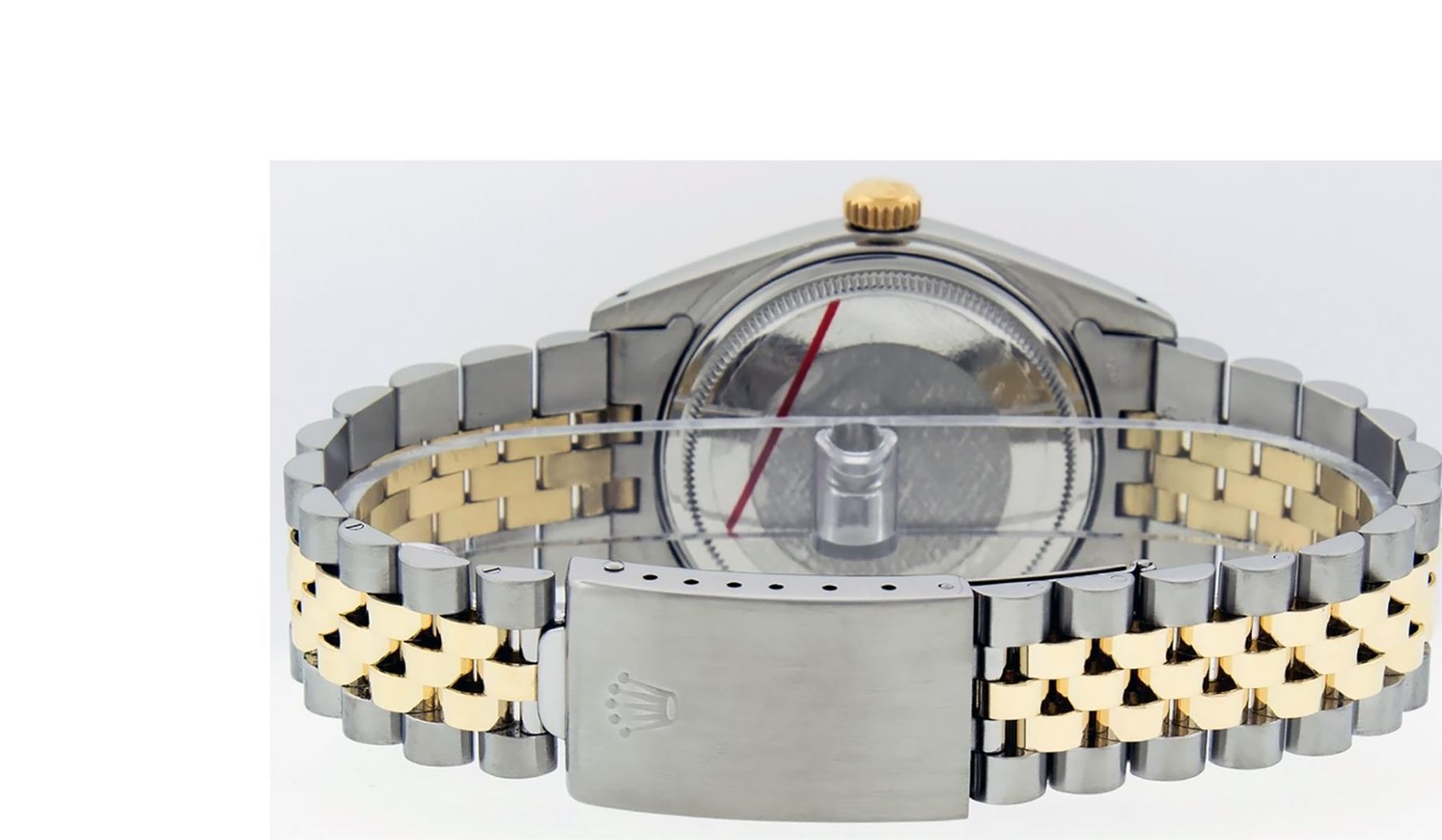 One Mens Rolex Pre Owned Two Tone 14K Yellow Gold And Stainless Steel Datejust Polished, Serviced & Electronically Tested, Rolex Yellow Gold & Stainless Steel Case: 36mm, Rolex Yellow Gold Crown, Rolex Bezel: 14K Yellow Gold Fluted Bezel. Custom Crystal: New Acrylic With Magnified Date Window. Rolex Hands: Luminecent Hands. Rolex Movement: Automatic Winding Movement 3035. Rolex Dial: Blue Index Dial With Index Track. Date Window: 3 O'Clock Position Date Display, Quickset, Model: Datejust. Condition: G-6 Extra Fine. Rolex Bracelet: Two Tone 14K Yellow Gold & Stainless Steel Jubilee Band. Bright Polish. 7.0 Inch Length, Adjustable. Standard Clasp, With Rolex Logo. This Watch Has Been Serviced Time Tested And Is In Excellent Condition It Is Free Of All Scratches And Dents.