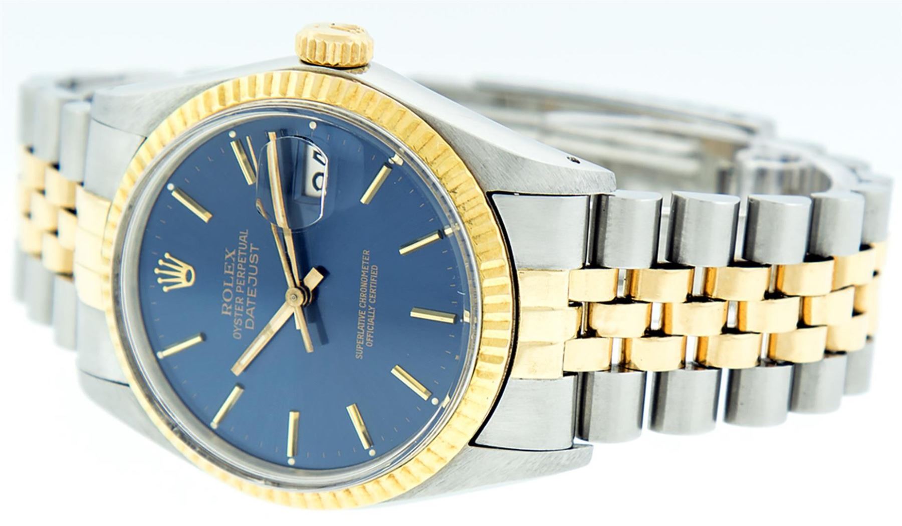 One Mens Rolex Pre Owned Two Tone 14K Yellow Gold And Stainless Steel Datejust Polished, Serviced & Electronically Tested, Rolex Yellow Gold & Stainless Steel Case: 36mm, Rolex Yellow Gold Crown, Rolex Bezel: 14K Yellow Gold Fluted Bezel. Custom Crystal: New Acrylic With Magnified Date Window. Rolex Hands: Luminecent Hands. Rolex Movement: Automatic Winding Movement 3035. Rolex Dial: Blue Index Dial With Index Track. Date Window: 3 O'Clock Position Date Display, Quickset, Model: Datejust. Condition: G-6 Extra Fine. Rolex Bracelet: Two Tone 14K Yellow Gold & Stainless Steel Jubilee Band. Bright Polish. 7.0 Inch Length, Adjustable. Standard Clasp, With Rolex Logo. This Watch Has Been Serviced Time Tested And Is In Excellent Condition It Is Free Of All Scratches And Dents.