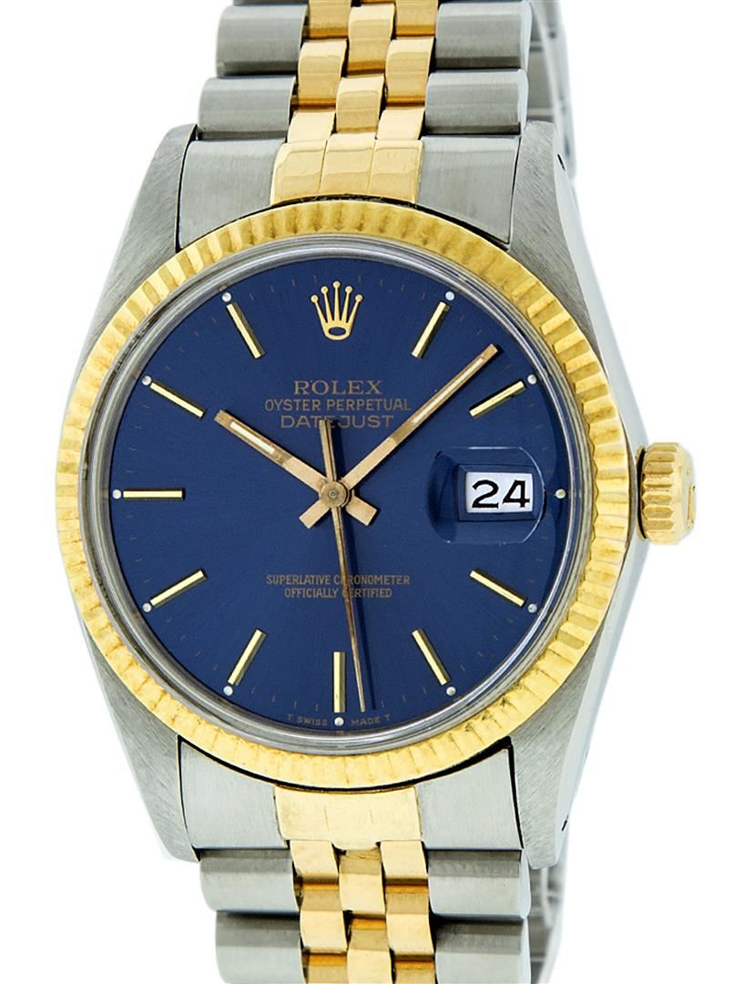 One Mens Rolex Pre Owned Two Tone 14K Yellow Gold And Stainless Steel Datejust Polished, Serviced & Electronically Tested, Rolex Yellow Gold & Stainless Steel Case: 36mm, Rolex Yellow Gold Crown, Rolex Bezel: 14K Yellow Gold Fluted Bezel. Custom Crystal: New Acrylic With Magnified Date Window. Rolex Hands: Luminecent Hands. Rolex Movement: Automatic Winding Movement 3035. Rolex Dial: Blue Index Dial With Index Track. Date Window: 3 O'Clock Position Date Display, Quickset, Model: Datejust. Condition: G-6 Extra Fine. Rolex Bracelet: Two Tone 14K Yellow Gold & Stainless Steel Jubilee Band. Bright Polish. 7.0 Inch Length, Adjustable. Standard Clasp, With Rolex Logo. This Watch Has Been Serviced Time Tested And Is In Excellent Condition It Is Free Of All Scratches And Dents.