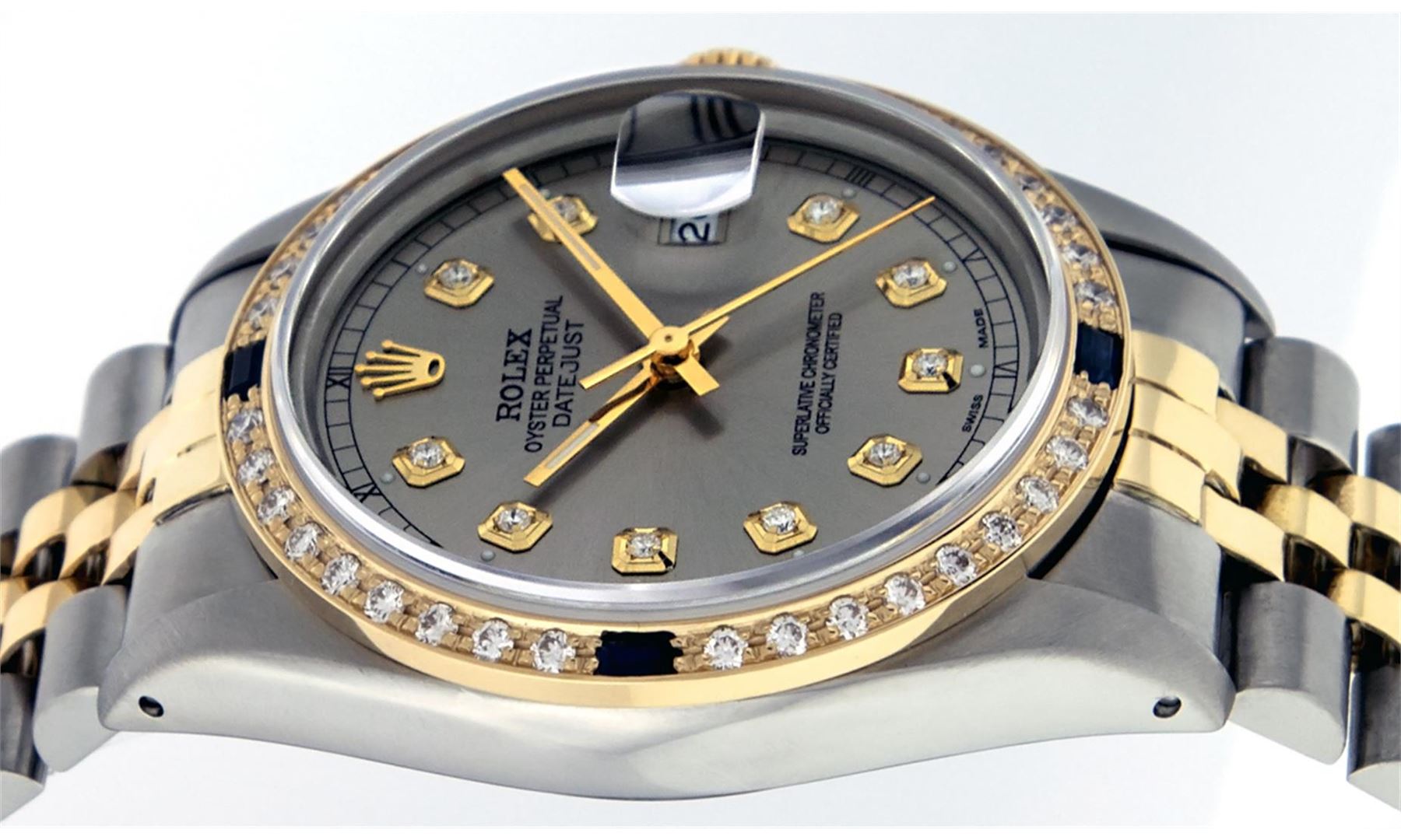 One Gents Two Tone Rolex Datejust Polished, Fully Serviced & Electronically Tested, 14K Yellow Gold & Stainless Steel Case:36mm, 14K Yellow Gold Crown, Custom Bezel: 18K Yellow Gold Sapphire Beadset Diamond Bezel, Diamond Count: 36 Diamonds + 4 Sapphires, Total Weight 1.0 Carat, Clarity: Si-VS, Color: G to H. Custom Crystal: Synthetic Sapphire Cyclops Lens. Movement: Automatic Winding Movement Caliber 3035. Custom Dial: Slate Grey Diamond Dial With Square Track and Luminescent Dots. Diamond Count: 10 Diamonds In Dial, Color: G to H, Clarity: SI-VS. Date Window: 3 O'Clock Position Date Display, Quickset, Model: Datejust Condition: G-6 Extra Fine. Bracelet: Two Tone 14K Yellow Gold & Stainless Steel Jubilee. Bright Polish. 6.5 Inch Length, Adjustable. Standard Clasp, With Rolex Logo.