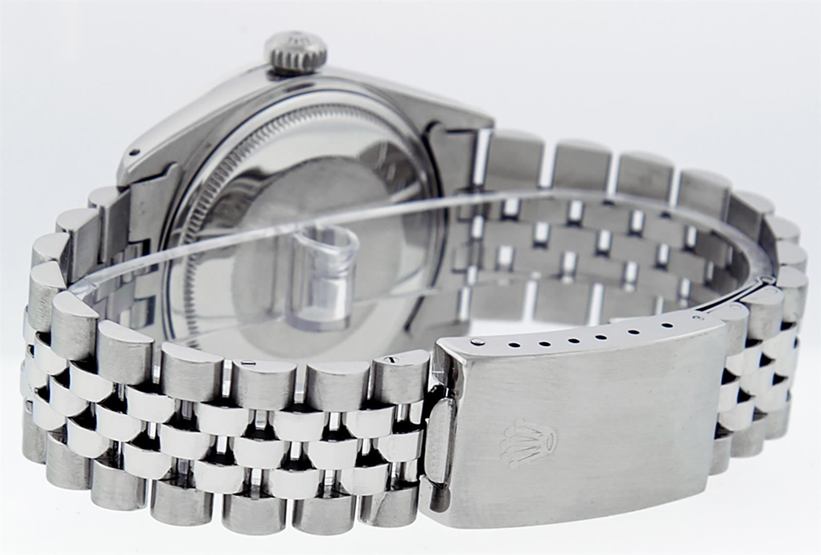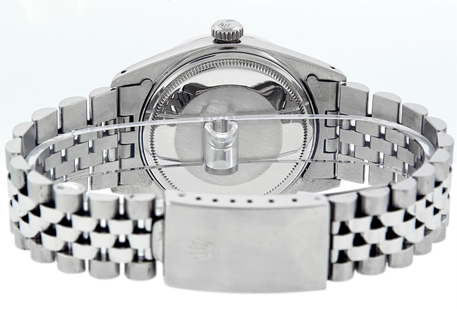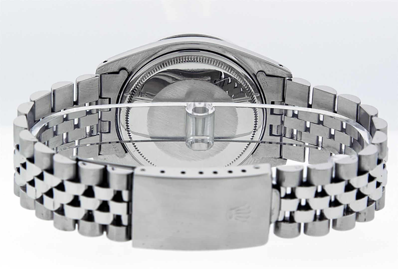 One Mens Pre Owned Stainless Steel Rolex Datejust Polished, Serviced & Electronically Tested, Rolex Stainless Steel Case: 36mm, Rolex Stainless Steel Crown, Custom Bezel: New 18K White Gold Ruby Bead set Diamond Bezel, Diamond + Gem Count: 36 Diamonds + 4
