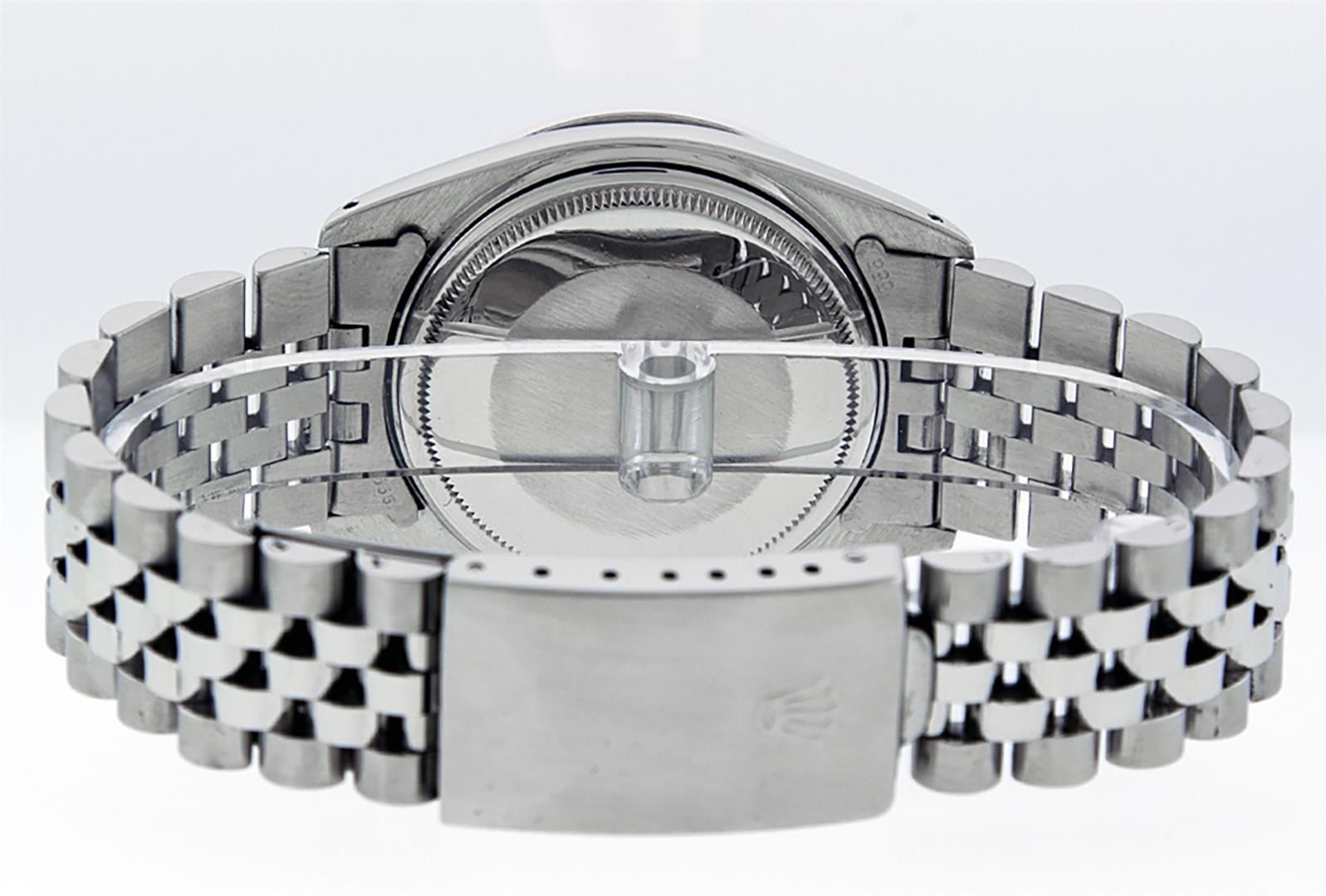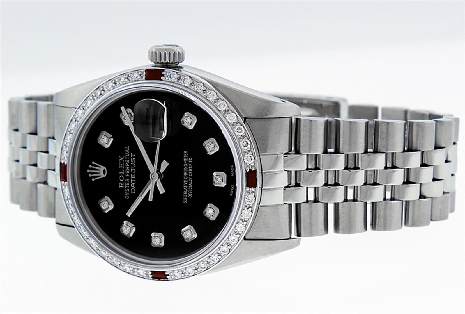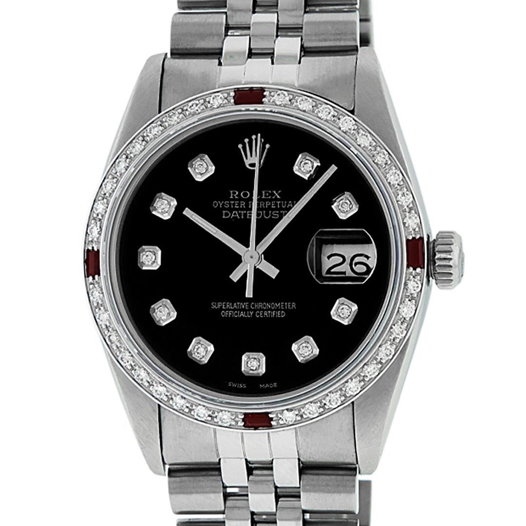 One Mens Pre Owned Stainless Steel Rolex Datejust Polished, Serviced & Electronically Tested, Rolex Stainless Steel Case: 36mm, Rolex Stainless Steel Crown, Custom Bezel: New 18K White Gold Ruby Bead set Diamond Bezel, Diamond + Gem Count: 36 Diamonds + 4 Rubies, Clarity: SI-VS, Color: G to H. Custom Crystal: New Sapphire With Date Window. Custom Hands: New Luminescent Hands. Rolex Movement: Automatic Winding Movement. Custom Dial: Refinished To Black With Custom Added Diamonds, 10 Diamonds in Dial, G To H In Color, Clarity: SI-VS. Date Window: 3 O'clock Position Date Display, Quickset, Model: Datejust. Condition: G-6 Extra Fine. Rolex Bracelet: Stainless Steel Jubilee Band. Bright Polish & Satin Finish. 7.0 Inch Length, Adjustable. Standard Clasp, With Rolex Logo. This Watch Has Been Serviced Time Tested And Is In Excellent Condition It Is Free Of All Scratches And Dents.