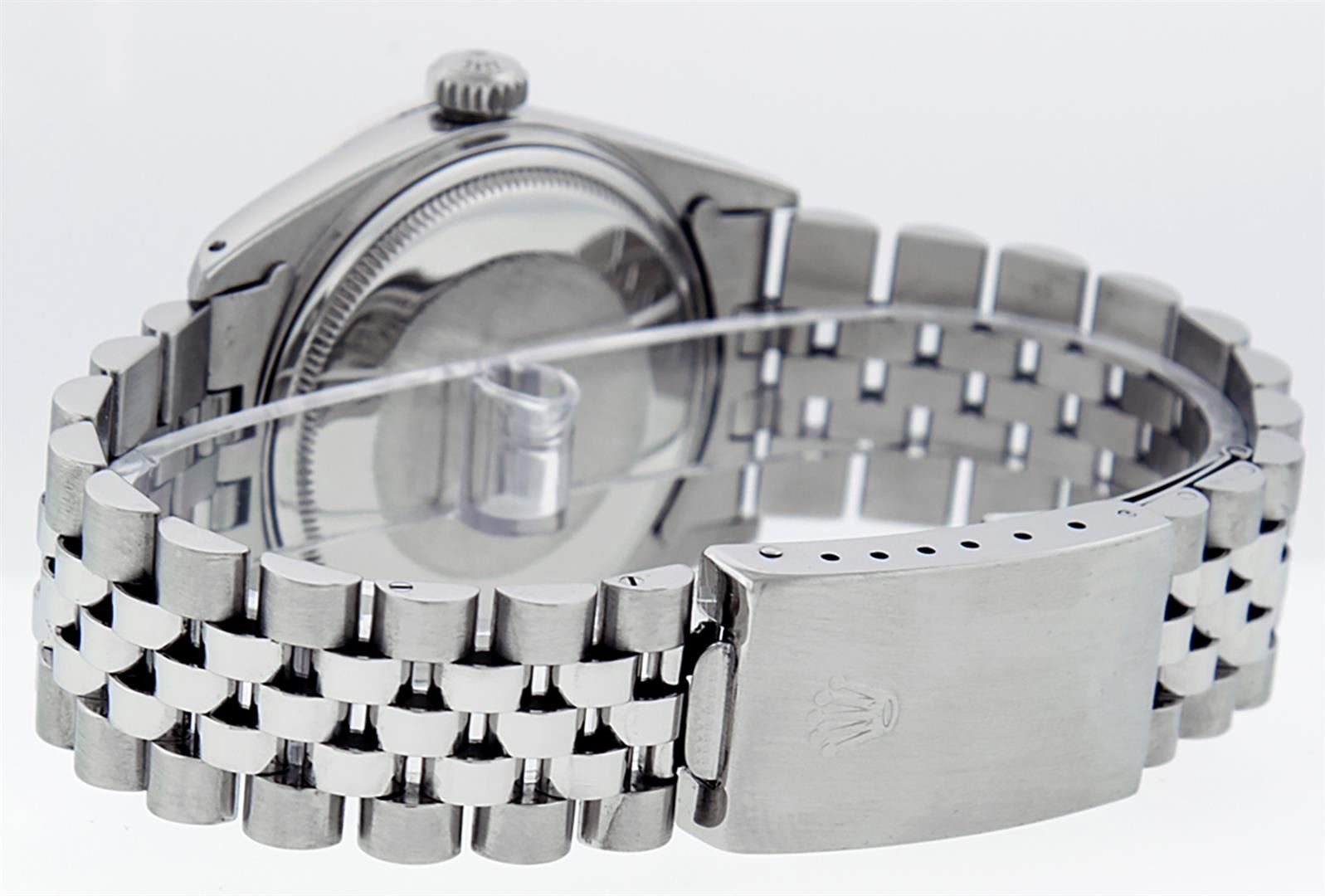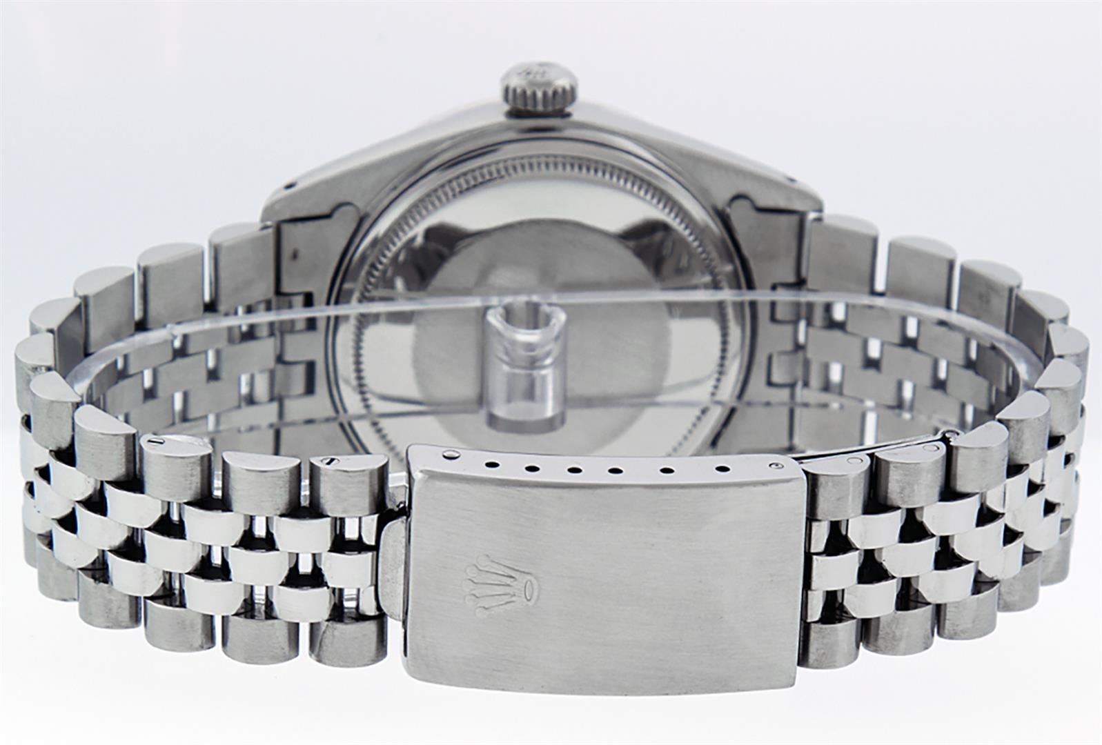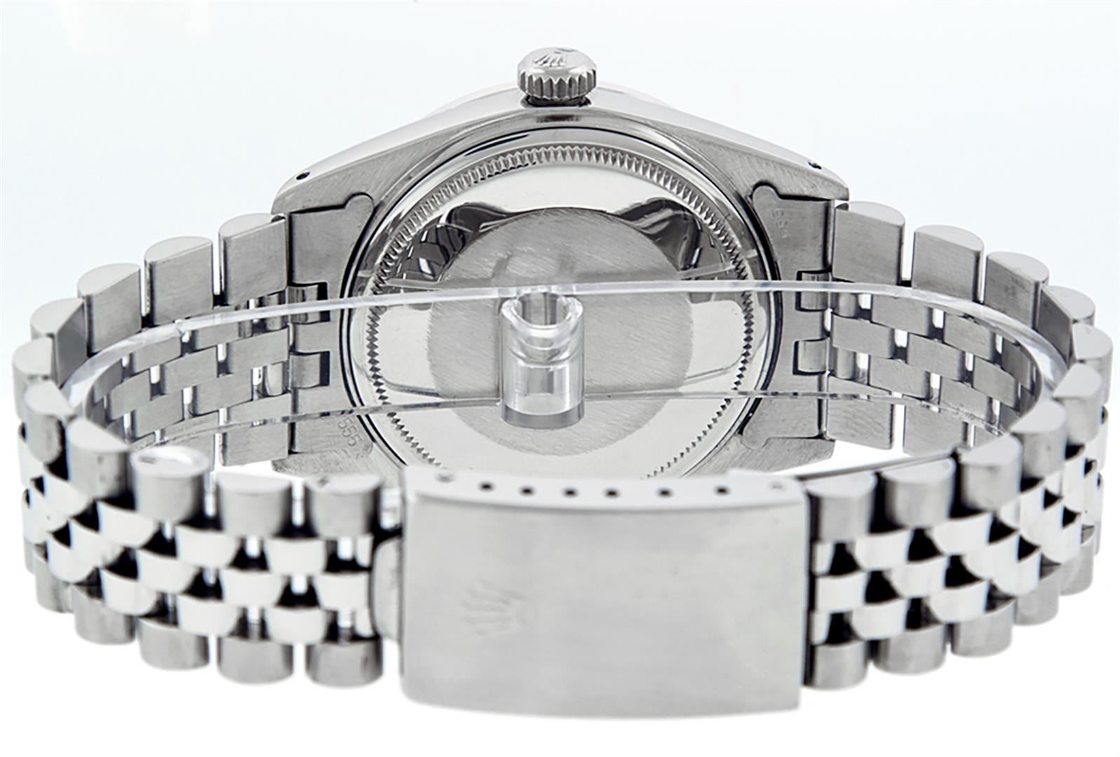 One Mens Pre Owned Stainless Steel Rolex Datejust Polished, Serviced & Electronically Tested, Rolex Stainless Steel Case: 36mm, Rolex Stainless Steel Crown, Custom Bezel: New 18K White Gold Ruby Bead set Diamond Bezel, Diamond + Gem Count: 36 Diamonds + 4 Rubies, Clarity: SI-VS, Color: G to H. Custom Crystal: New Sapphire With Date Window. Custom Hands: New Luminescent Hands. Rolex Movement: Automatic Winding Movement. Custom Dial: Refinished To Black With Custom Added Diamonds, 10 Diamonds in Dial, G To H In Color, Clarity: SI-VS. Date Window: 3 O'clock Position Date Display, Quickset, Model: Datejust. Condition: G-6 Extra Fine. Rolex Bracelet: Stainless Steel Jubilee Band. Bright Polish & Satin Finish. 7.0 Inch Length, Adjustable. Standard Clasp, With Rolex Logo. This Watch Has Been Serviced Time Tested And Is In Excellent Condition It Is Free Of All Scratches And Dents.