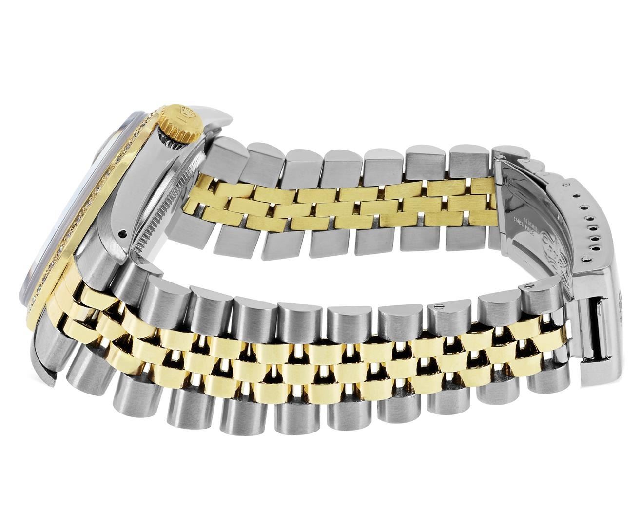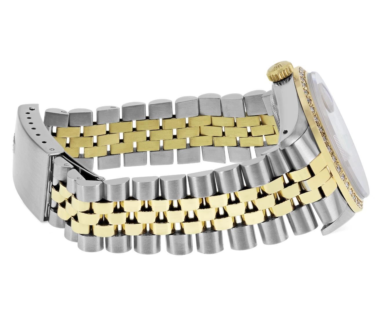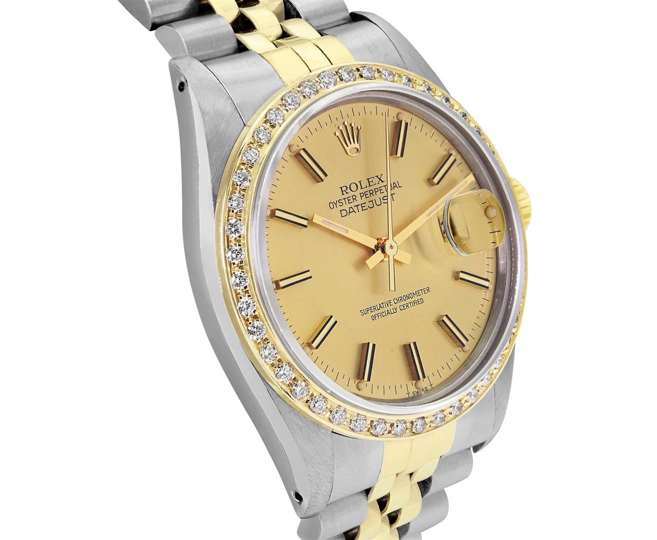 One Mens Pre Owned Yellow Gold And Steel Two Tone Rolex Datejust Polished, Serviced & Electronically Tested, Rolex Yellow Gold & Stainless Steel Case: 36mm, Rolex Yellow Gold Crown, Custom Bezel: New 18K Yellow Gold Beadset Diamond Bezel, Diamond Count: 44 Diamonds, Clarity: SI-VS, Color: G to H. Custom Crystal: New Sapphire With Magnified Date Window. Custom Hands: New Luminecent Hands. Rolex Movement: Automatic Winding Movement 3035. Rolex Dial: Champagne Dial With Index Hour Markers and Dash Track With Lumi Dots. Date Window: 3 O'Clock Position Date Display, Quickset, Model: Quickset Datejust. Condition: G-6 Extra Fine. Rolex Bracelet: Two Tone Yellow Gold & Stainless Steel Jubilee Band. Bright Polish. 7.0 Inch Length, Adjustable. Fold Clasp, With Rolex Logo. This Watch Has Been Serviced Time Tested And Is In Excellent Condition It Is Free Of All Scratches And Dents. This Watch Comes With A Rolex Box.