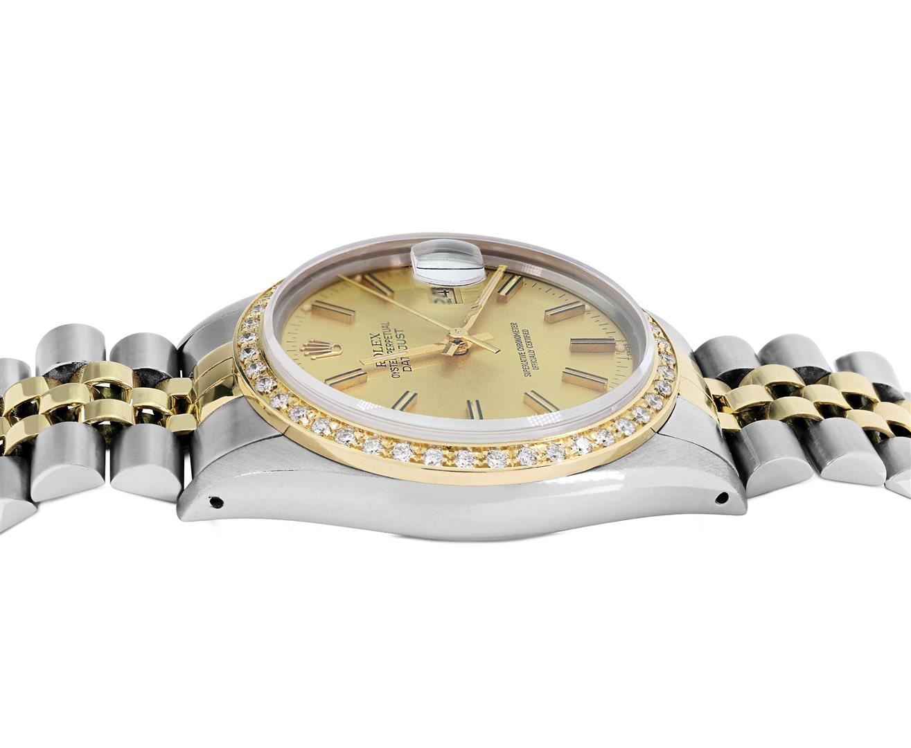 One Mens Pre Owned Yellow Gold And Steel Two Tone Rolex Datejust Polished, Serviced & Electronically Tested, Rolex Yellow Gold & Stainless Steel Case: 36mm, Rolex Yellow Gold Crown, Custom Bezel: New 18K Yellow Gold Beadset Diamond Bezel, Diamond Count: 44 Diamonds, Clarity: SI-VS, Color: G to H. Custom Crystal: New Sapphire With Magnified Date Window. Custom Hands: New Luminecent Hands. Rolex Movement: Automatic Winding Movement 3035. Rolex Dial: Champagne Dial With Index Hour Markers and Dash Track With Lumi Dots. Date Window: 3 O'Clock Position Date Display, Quickset, Model: Quickset Datejust. Condition: G-6 Extra Fine. Rolex Bracelet: Two Tone Yellow Gold & Stainless Steel Jubilee Band. Bright Polish. 7.0 Inch Length, Adjustable. Fold Clasp, With Rolex Logo. This Watch Has Been Serviced Time Tested And Is In Excellent Condition It Is Free Of All Scratches And Dents. This Watch Comes With A Rolex Box.