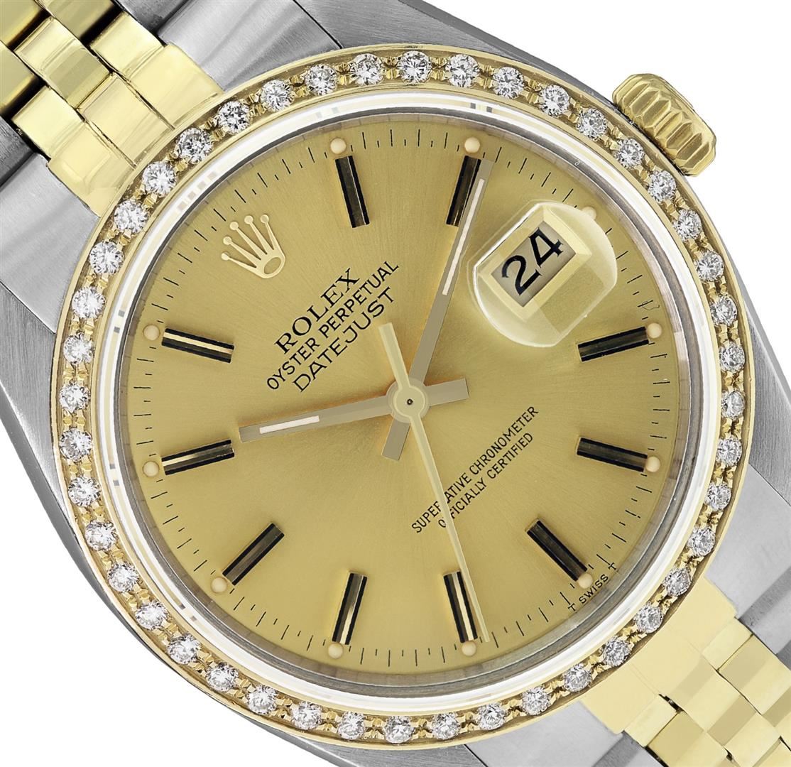 One Mens Pre Owned Yellow Gold And Steel Two Tone Rolex Datejust Polished, Serviced & Electronically Tested, Rolex Yellow Gold & Stainless Steel Case: 36mm, Rolex Yellow Gold Crown, Custom Bezel: New 18K Yellow Gold Beadset Diamond Bezel, Diamond Count: 44 Diamonds, Clarity: SI-VS, Color: G to H. Custom Crystal: New Sapphire With Magnified Date Window. Custom Hands: New Luminecent Hands. Rolex Movement: Automatic Winding Movement 3035. Rolex Dial: Champagne Dial With Index Hour Markers and Dash Track With Lumi Dots. Date Window: 3 O'Clock Position Date Display, Quickset, Model: Quickset Datejust. Condition: G-6 Extra Fine. Rolex Bracelet: Two Tone Yellow Gold & Stainless Steel Jubilee Band. Bright Polish. 7.0 Inch Length, Adjustable. Fold Clasp, With Rolex Logo. This Watch Has Been Serviced Time Tested And Is In Excellent Condition It Is Free Of All Scratches And Dents. This Watch Comes With A Rolex Box.