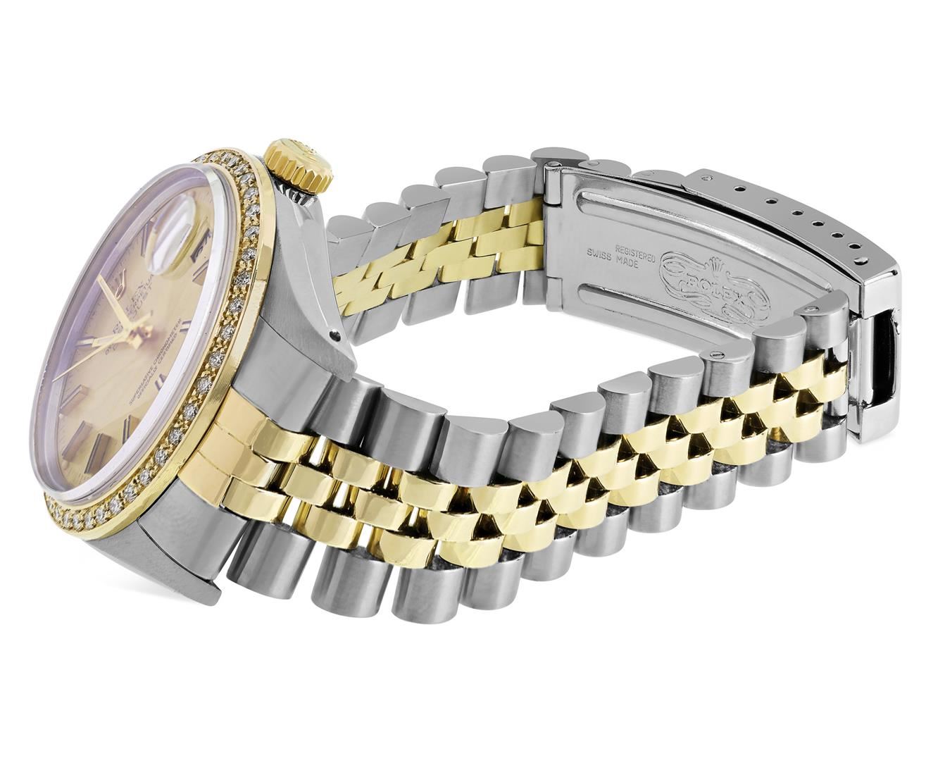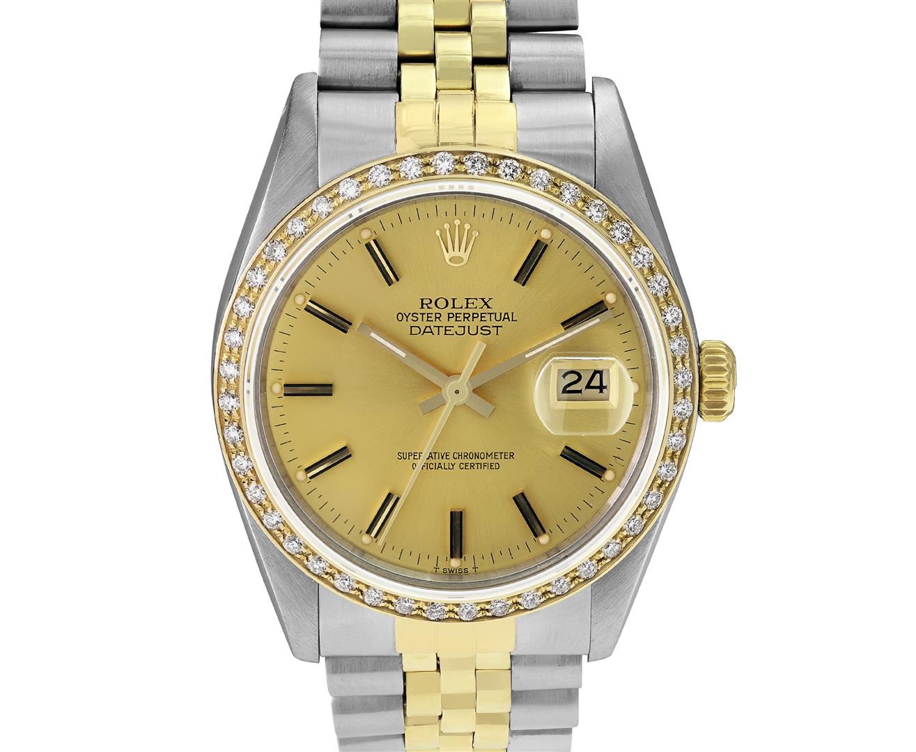 One Mens Pre Owned Yellow Gold And Steel Two Tone Rolex Datejust Polished, Serviced & Electronically Tested, Rolex Yellow Gold & Stainless Steel Case: 36mm, Rolex Yellow Gold Crown, Custom Bezel: New 18K Yellow Gold Beadset Diamond Bezel, Diamond Count: 44 Diamonds, Clarity: SI-VS, Color: G to H. Custom Crystal: New Sapphire With Magnified Date Window. Custom Hands: New Luminecent Hands. Rolex Movement: Automatic Winding Movement 3035. Rolex Dial: Champagne Dial With Index Hour Markers and Dash Track With Lumi Dots. Date Window: 3 O'Clock Position Date Display, Quickset, Model: Quickset Datejust. Condition: G-6 Extra Fine. Rolex Bracelet: Two Tone Yellow Gold & Stainless Steel Jubilee Band. Bright Polish. 7.0 Inch Length, Adjustable. Fold Clasp, With Rolex Logo. This Watch Has Been Serviced Time Tested And Is In Excellent Condition It Is Free Of All Scratches And Dents. This Watch Comes With A Rolex Box.