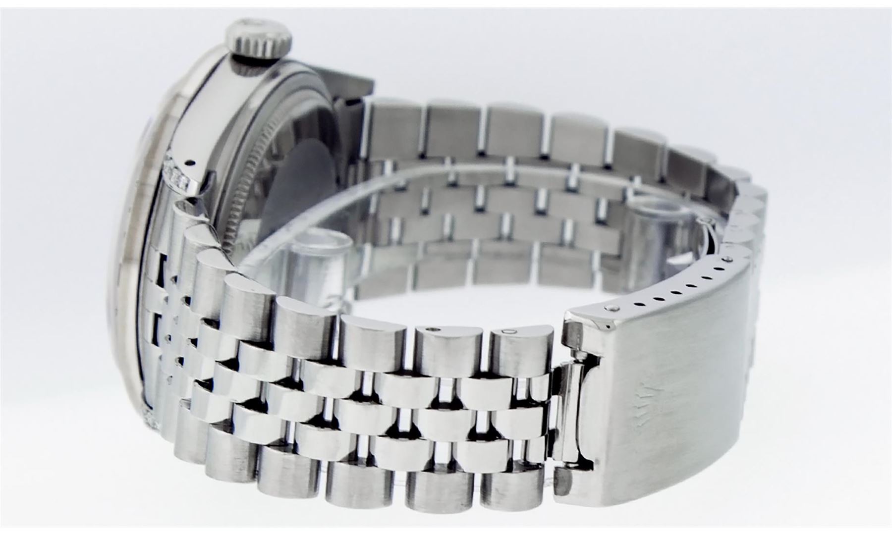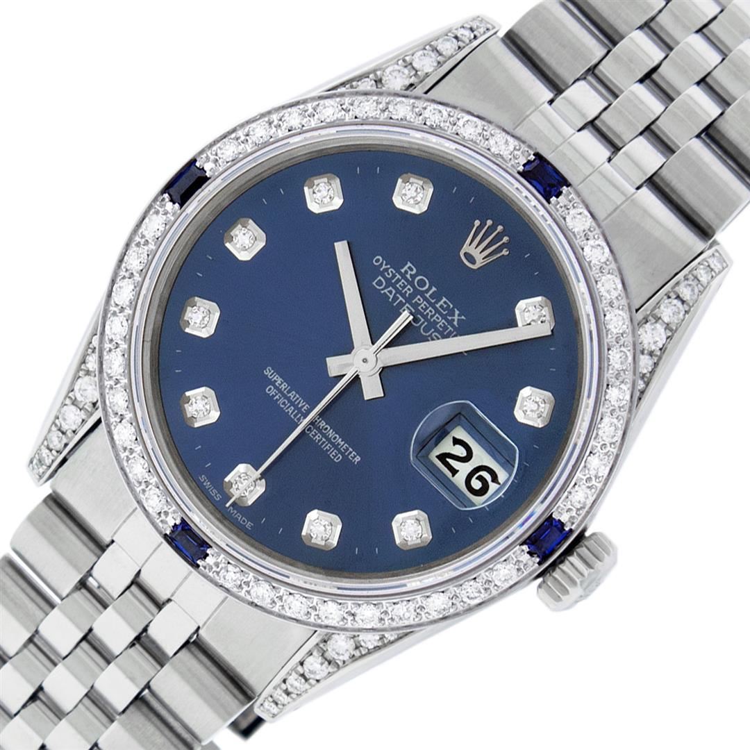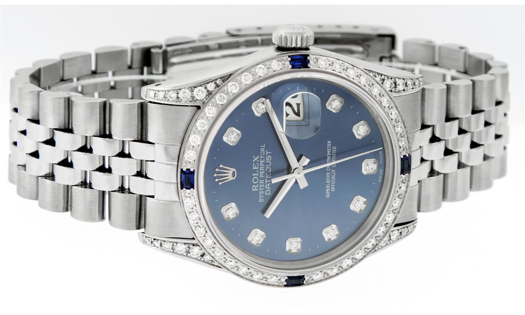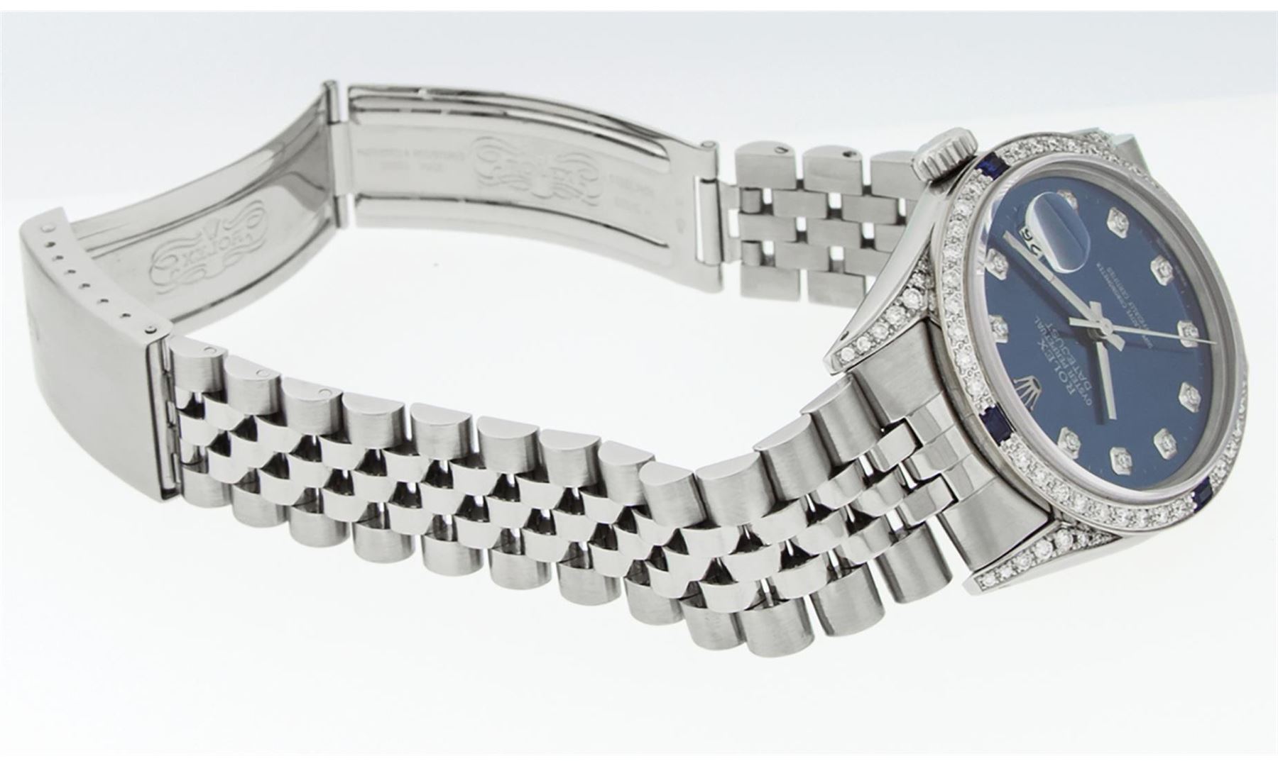 One Pre Owned Stainless Steel 36MM Rolex Datejust Polished Bright with Satin Finish, Serviced & Electronically Tested, Rolex Stainless Steel Case: 36mm, Custom Diamond Lugs: Custom Added 28 Diamonds On Lugs. Rolex Stainless Steel Crown, Custom Bezel: New 18K White Gold Diamond + Sapphire Beadset, Diamond Count: 36 Diamonds + 4 Sapphires. Custom Crystal: New Sapphire With Magnified Date Window. Custom Hands: New Luminescent Hands. Rolex Movement: Automatic Winding Movement 3035. Custom Dial: Custom Blue Dial With Added Diamonds, Stone Count: 10 Diamonds. Date Window: 3 O'Clock Position Date Display, Quickset, Model: Quickset Datejust Condition: G-6 Extra Fine. Rolex Bracelet: Stainless Steel Jubilee Band. Bright Polish & Satin Finish. 7.0 Inch Length, Adjustable. Fold Clasp, With Rolex Logo. This Watch Has Been Serviced And Polished And Its Free Of All Dents And Scratches.
