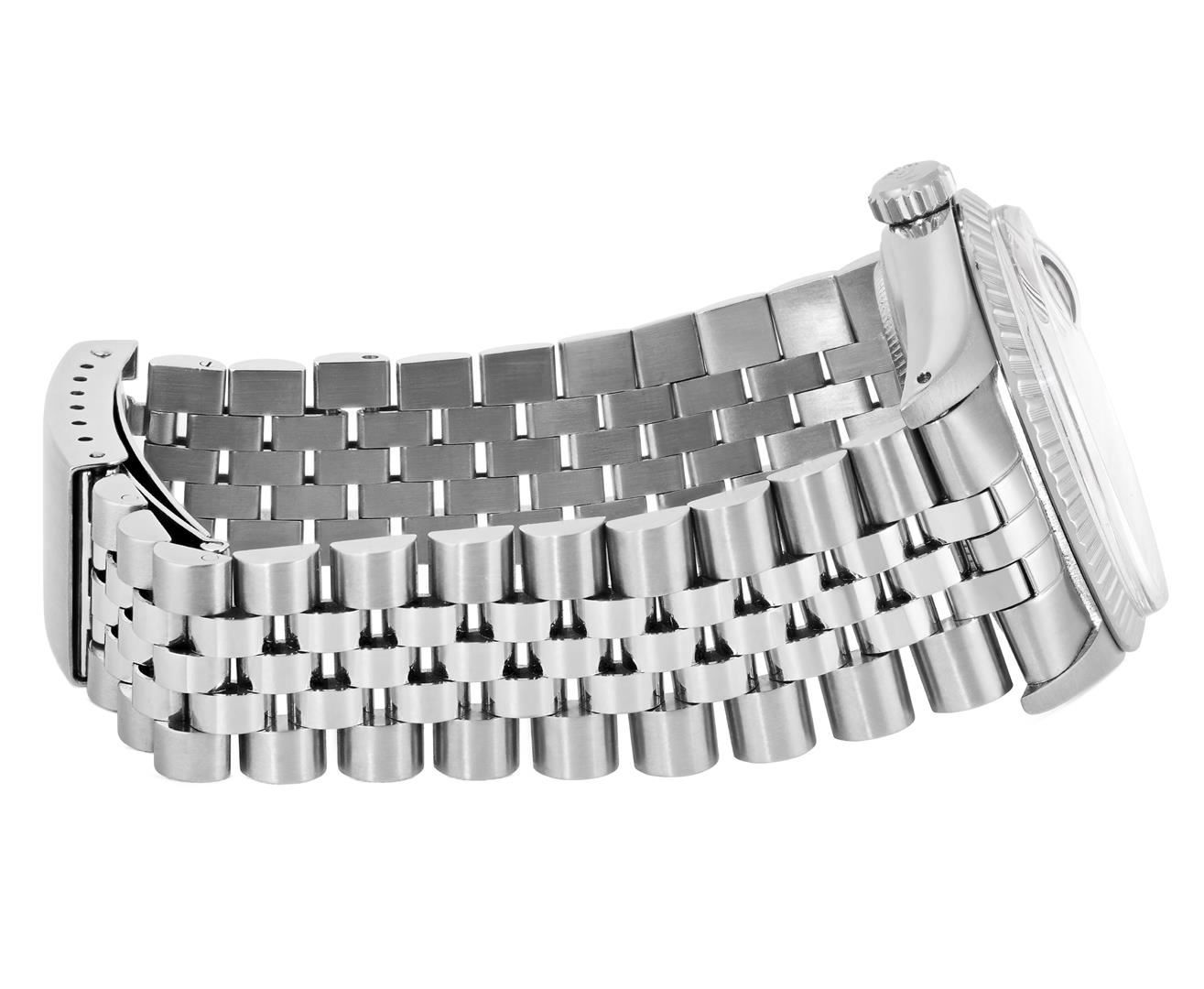 One Mens Pre Owned Rolex Stainless Steel Datejust Polished Bright with Satin Finish, Serviced & Electronically Tested, Rolex Stainless Steel Case: 36mm, Rolex Stainless Steel Crown, Rolex Bezel: Rolex Stainless Steel Engine Turn Bezel. Custom Crystal: New