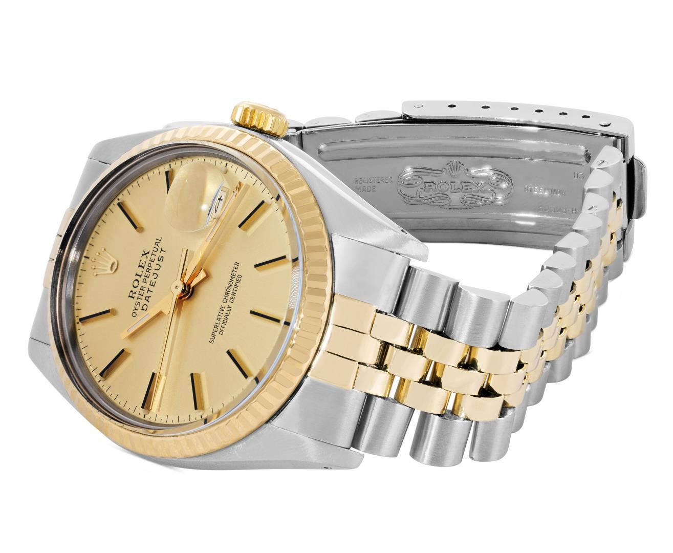 One Mens Pre Owned Yellow Gold Two Tone Rolex Datejust Polished, Serviced And Electronically Tested, Rolex Yellow Gold And Stainless Steel Case: 36mm, Rolex Yellow Gold Crown, Rolex Bezel: Yellow Gold Fluted Bezel. Custom Crystal: New Plastic With Magnified Date Window. Custom Hands: New Luminecent Hands. Rolex Movement: Automatic Winding Movement. Rolex Dial: Champagne Dial With Index Hour Markers and Dash Track With Lumi Dots. Date Window: 3 O'Clock Position Date Display, Quickset, Model: Datejust. Condition: G-6 Extra Fine. Rolex Bracelet: Two Tone Yellow Gold And Stainless Steel Jubilee Band. Bright Polish. 7.0 Inch Length, Adjustable. Standard Clasp, With Rolex Logo. This Watch Has Been Serviced Time Tested And Is In Excellent Condition It Is Free Of All Scratches And Dents. This Watch Comes With A Rolex Box.