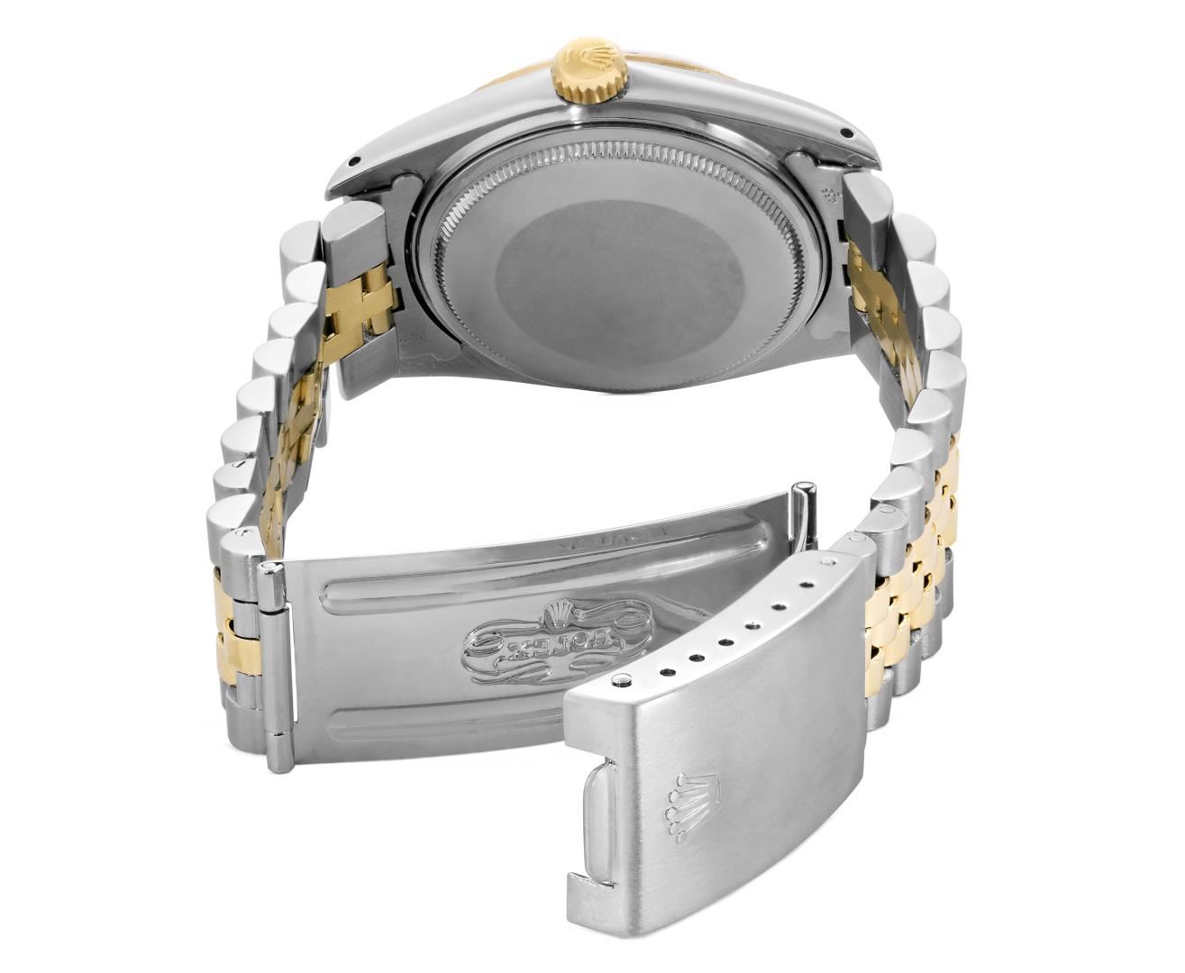 One Mens Pre Owned Yellow Gold Two Tone Rolex Datejust Polished, Serviced And Electronically Tested, Rolex Yellow Gold And Stainless Steel Case: 36mm, Rolex Yellow Gold Crown, Rolex Bezel: Yellow Gold Fluted Bezel. Custom Crystal: New Plastic With Magnified Date Window. Custom Hands: New Luminecent Hands. Rolex Movement: Automatic Winding Movement. Rolex Dial: Champagne Dial With Index Hour Markers and Dash Track With Lumi Dots. Date Window: 3 O'Clock Position Date Display, Quickset, Model: Datejust. Condition: G-6 Extra Fine. Rolex Bracelet: Two Tone Yellow Gold And Stainless Steel Jubilee Band. Bright Polish. 7.0 Inch Length, Adjustable. Standard Clasp, With Rolex Logo. This Watch Has Been Serviced Time Tested And Is In Excellent Condition It Is Free Of All Scratches And Dents. This Watch Comes With A Rolex Box.