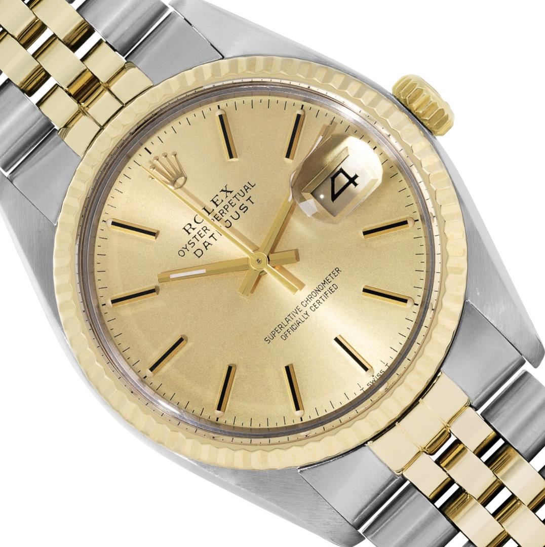 One Mens Pre Owned Yellow Gold Two Tone Rolex Datejust Polished, Serviced And Electronically Tested, Rolex Yellow Gold And Stainless Steel Case: 36mm, Rolex Yellow Gold Crown, Rolex Bezel: Yellow Gold Fluted Bezel. Custom Crystal: New Plastic With Magnified Date Window. Custom Hands: New Luminecent Hands. Rolex Movement: Automatic Winding Movement. Rolex Dial: Champagne Dial With Index Hour Markers and Dash Track With Lumi Dots. Date Window: 3 O'Clock Position Date Display, Quickset, Model: Datejust. Condition: G-6 Extra Fine. Rolex Bracelet: Two Tone Yellow Gold And Stainless Steel Jubilee Band. Bright Polish. 7.0 Inch Length, Adjustable. Standard Clasp, With Rolex Logo. This Watch Has Been Serviced Time Tested And Is In Excellent Condition It Is Free Of All Scratches And Dents. This Watch Comes With A Rolex Box.