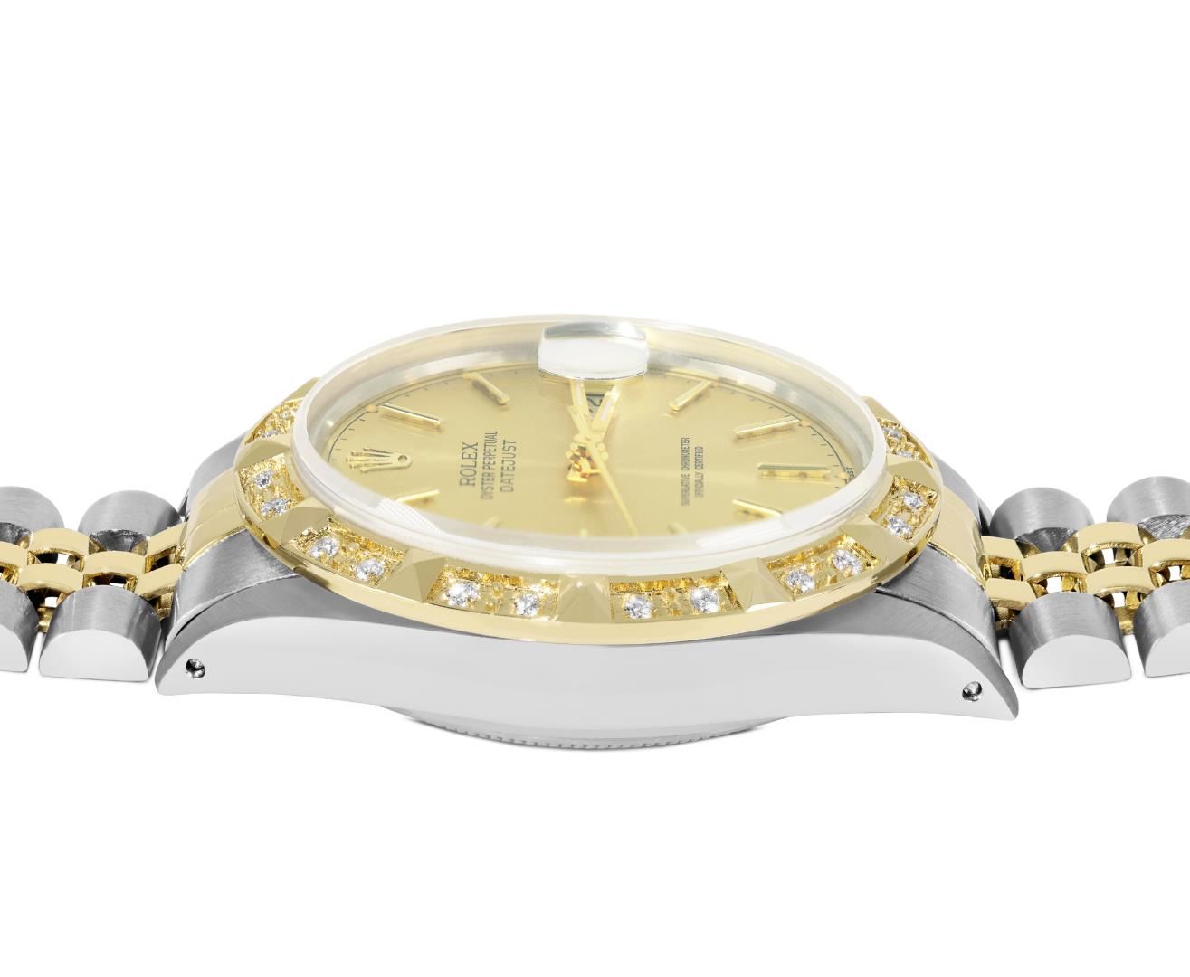 One Mens Pre Owned Yellow Gold Two Tone Rolex Datejust Polished, Serviced And Electronically Tested, Rolex Yellow Gold And Stainless Steel Case: 36mm, Rolex Yellow Gold Crown, Custom Bezel: New 18K Yellow Gold Pyramid Diamond Bezel, Diamond Count: 24 Diam