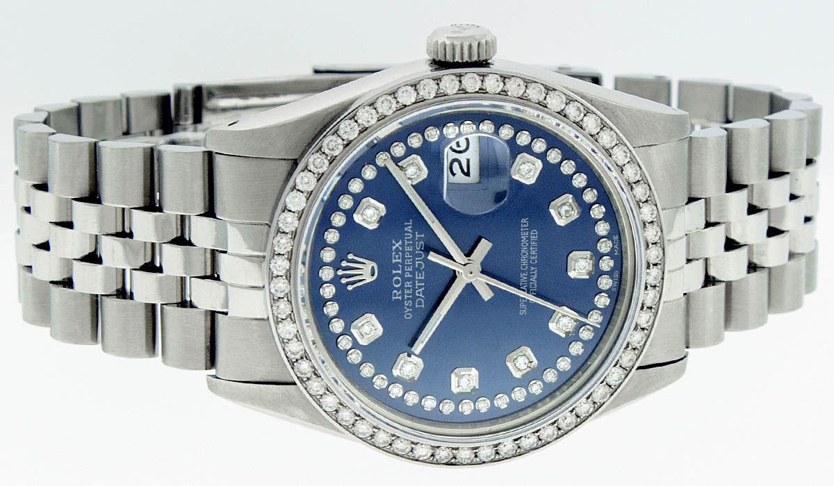 One Mens Rolex Datejust Polished Bright with Satin Finish, Serviced & Electronically Tested, Stainless Steel Case:36mm, Stainless Steel Crown, Custom Bezel: Stainless Steel Beadset Diamond Bezel, Diamond Count: 54 Diamonds Total Weight 1.00 Carat, Clarity: SI-VS, Color: G to H. Custom Crystal: Synthetic Sapphire Cyclops Lens. Movement: Automatic Winding Movement Caliber 3035. Custom Dial: Blue String Diamond Dial, Diamond Count: 58 Diamonds In Dial, Color: G to H, Clarity: VS2-SI1. Date Window: 3 O'Clock Position Date Display, Quickset, Model: Datejust. Condition: G-6 Extra Fine. Bracelet:Stainless Steel Jubilee Band. Bright Polish & Satin Finish. 7.0 Inch Length, Adjustable. Standard Clasp, With Rolex Logo. This watch has been serviced time tested and is in excellent condition it is free of all scratches and dents.