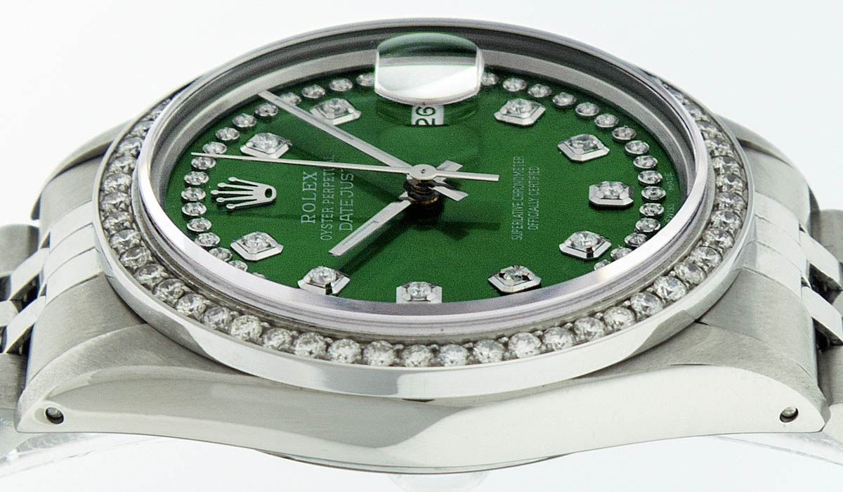 One Mens Rolex Datejust Polished Bright with Satin Finish, Serviced & Electronically Tested, Stainless Steel Case:36mm, Stainless Steel Crown, Custom Bezel: Stainless Steel Beadset Diamond Bezel, Diamond Count: 54 Diamonds Total Weight 1.00 Carat, Clarity: SI-VS, Color: G to H. Custom Crystal: Synthetic Sapphire Cyclops Lens. Movement: Automatic Winding Movement Caliber 3035. Custom Dial: Green String Diamond Dial, Diamond Count: 58 Diamonds In Dial, Color: G to H, Clarity: VS2-SI1. Date Window: 3 O'Clock Position Date Display, Quickset, Model: Datejust. Condition: G-6 Extra Fine. Bracelet:Stainless Steel Jubilee Band. Bright Polish & Satin Finish. 7.0 Inch Length, Adjustable. Standard Clasp, With Rolex Logo. This watch has been serviced time tested and is in excellent condition it is free of all scratches and dents.