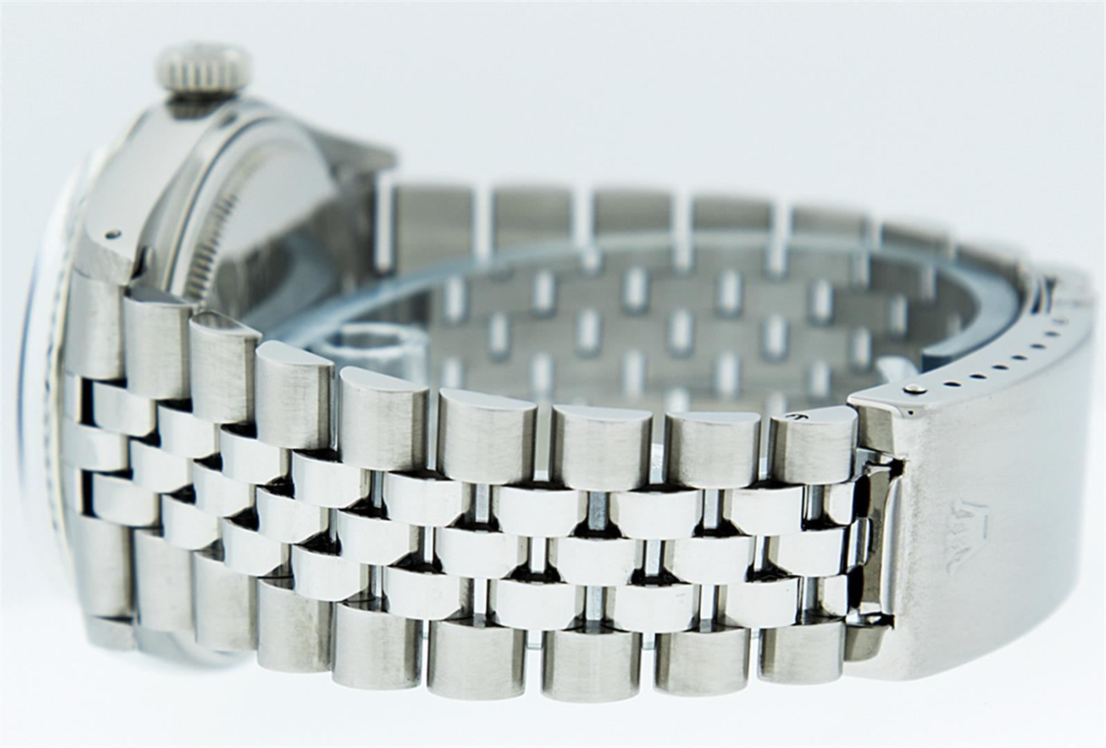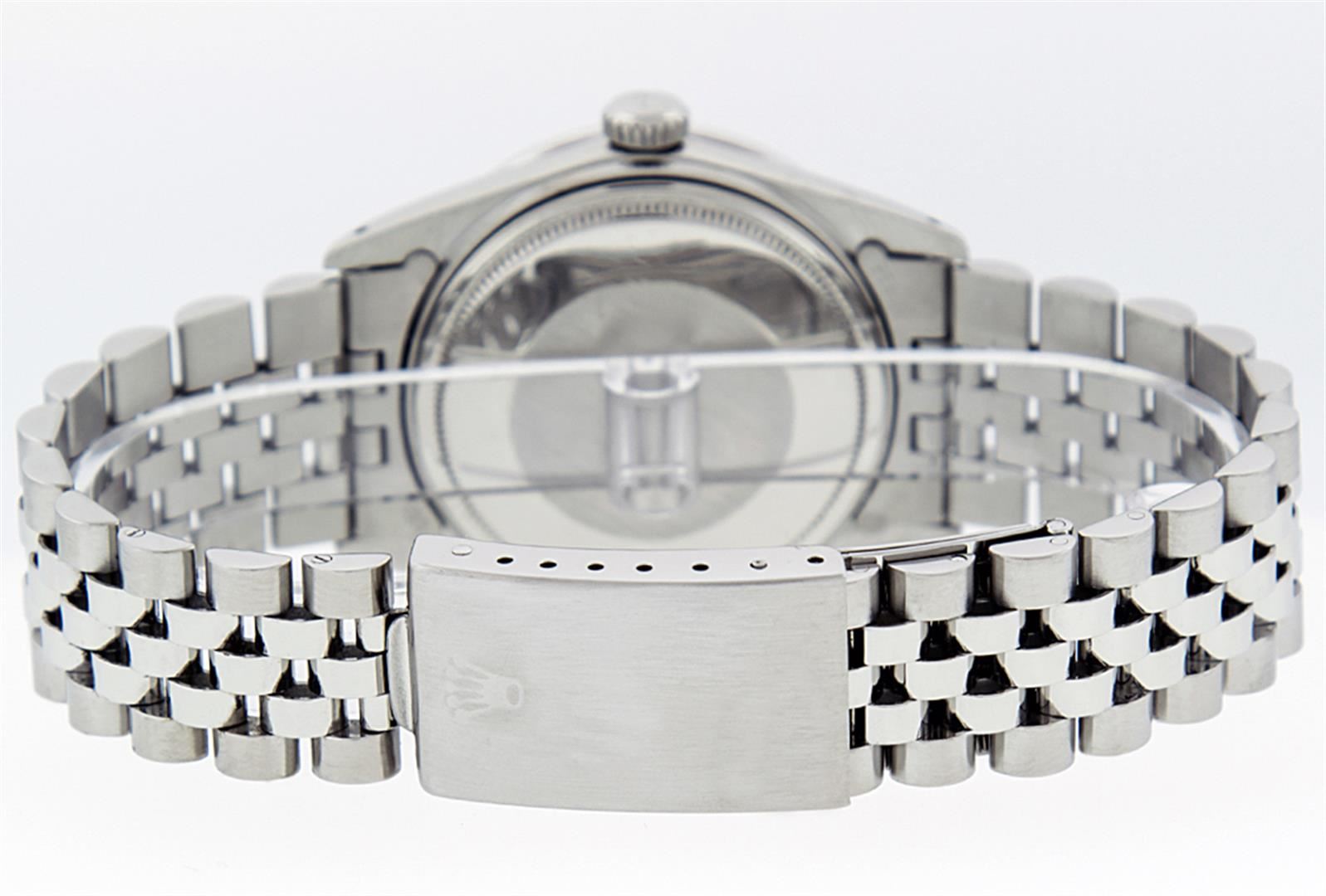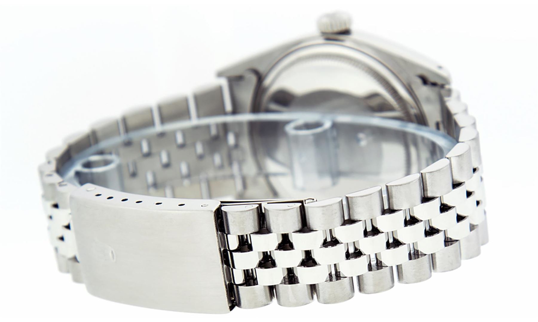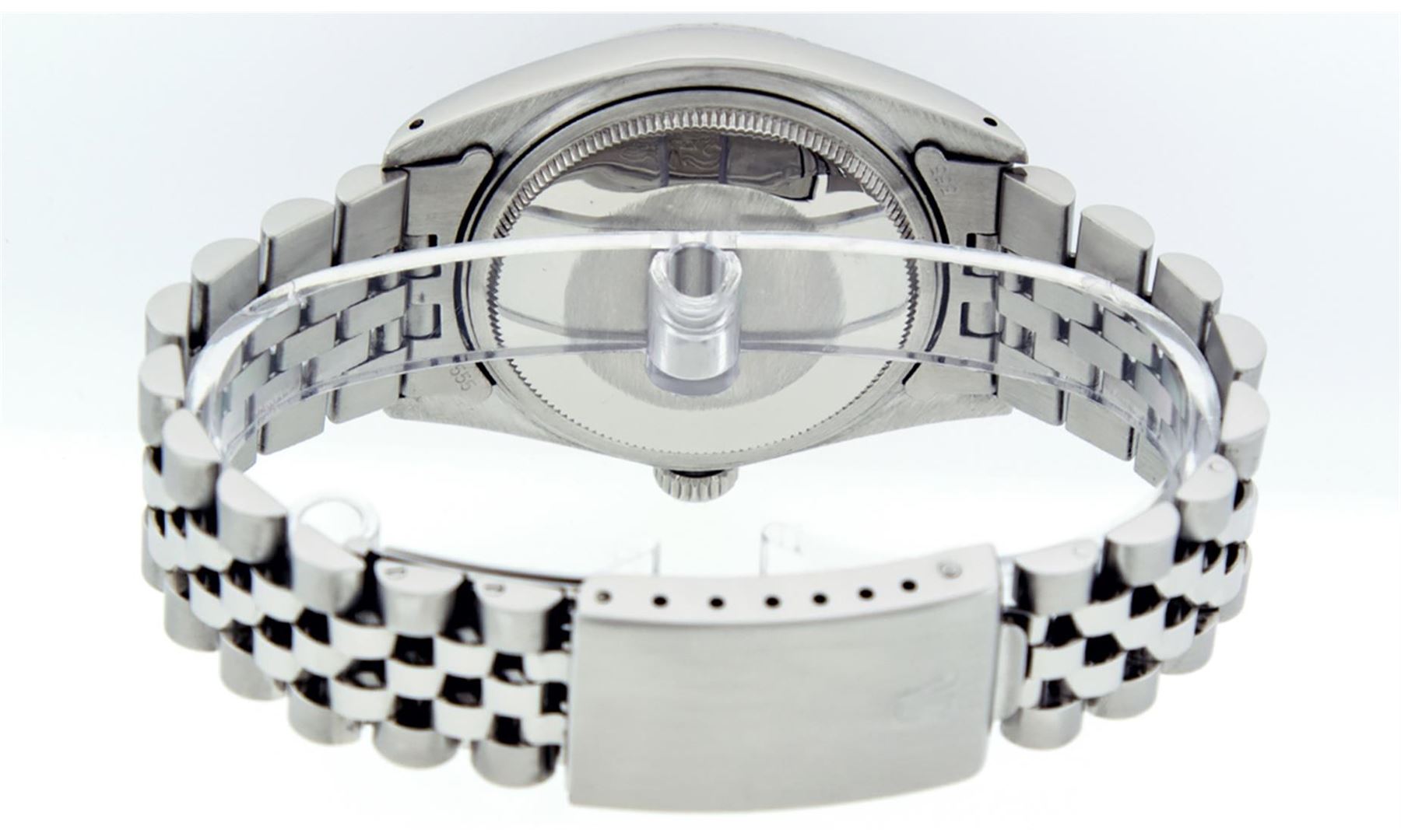 One Gents Rolex Datejust Polished Bright with Satin Finish, Serviced & Electronically Tested, Stainless Steel Case:36mm, Stainless Steel Crown, Original Bezel: 14K White Gold Fluted Bezel. Custom Crystal: Acrylic Cyclops Lens. Movement: Automatic Winding Movement Caliber 3035. Custom Dial: Mother Of Pearl Emerald String Diamond Dial, Stone Count: 10 Emeralds + 48 Diamond in Dial G To H In Color, SI-VS Clarity. Date Window: 3 O'Clock Position Date Display, Quickset, Model: Datejust, Condition: G-6 Extra Fine. Bracelet: Stainless Steel Jubilee. Bright Polish & Satin Finish. 7.0 Inch Length, Adjustable. Standard Clasp, With Rolex Logo.