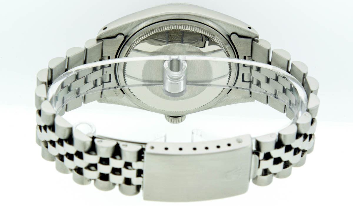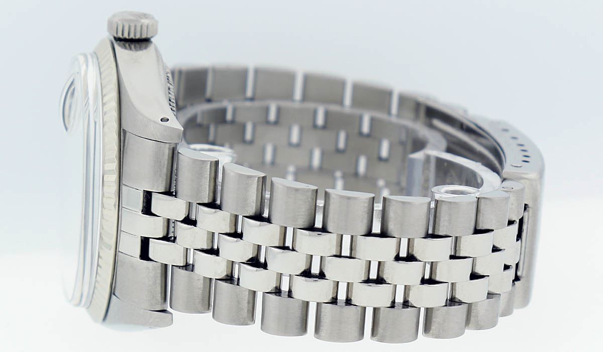 One Gents Rolex Datejust Polished Bright with Satin Finish, Serviced & Electronically Tested, Stainless Steel Case:36mm, Stainless Steel Crown, Bezel: 14K White Gold Fluted Bezel. Custom Crystal: Acrylic Cyclops Lens. Movement: Automatic Winding Movement Caliber 3035. Custom Dial: Mother Of Pearl Ruby String Diamond Dial, Stone Count: 10 Rubies + 48 Diamond in Dial G To H In Color, Si-VS Clarity. Date Window: 3 O'Clock Position Date Display, Quickset, Model: Datejust, Condition: G-6 Extra Fine. Bracelet:Stainless Steel Jubilee. Bright Polish & Satin Finish. 7.0 Inch Length, Adjustable. Standard Clasp, With Rolex Logo.
