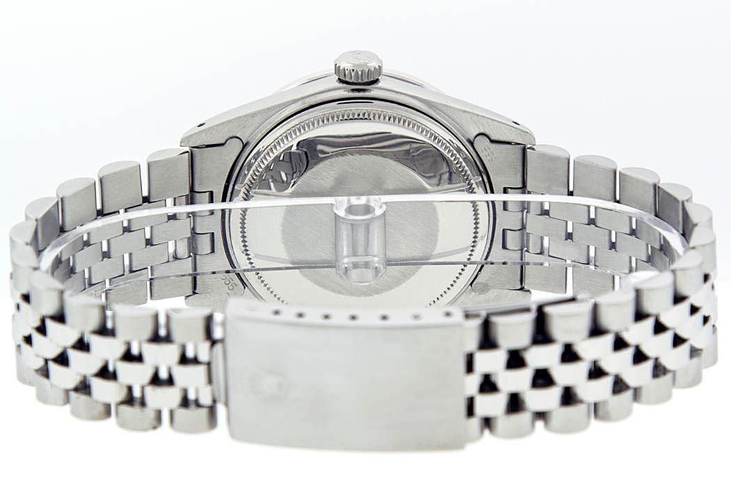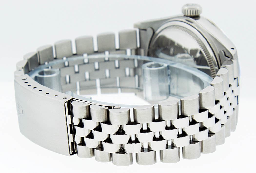 One Gents Rolex Datejust Polished Bright with Satin Finish, Serviced & Electronically Tested, Stainless Steel Case:36mm, Stainless Steel Crown, Bezel: 14K White Gold Fluted Bezel. Custom Crystal: Acrylic Cyclops Lens. Movement: Automatic Winding Movement Caliber 3035. Custom Dial: Mother Of Pearl Ruby String Diamond Dial, Stone Count: 10 Rubies + 48 Diamond in Dial G To H In Color, Si-VS Clarity. Date Window: 3 O'Clock Position Date Display, Quickset, Model: Datejust, Condition: G-6 Extra Fine. Bracelet:Stainless Steel Jubilee. Bright Polish & Satin Finish. 7.0 Inch Length, Adjustable. Standard Clasp, With Rolex Logo.